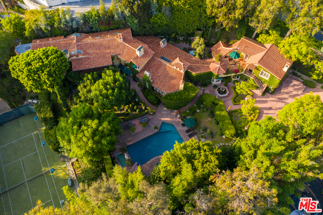 Available for the first time in over 45 years, this private enclave is nestled on over 1 acre of verdant grounds within the city limits of Beverly Hills. As the gate closes behind you, enter a secluded resort hideaway and leave the world behind. A true sanctuary offering privacy and seclusion that is so rare today. The magnificent residence has been lovingly maintained by the current owner. Beamed vaulted ceilings and a flowing layout offer endless possibilities. Nearly every room opens out to lush gardens, terraces and rolling lawns. Multiple grand entertaining spaces including formal living room, dining room and library. 7 bedrooms total including 3 bedrooms downstairs and maids room off the kitchen. A separate guest suite above the garage has its own entrance. Upstairs, the splendid master suite features his and her baths and a private terrace. Completing the spectacular grounds are a lovely pool and lighted N/S tennis court, all totally private and secure in a superb location.