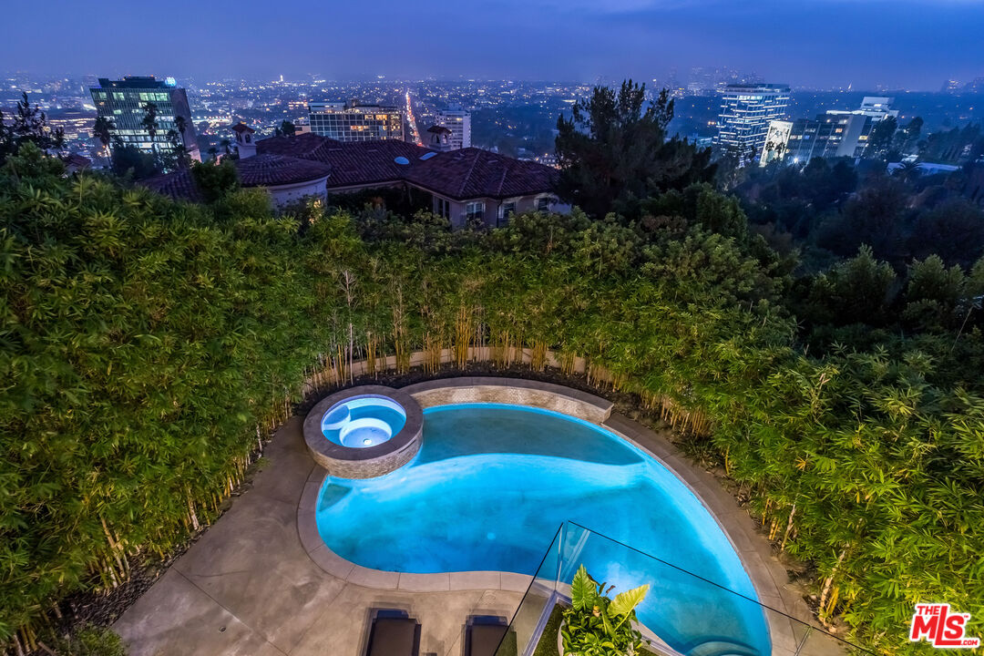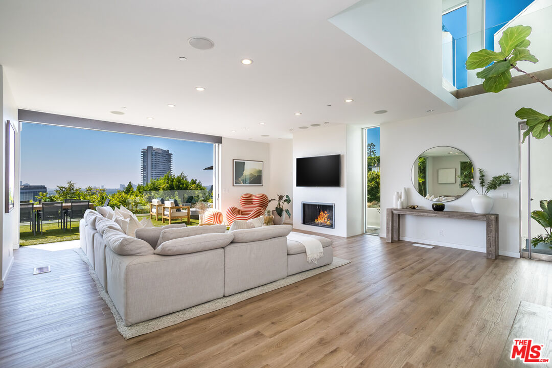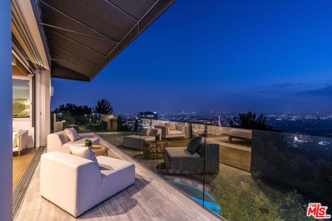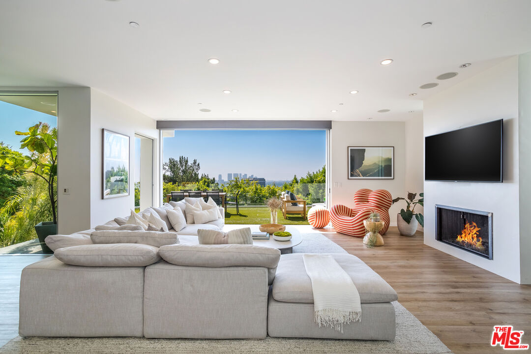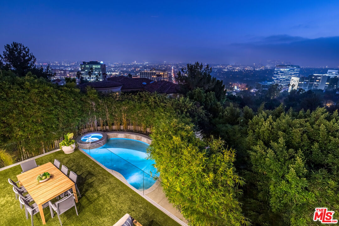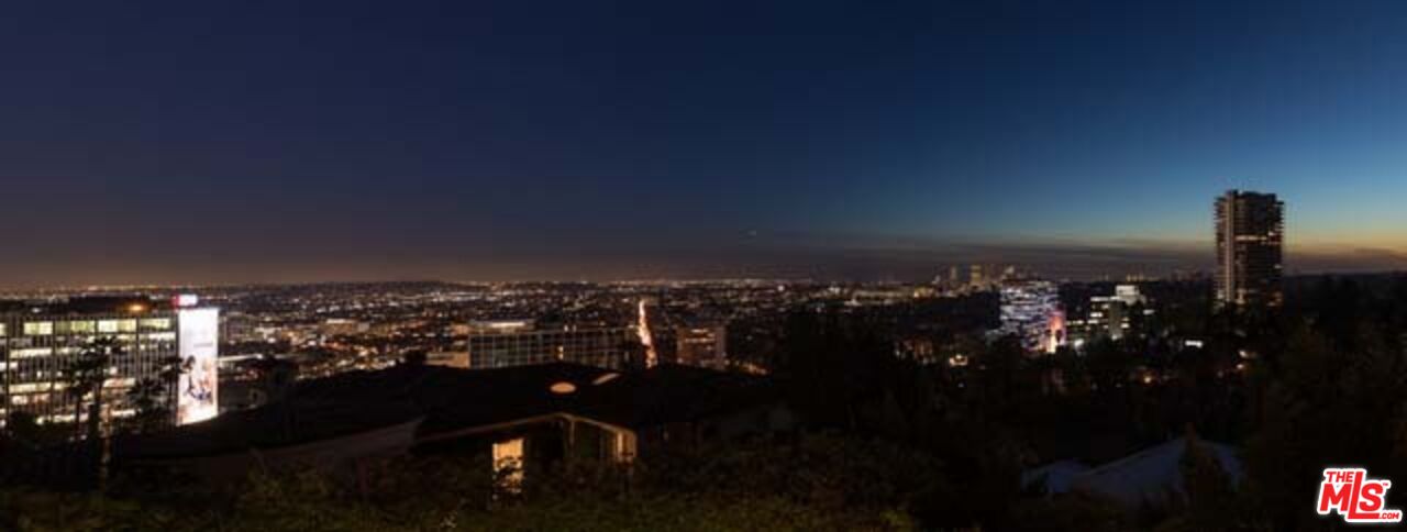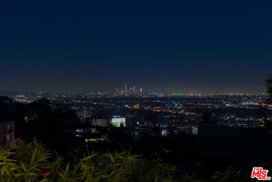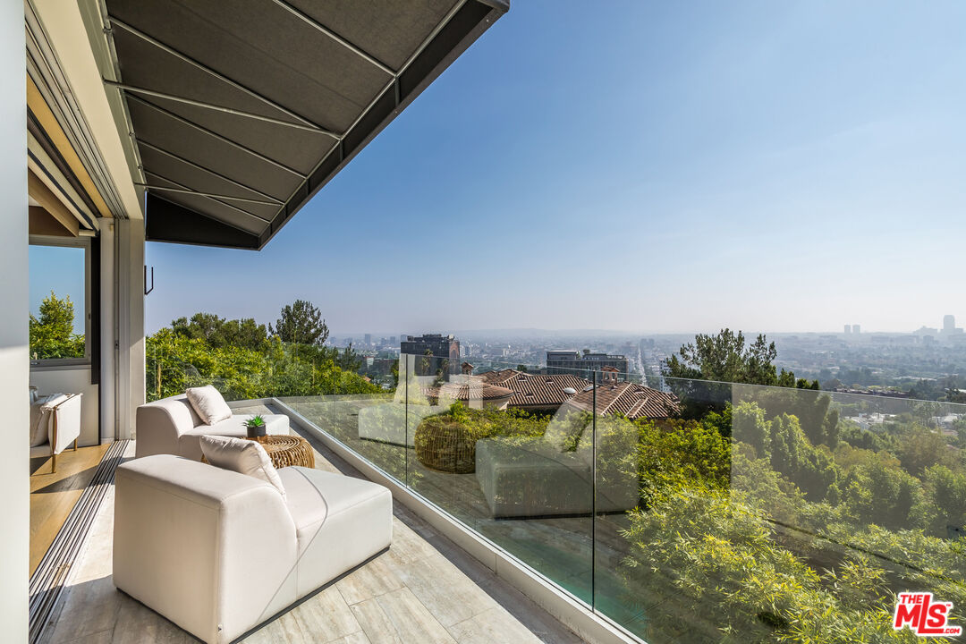 Located behind private gates above the Sunset Strip, this Modern home boasts spectacular panoramic views from Downtown to the ocean. The main level features an open floor plan with soaring ceilings and hardwood flooring throughout. The living area with a fireplace and disappearing walls of glass opens up to a grassy terrace with expansive views. The gourmet kitchen comes replete with sleek white cabinetry, grey stone countertops, a large center island, and top-of-the-line appliances. Upstairs, the luxurious owner's suite offers breathtaking jetliner views, a private balcony, a walk-in closet, and a spa-like bathroom with dual vanity, sumptuous tile work, a large infinity-edge tub, and a walk-in shower with more panoramic views. All additional spacious guest bedrooms each include an exquisite ensuite bathroom. The backyard is a private oasis, with a sparkling pool and hot tub surrounded by mature greenery and an impressive cabana with a sitting area, bar, and bathroom, perfect for entertaining. Other amenities include a home theater, gym, office, and a large private terrace upstairs with plenty of room and head-on views of the downtown LA skyline. A large 2-car garage and a long private driveway with motor court/additional parking. Only minutes away from the best dining and shopping West Hollywood has to offer.