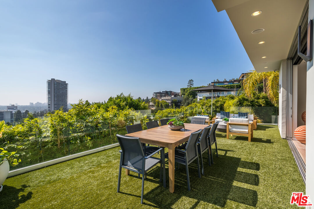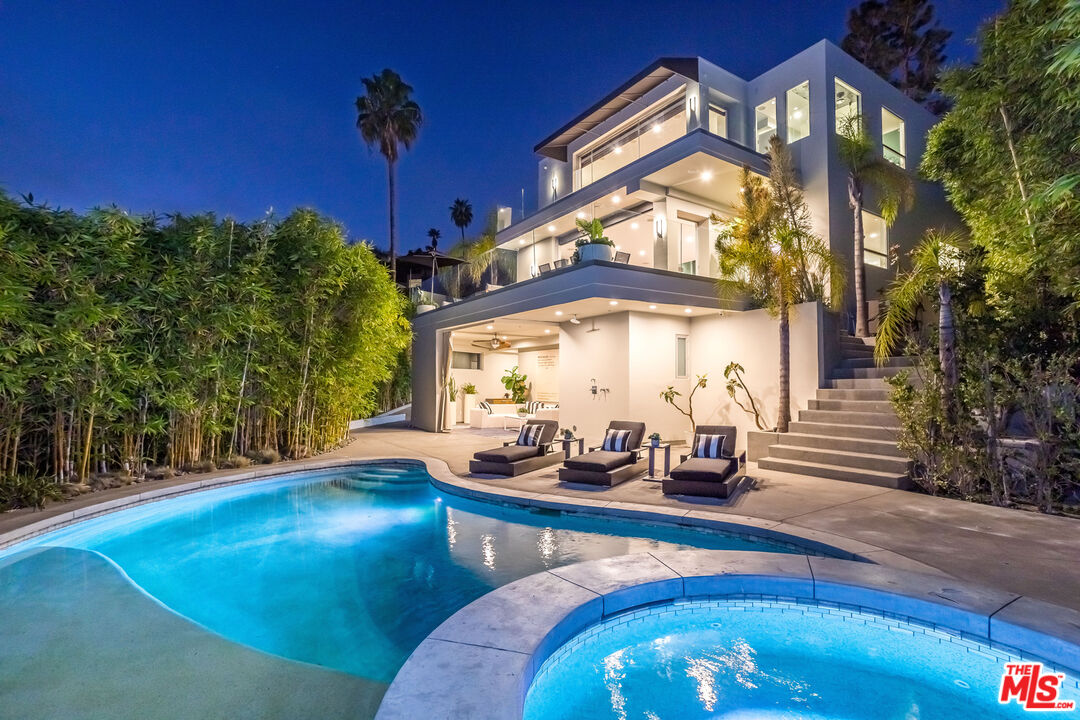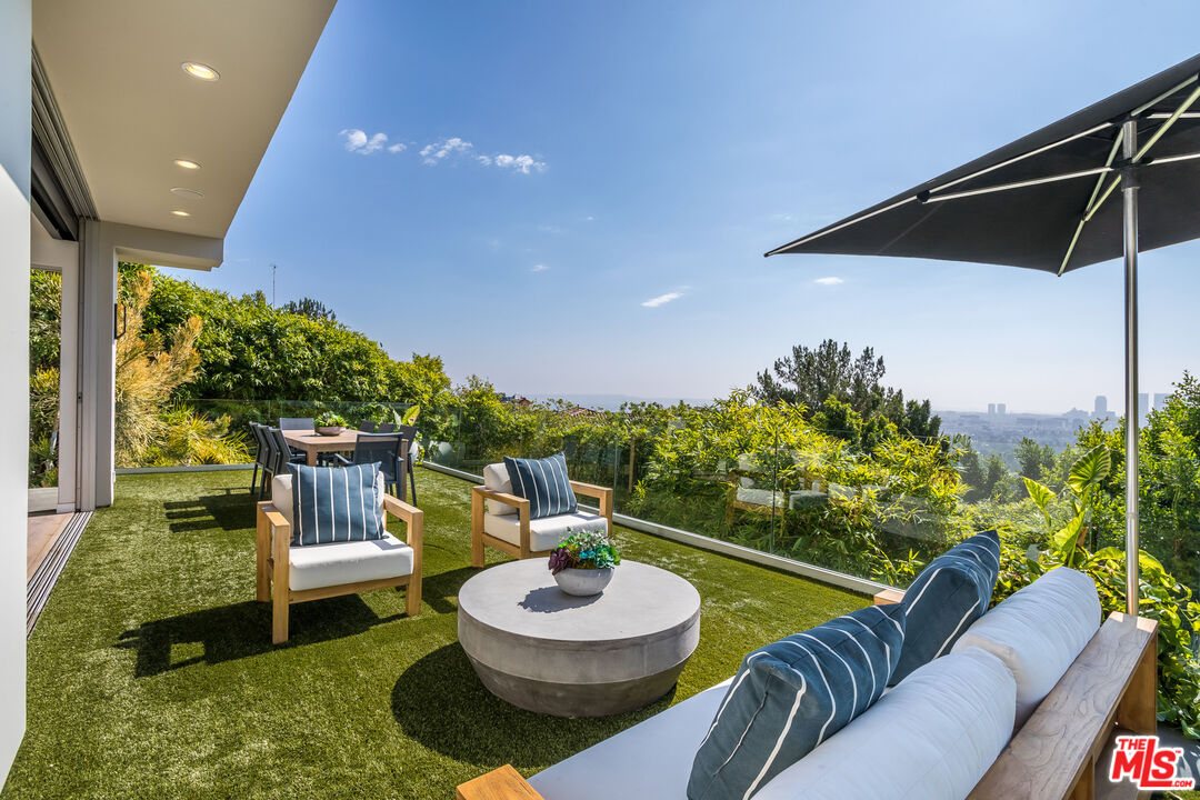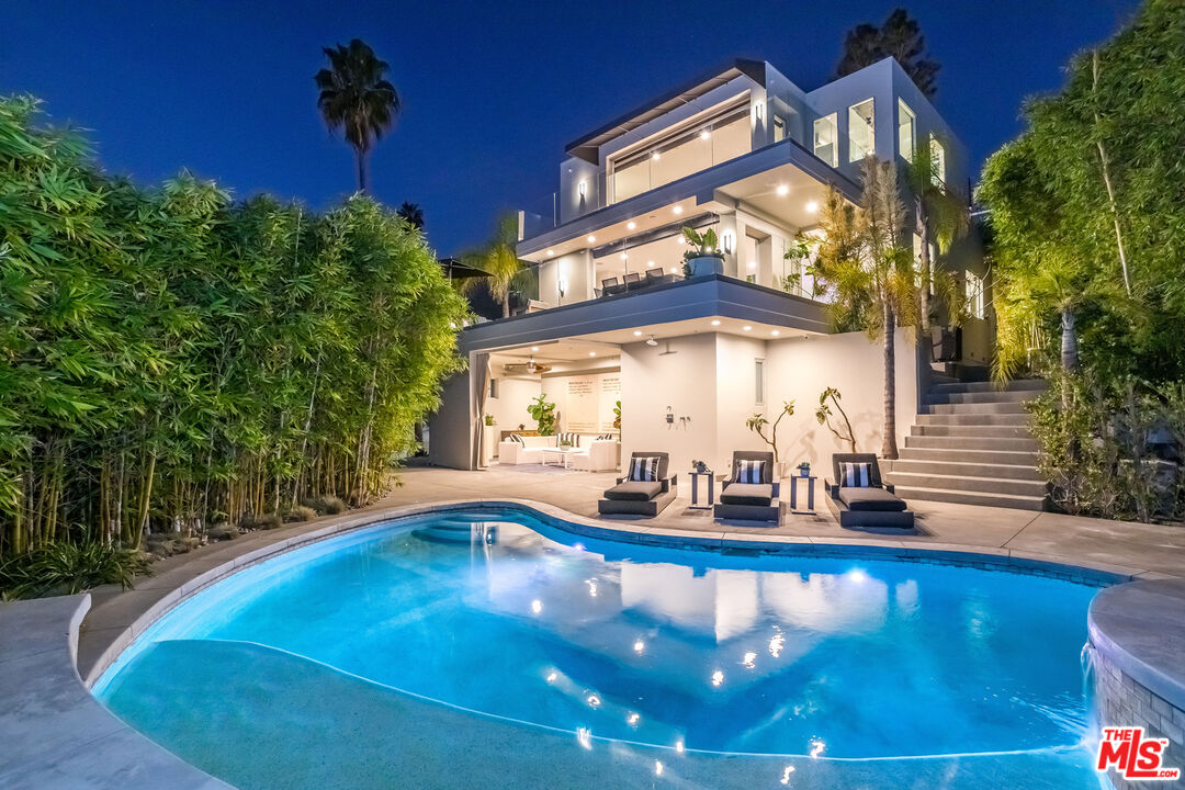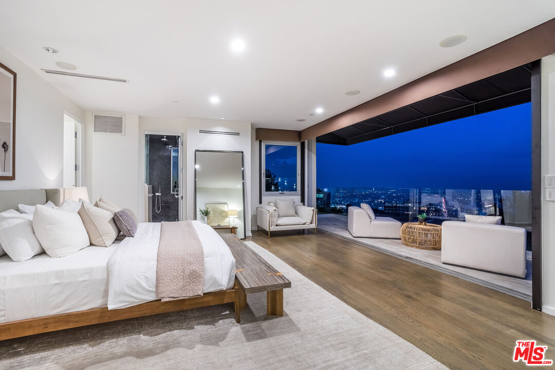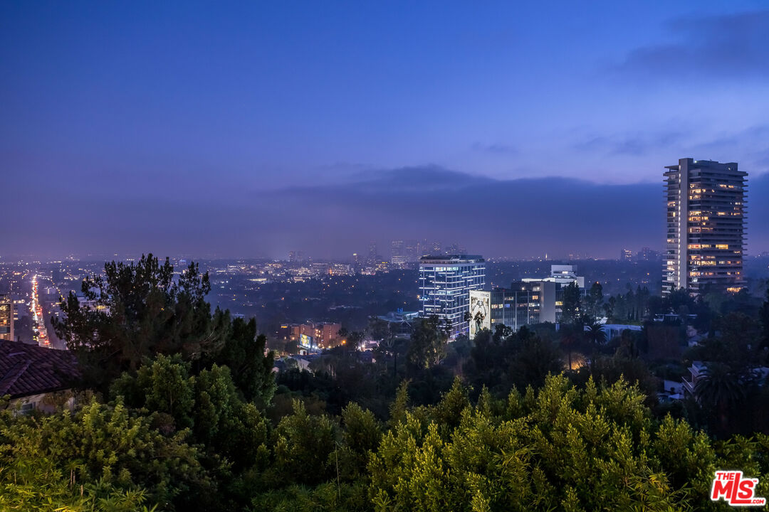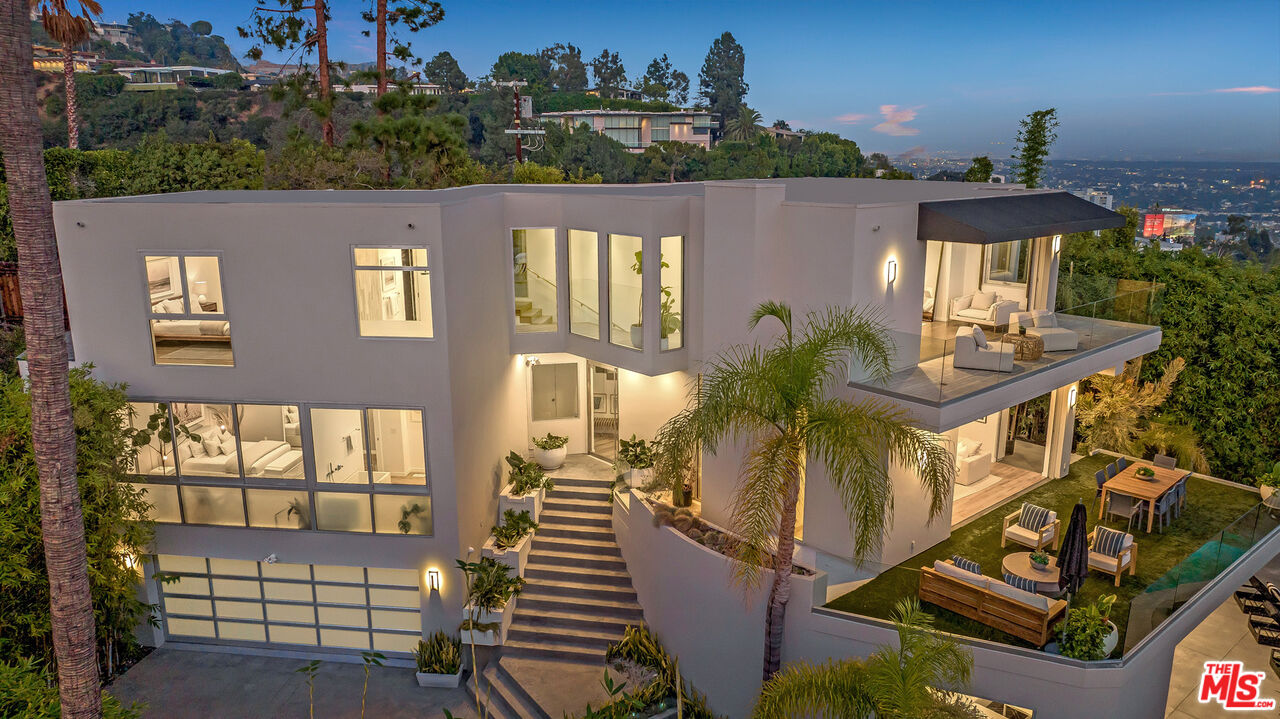 Located behind private gates above the Sunset Strip, this Modern home boasts spectacular panoramic views from Downtown to the ocean. The main level features an open floor plan with soaring ceilings and hardwood flooring throughout. The living area with a fireplace and disappearing walls of glass opens up to a grassy terrace with expansive views. The gourmet kitchen comes replete with sleek white cabinetry, grey stone countertops, a large center island, and top-of-the-line appliances. Upstairs, the luxurious owner's suite offers breathtaking jetliner views, a private balcony, a walk-in closet, and a spa-like bathroom with dual vanity, sumptuous tile work, a large infinity-edge tub, and a walk-in shower with more panoramic views. All additional spacious guest bedrooms each include an exquisite ensuite bathroom. The backyard is a private oasis, with a sparkling pool and hot tub surrounded by mature greenery and an impressive cabana with a sitting area, bar, and bathroom, perfect for entertaining. Other amenities include a home theater, gym, office, and a large private terrace upstairs with plenty of room and head-on views of the downtown LA skyline. A large 2-car garage and a long private driveway with motor court/additional parking. Only minutes away from the best dining and shopping West Hollywood has to offer.