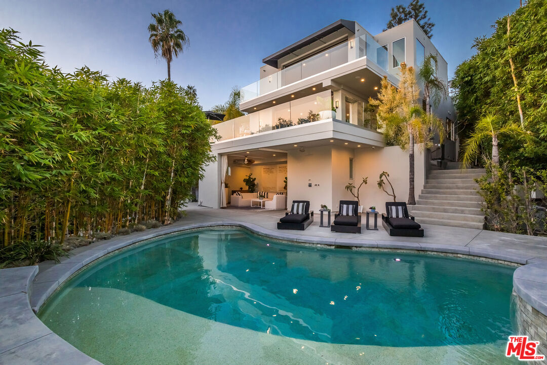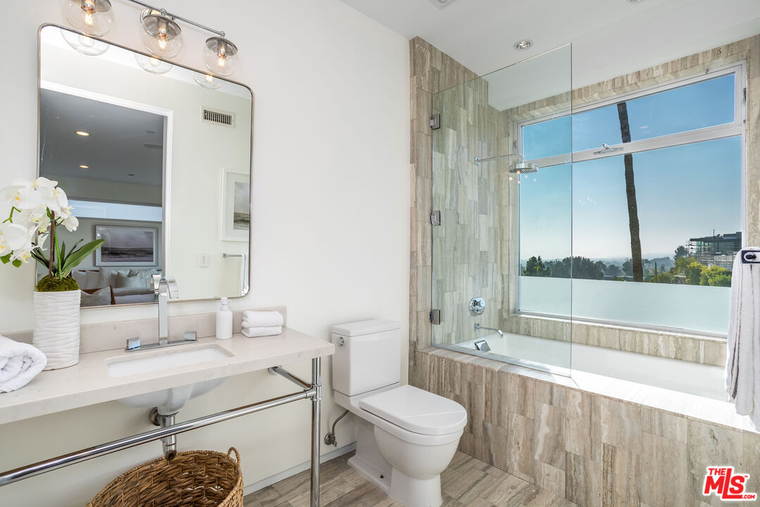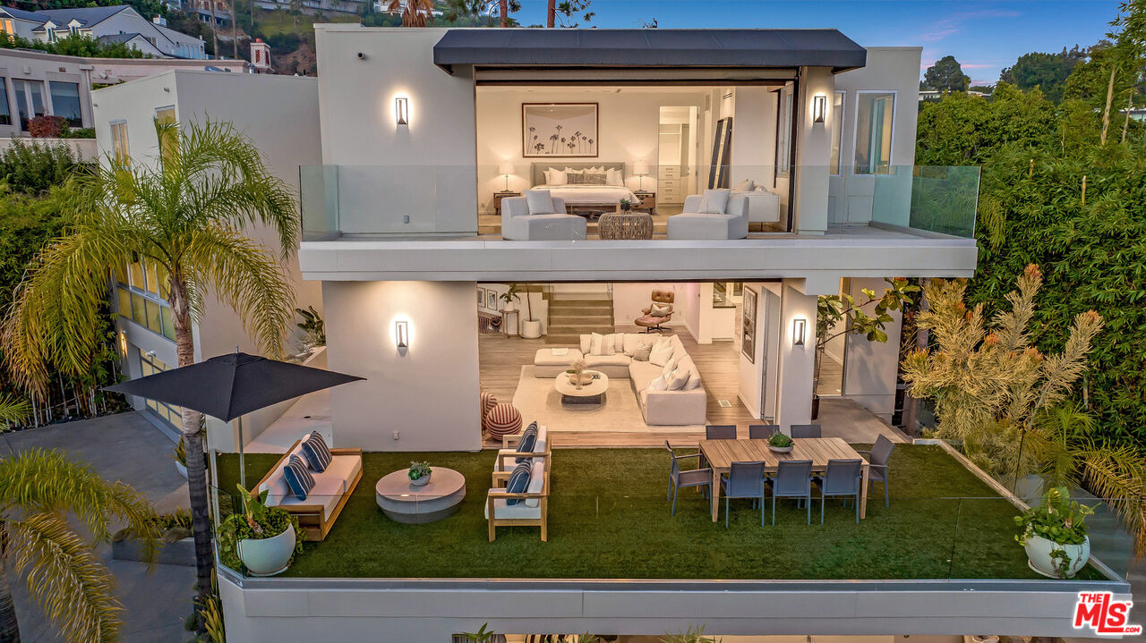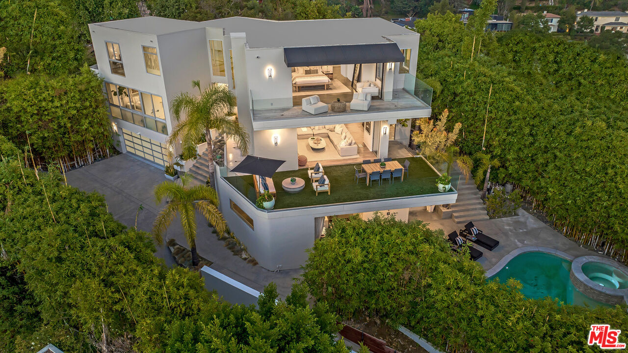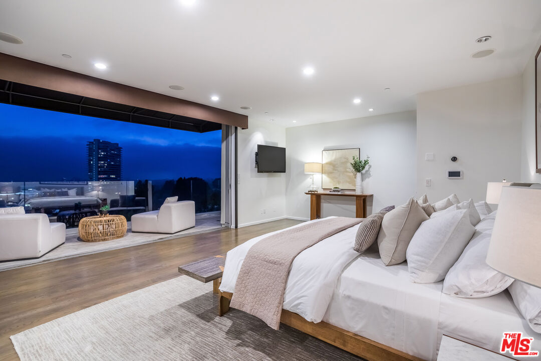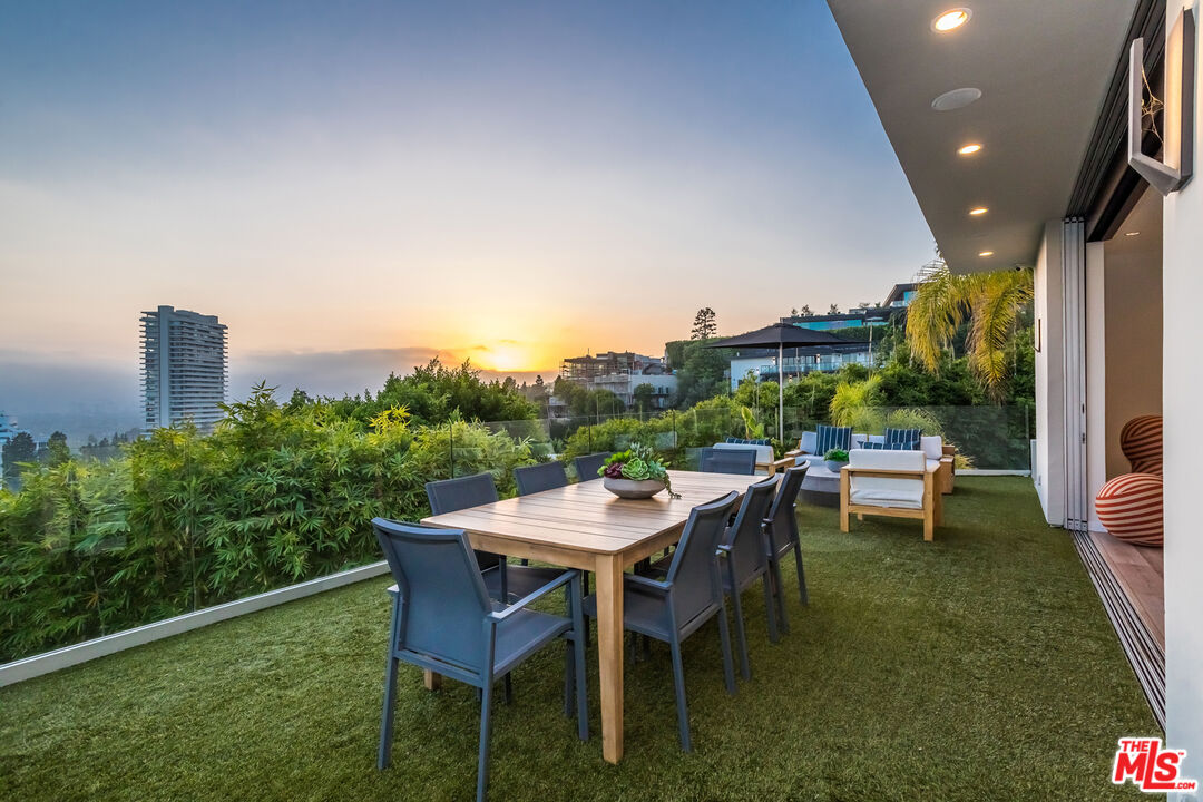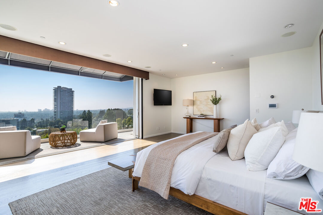 Located behind private gates above the Sunset Strip, this Modern home boasts spectacular panoramic views from Downtown to the ocean. The main level features an open floor plan with soaring ceilings and hardwood flooring throughout. The living area with a fireplace and disappearing walls of glass opens up to a grassy terrace with expansive views. The gourmet kitchen comes replete with sleek white cabinetry, grey stone countertops, a large center island, and top-of-the-line appliances. Upstairs, the luxurious owner's suite offers breathtaking jetliner views, a private balcony, a walk-in closet, and a spa-like bathroom with dual vanity, sumptuous tile work, a large infinity-edge tub, and a walk-in shower with more panoramic views. All additional spacious guest bedrooms each include an exquisite ensuite bathroom. The backyard is a private oasis, with a sparkling pool and hot tub surrounded by mature greenery and an impressive cabana with a sitting area, bar, and bathroom, perfect for entertaining. Other amenities include a home theater, gym, office, and a large private terrace upstairs with plenty of room and head-on views of the downtown LA skyline. A large 2-car garage and a long private driveway with motor court/additional parking. Only minutes away from the best dining and shopping West Hollywood has to offer.