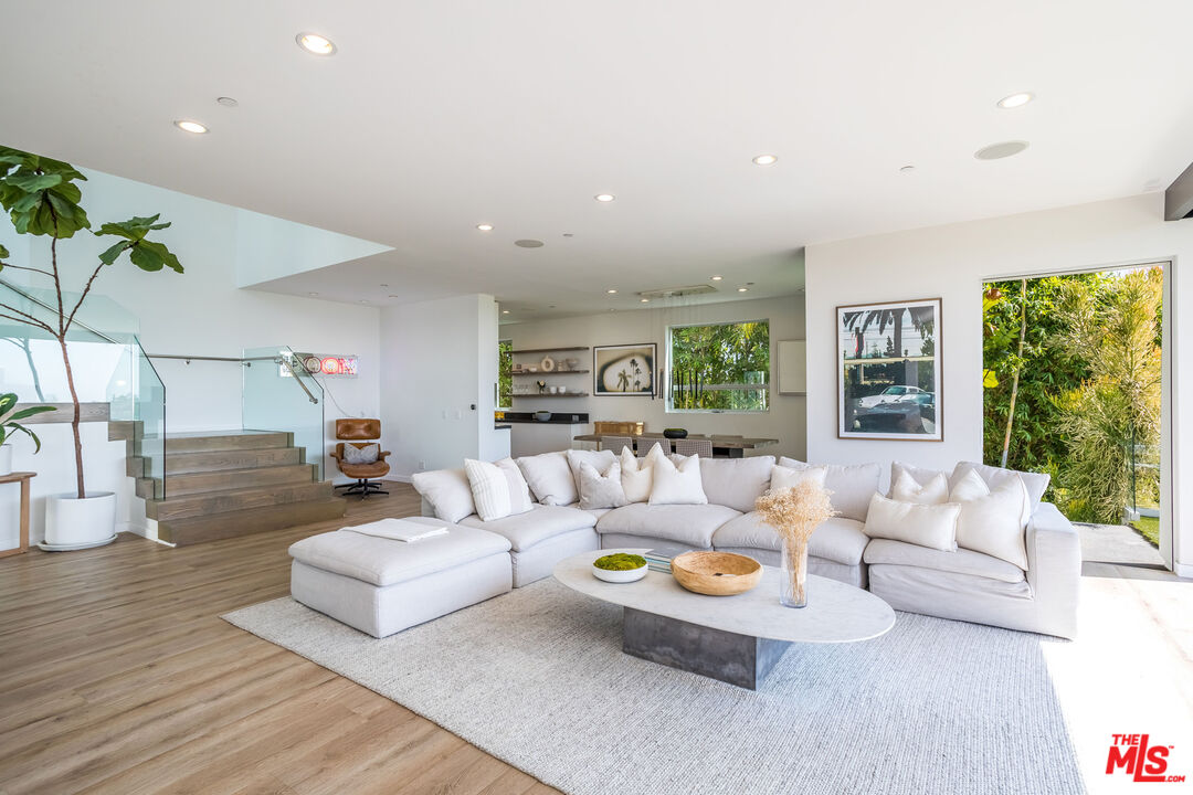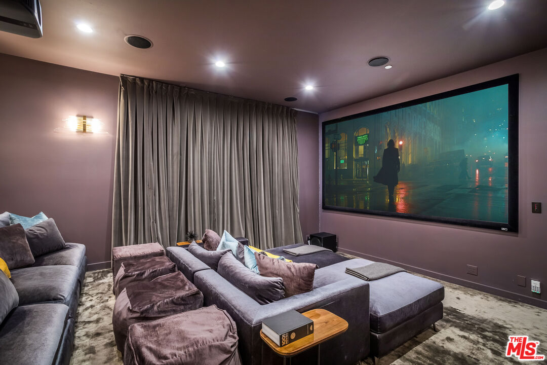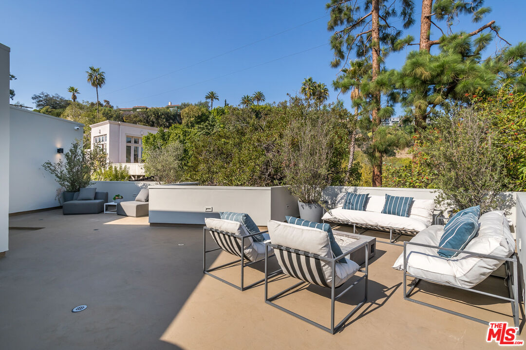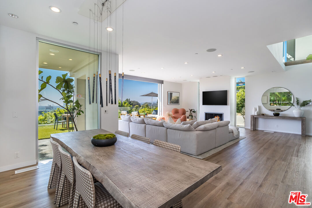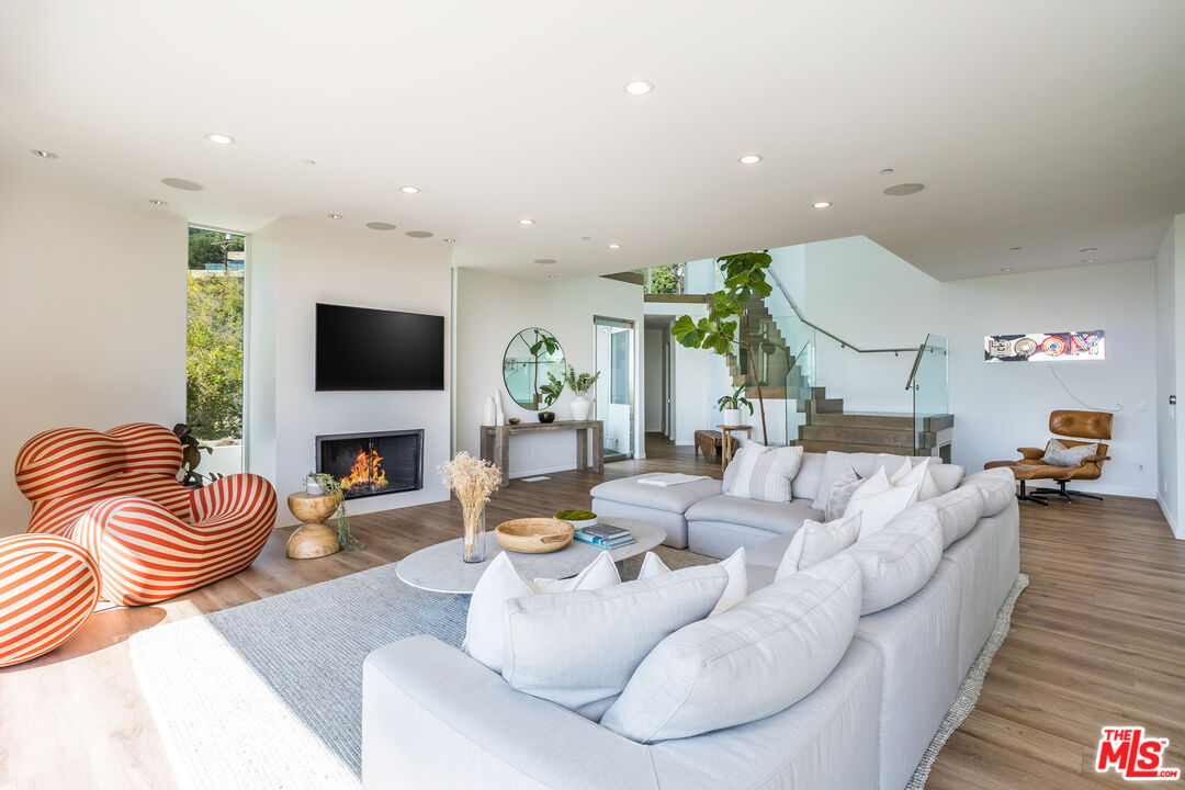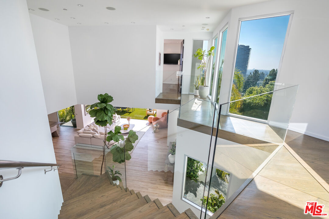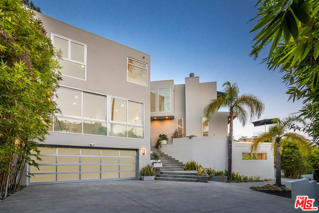 Located behind private gates above the Sunset Strip, this Modern home boasts spectacular panoramic views from Downtown to the ocean. The main level features an open floor plan with soaring ceilings and hardwood flooring throughout. The living area with a fireplace and disappearing walls of glass opens up to a grassy terrace with expansive views. The gourmet kitchen comes replete with sleek white cabinetry, grey stone countertops, a large center island, and top-of-the-line appliances. Upstairs, the luxurious owner's suite offers breathtaking jetliner views, a private balcony, a walk-in closet, and a spa-like bathroom with dual vanity, sumptuous tile work, a large infinity-edge tub, and a walk-in shower with more panoramic views. All additional spacious guest bedrooms each include an exquisite ensuite bathroom. The backyard is a private oasis, with a sparkling pool and hot tub surrounded by mature greenery and an impressive cabana with a sitting area, bar, and bathroom, perfect for entertaining. Other amenities include a home theater, gym, office, and a large private terrace upstairs with plenty of room and head-on views of the downtown LA skyline. A large 2-car garage and a long private driveway with motor court/additional parking. Only minutes away from the best dining and shopping West Hollywood has to offer.