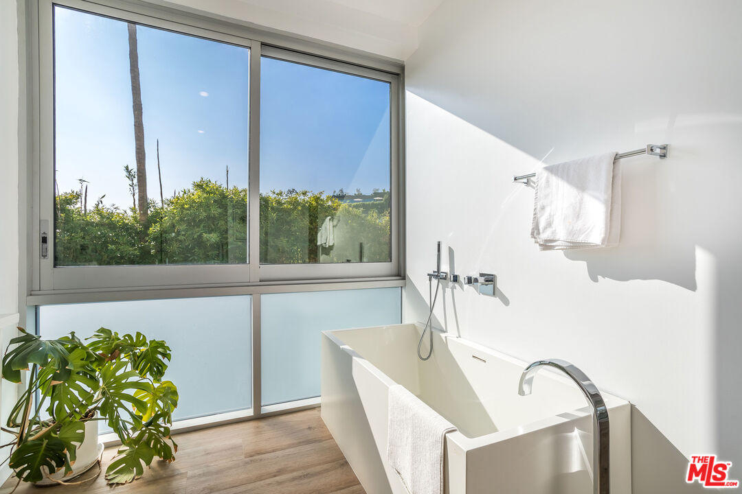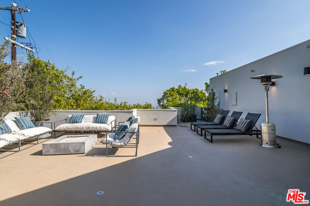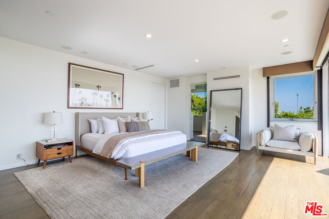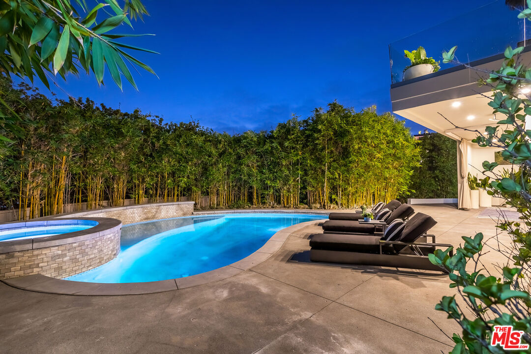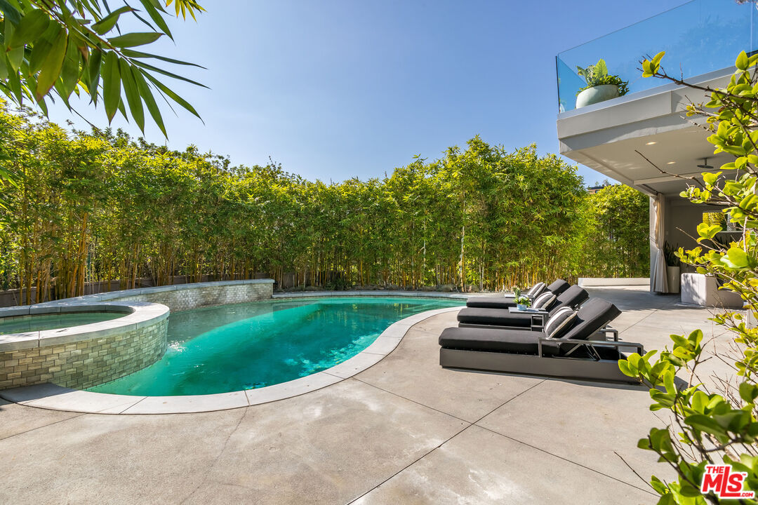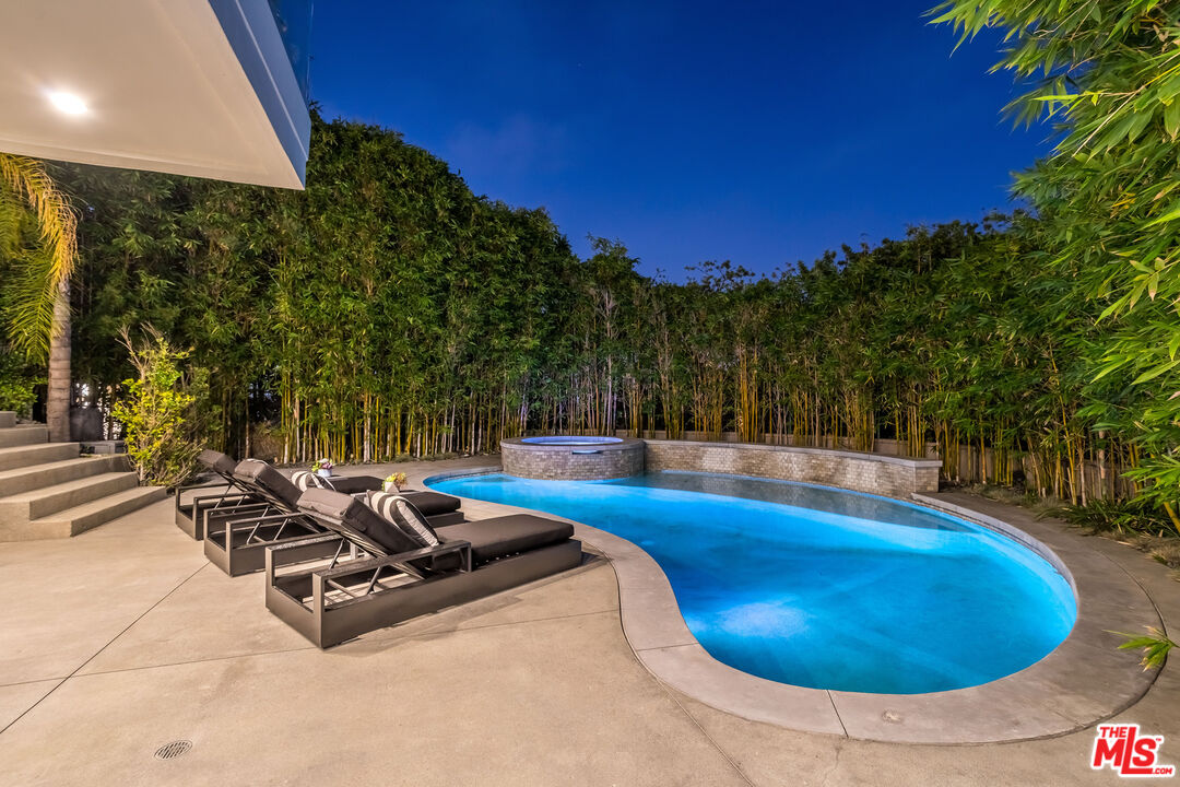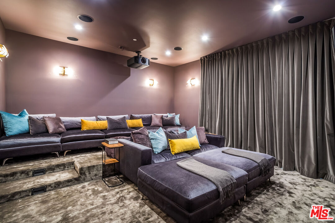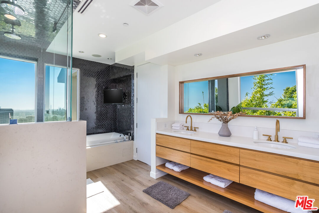 Located behind private gates above the Sunset Strip, this Modern home boasts spectacular panoramic views from Downtown to the ocean. The main level features an open floor plan with soaring ceilings and hardwood flooring throughout. The living area with a fireplace and disappearing walls of glass opens up to a grassy terrace with expansive views. The gourmet kitchen comes replete with sleek white cabinetry, grey stone countertops, a large center island, and top-of-the-line appliances. Upstairs, the luxurious owner's suite offers breathtaking jetliner views, a private balcony, a walk-in closet, and a spa-like bathroom with dual vanity, sumptuous tile work, a large infinity-edge tub, and a walk-in shower with more panoramic views. All additional spacious guest bedrooms each include an exquisite ensuite bathroom. The backyard is a private oasis, with a sparkling pool and hot tub surrounded by mature greenery and an impressive cabana with a sitting area, bar, and bathroom, perfect for entertaining. Other amenities include a home theater, gym, office, and a large private terrace upstairs with plenty of room and head-on views of the downtown LA skyline. A large 2-car garage and a long private driveway with motor court/additional parking. Only minutes away from the best dining and shopping West Hollywood has to offer.