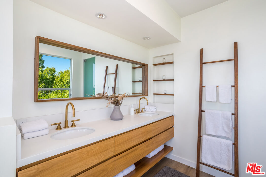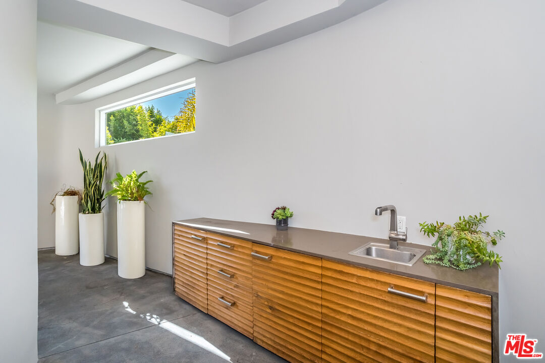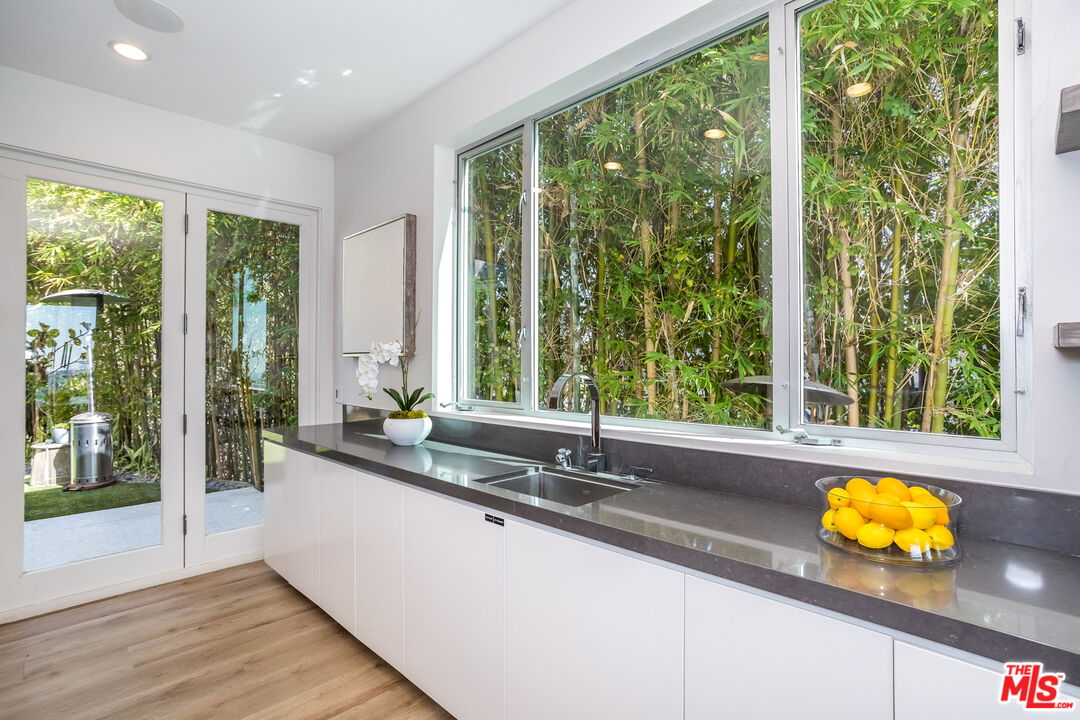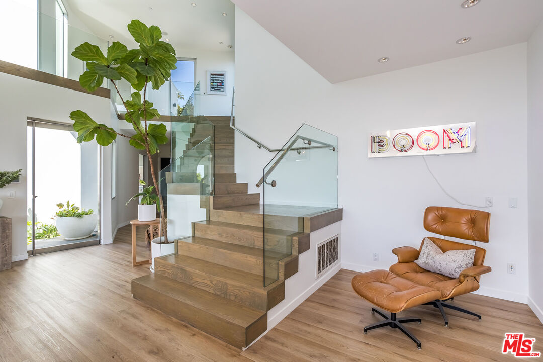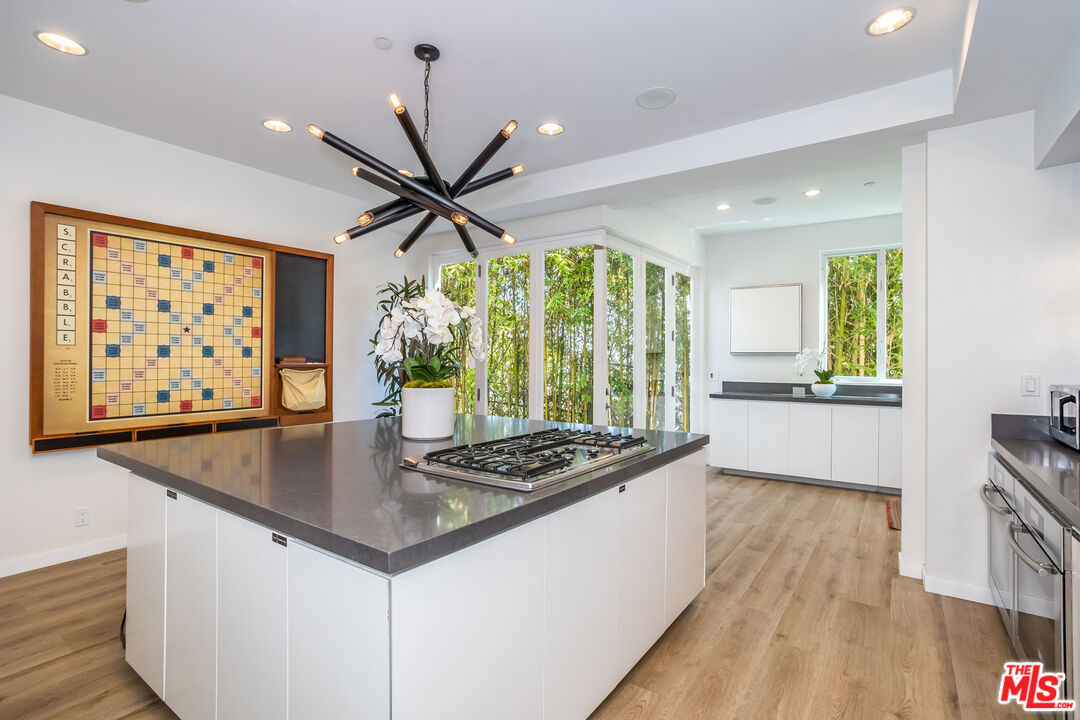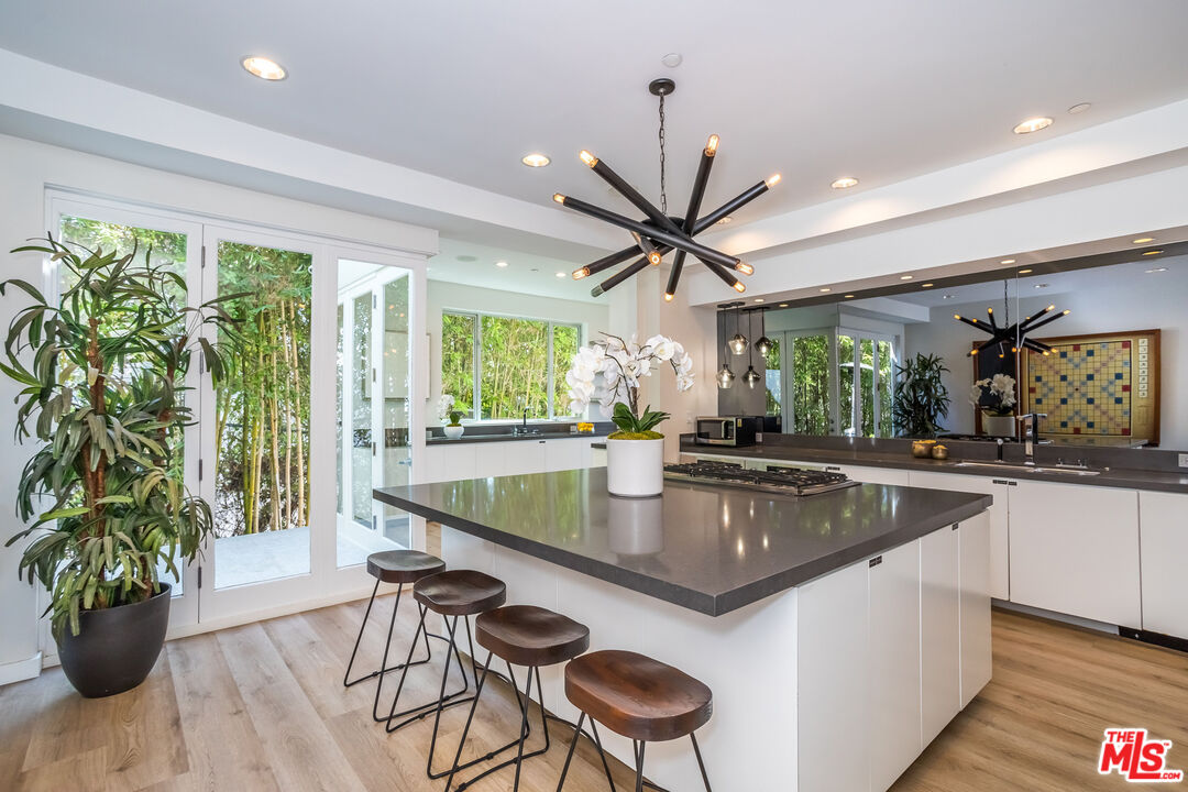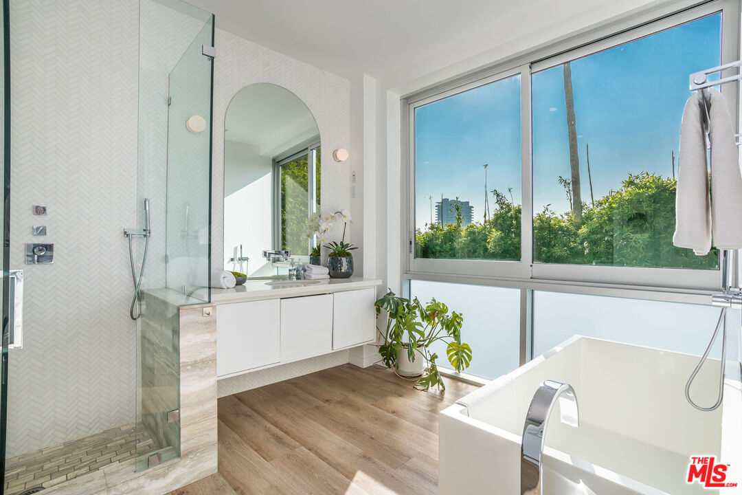 Located behind private gates above the Sunset Strip, this Modern home boasts spectacular panoramic views from Downtown to the ocean. The main level features an open floor plan with soaring ceilings and hardwood flooring throughout. The living area with a fireplace and disappearing walls of glass opens up to a grassy terrace with expansive views. The gourmet kitchen comes replete with sleek white cabinetry, grey stone countertops, a large center island, and top-of-the-line appliances. Upstairs, the luxurious owner's suite offers breathtaking jetliner views, a private balcony, a walk-in closet, and a spa-like bathroom with dual vanity, sumptuous tile work, a large infinity-edge tub, and a walk-in shower with more panoramic views. All additional spacious guest bedrooms each include an exquisite ensuite bathroom. The backyard is a private oasis, with a sparkling pool and hot tub surrounded by mature greenery and an impressive cabana with a sitting area, bar, and bathroom, perfect for entertaining. Other amenities include a home theater, gym, office, and a large private terrace upstairs with plenty of room and head-on views of the downtown LA skyline. A large 2-car garage and a long private driveway with motor court/additional parking. Only minutes away from the best dining and shopping West Hollywood has to offer.