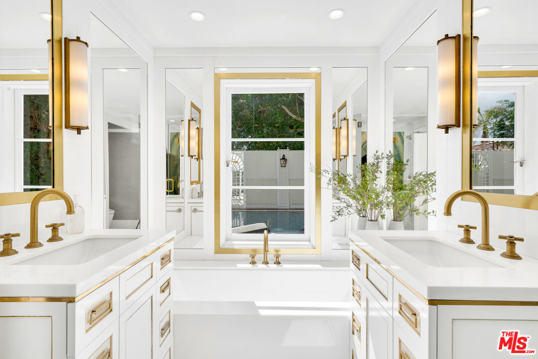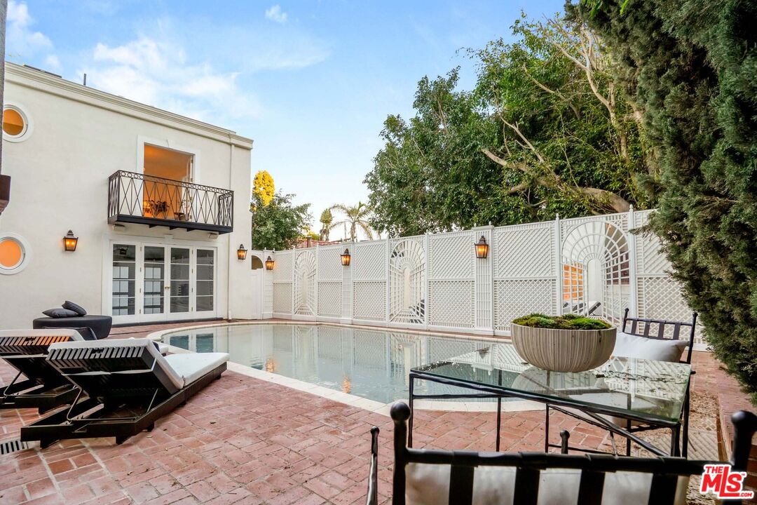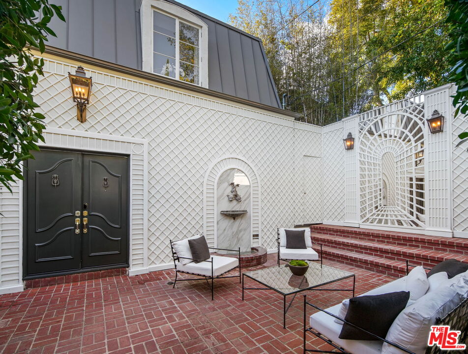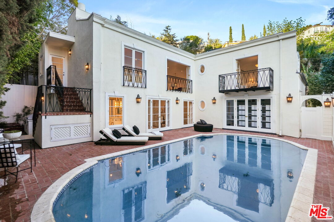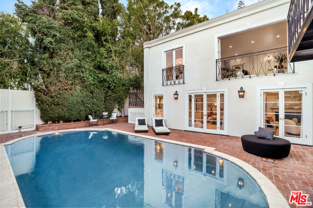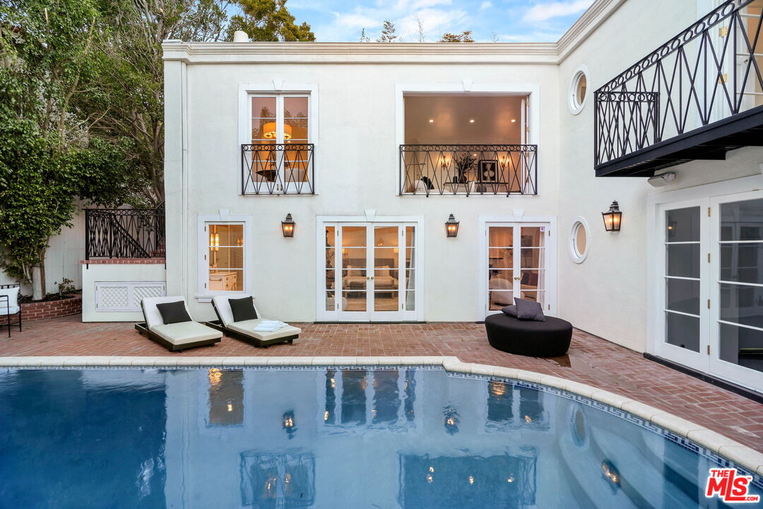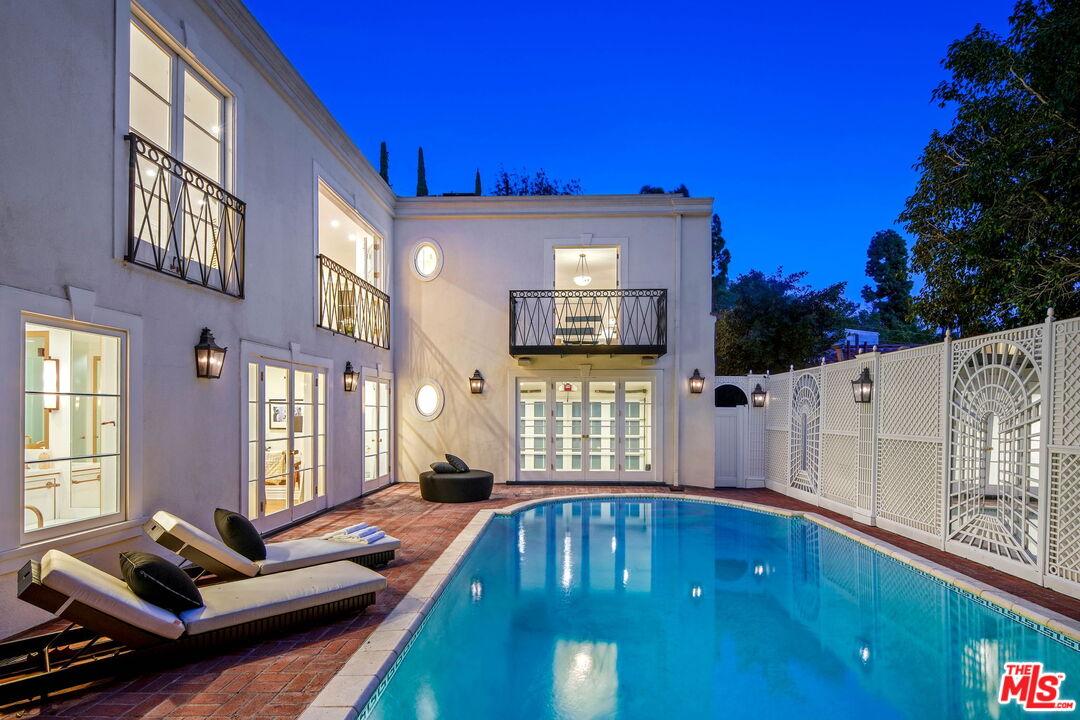 Experience the epitome of glamour and sophistication with this stunningly restored Hollywood Regency replete with city views. Originally built by Robert Woolf alongside his partner, the legendary architect John Woolf, for their own personal residence, this property has recently undergone an artful restoration by renowned AD100 designer Tim Corrigan. Every detail has been meticulously considered to create an ultra-luxurious, alluring, and simply timeless atmosphere. Enter past the gated brick courtyard with fountain into the quintessential foyer featuring gorgeous black-and-white checkered marble floors. The main floor boasts a sitting room with beautiful crown molding and fireplace, along with an exquisite powder room with inlaid brass walls and an intricate one-of-a-kind medallion marble floor. The home has dual master suites (one on each floor) each equipped with their own ensuite baths that are strikingly finished with his-and-her sinks, built-in brass/silver fixtures, huge slabs of stone, and a plethora of closet space. Ascend the original brass railing staircase to the salon room, which features a second fireplace, French doors, and breathtaking city views. The large dining area and European kitchen with top-of-the-line appliances and backlit stone backsplash are perfect for entertaining. Outside, the private yard features a large pool, built-in BBQ, and mature hedging. A finished basement, along with a finished 2-car garage with French doors that lead to the yard, complete this remarkable property. Don't miss this rare opportunity to own one of the most elegant and historic homes in Los Angeles.
