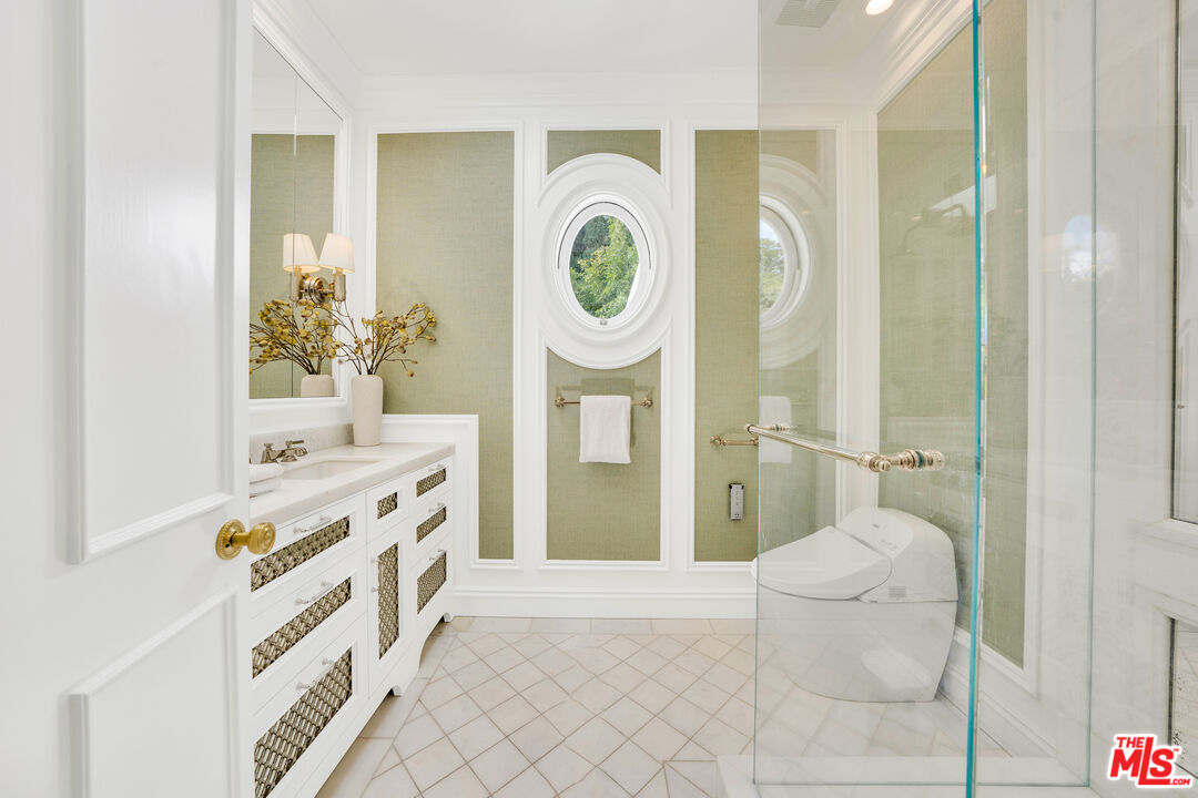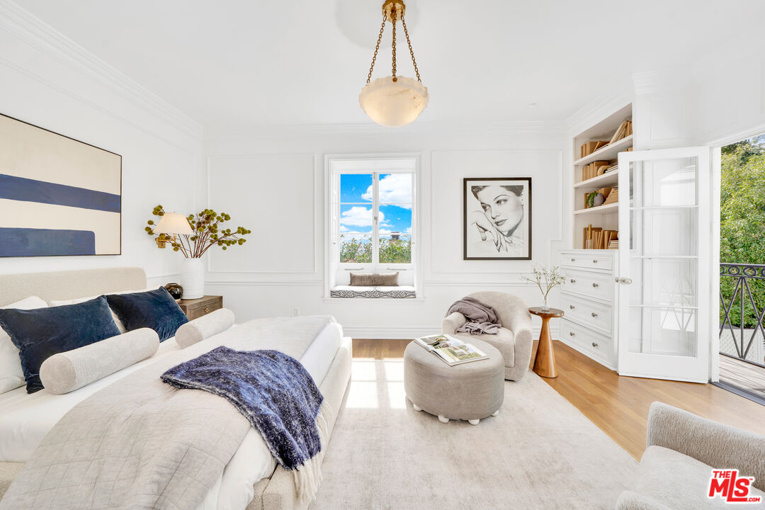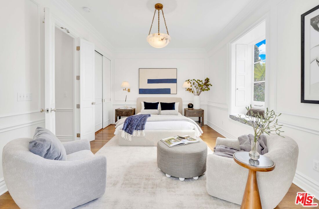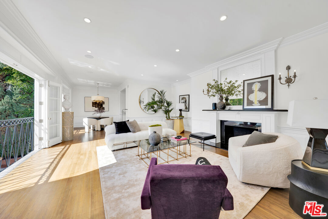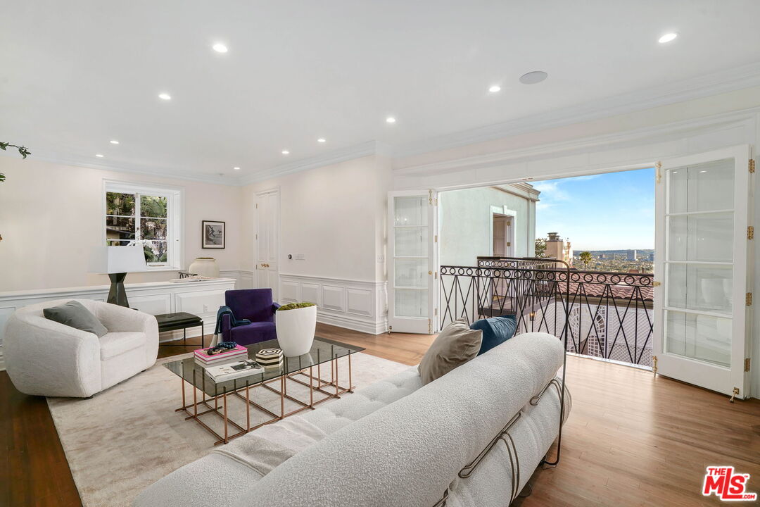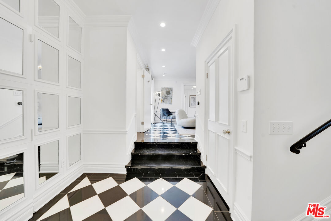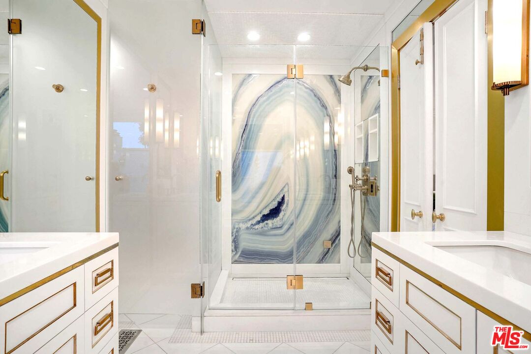 Experience the epitome of glamour and sophistication with this stunningly restored Hollywood Regency replete with city views. Originally built by Robert Woolf alongside his partner, the legendary architect John Woolf, for their own personal residence, this property has recently undergone an artful restoration by renowned AD100 designer Tim Corrigan. Every detail has been meticulously considered to create an ultra-luxurious, alluring, and simply timeless atmosphere. Enter past the gated brick courtyard with fountain into the quintessential foyer featuring gorgeous black-and-white checkered marble floors. The main floor boasts a sitting room with beautiful crown molding and fireplace, along with an exquisite powder room with inlaid brass walls and an intricate one-of-a-kind medallion marble floor. The home has dual master suites (one on each floor) each equipped with their own ensuite baths that are strikingly finished with his-and-her sinks, built-in brass/silver fixtures, huge slabs of stone, and a plethora of closet space. Ascend the original brass railing staircase to the salon room, which features a second fireplace, French doors, and breathtaking city views. The large dining area and European kitchen with top-of-the-line appliances and backlit stone backsplash are perfect for entertaining. Outside, the private yard features a large pool, built-in BBQ, and mature hedging. A finished basement, along with a finished 2-car garage with French doors that lead to the yard, complete this remarkable property. Don't miss this rare opportunity to own one of the most elegant and historic homes in Los Angeles.