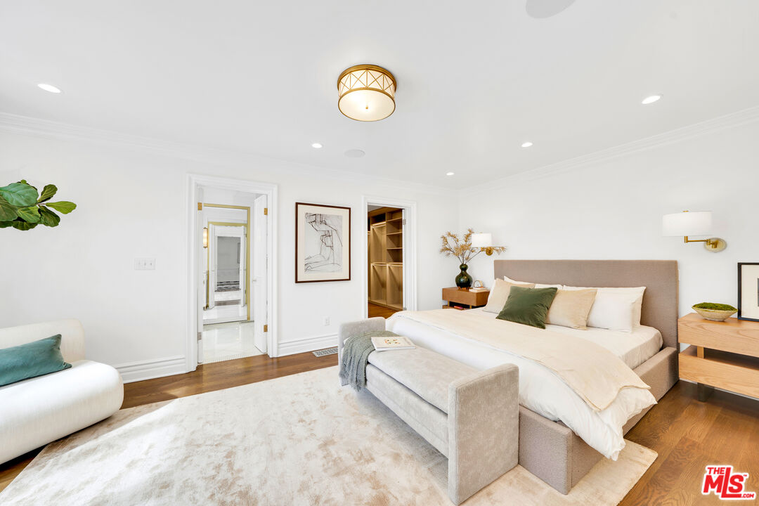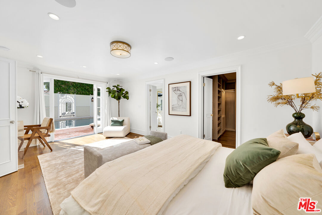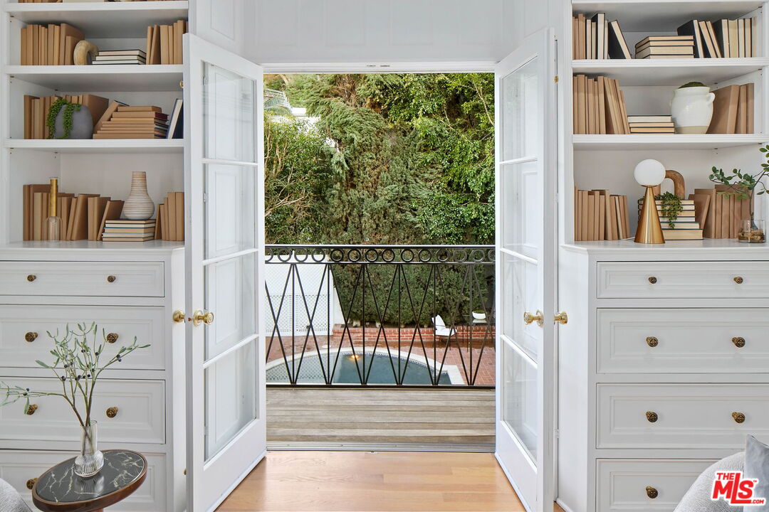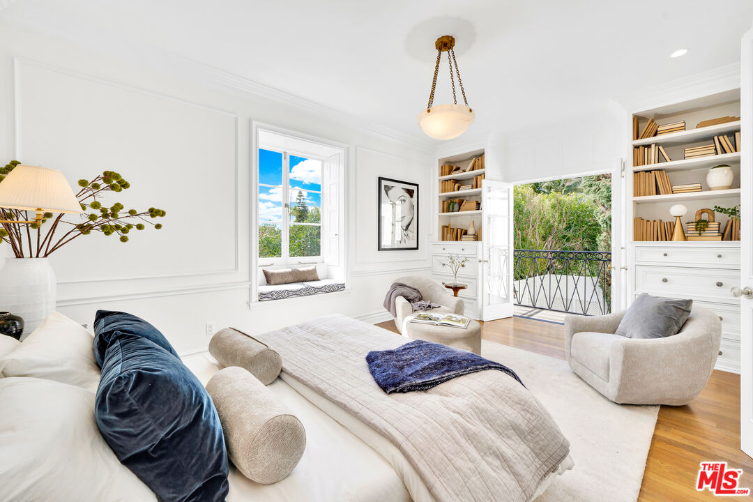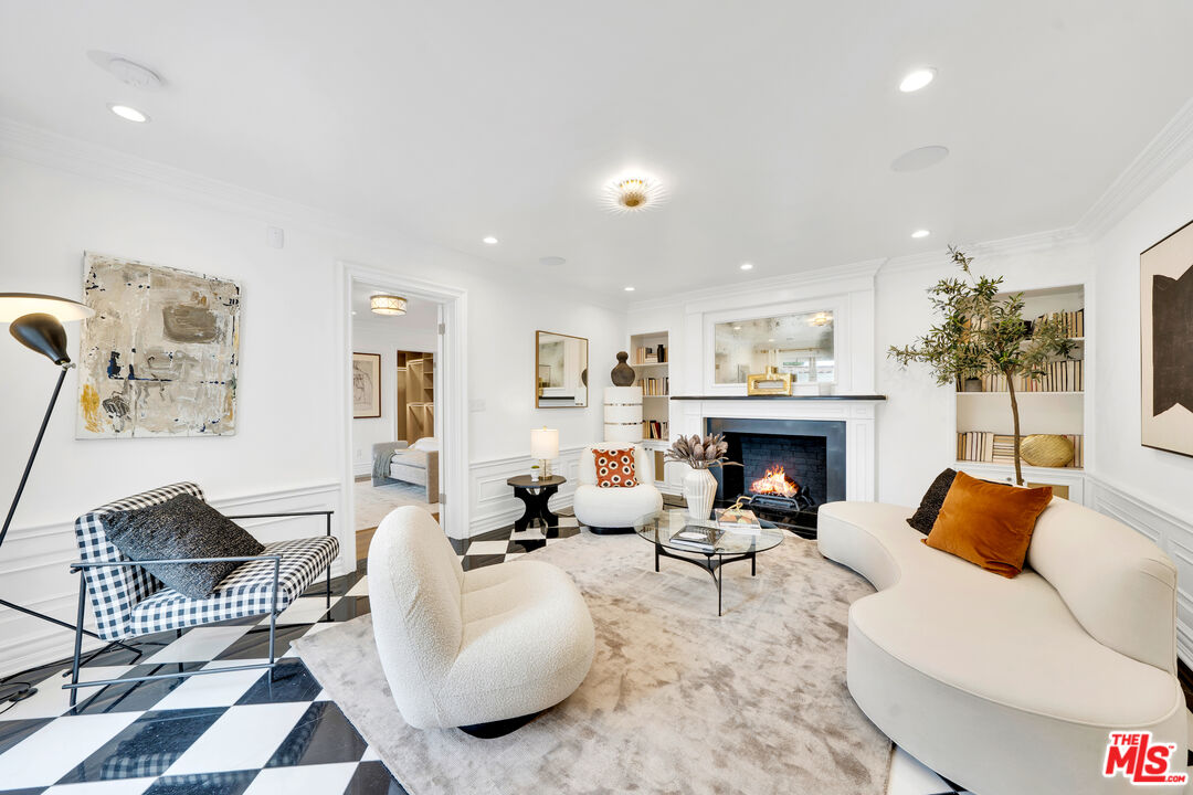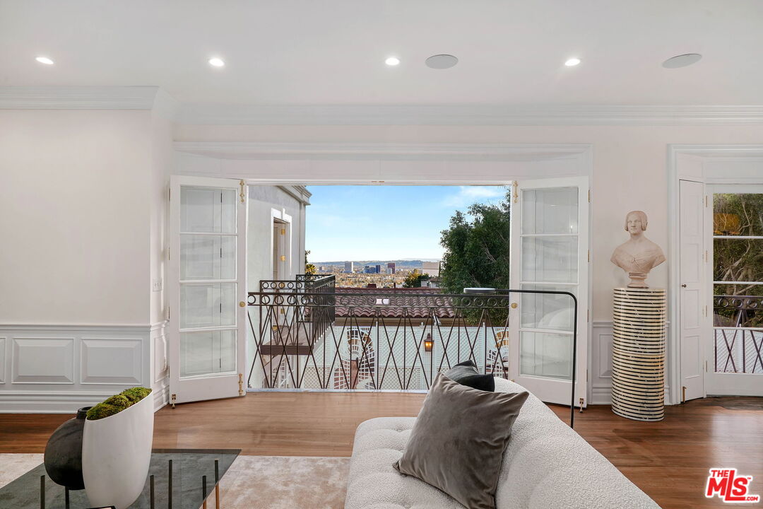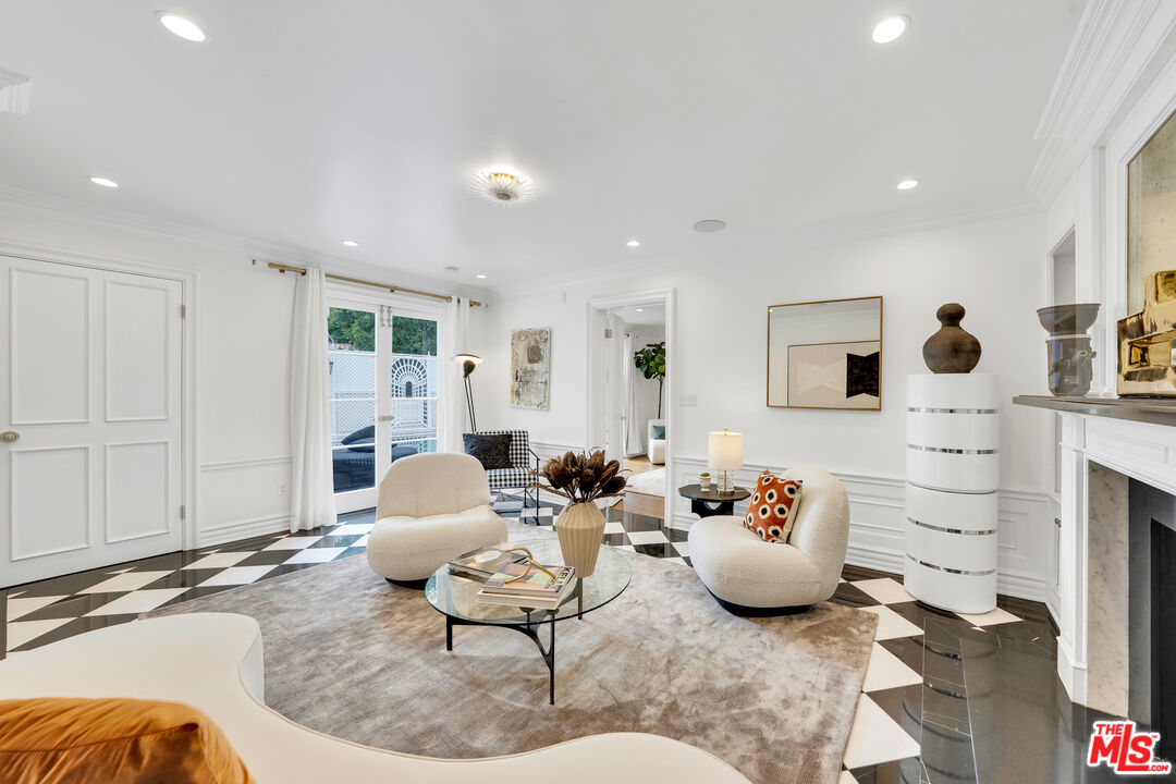 Experience the epitome of glamour and sophistication with this stunningly restored Hollywood Regency replete with city views. Originally built by Robert Woolf alongside his partner, the legendary architect John Woolf, for their own personal residence, this property has recently undergone an artful restoration by renowned AD100 designer Tim Corrigan. Every detail has been meticulously considered to create an ultra-luxurious, alluring, and simply timeless atmosphere. Enter past the gated brick courtyard with fountain into the quintessential foyer featuring gorgeous black-and-white checkered marble floors. The main floor boasts a sitting room with beautiful crown molding and fireplace, along with an exquisite powder room with inlaid brass walls and an intricate one-of-a-kind medallion marble floor. The home has dual master suites (one on each floor) each equipped with their own ensuite baths that are strikingly finished with his-and-her sinks, built-in brass/silver fixtures, huge slabs of stone, and a plethora of closet space. Ascend the original brass railing staircase to the salon room, which features a second fireplace, French doors, and breathtaking city views. The large dining area and European kitchen with top-of-the-line appliances and backlit stone backsplash are perfect for entertaining. Outside, the private yard features a large pool, built-in BBQ, and mature hedging. A finished basement, along with a finished 2-car garage with French doors that lead to the yard, complete this remarkable property. Don't miss this rare opportunity to own one of the most elegant and historic homes in Los Angeles.