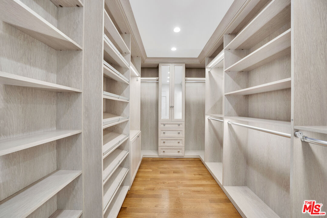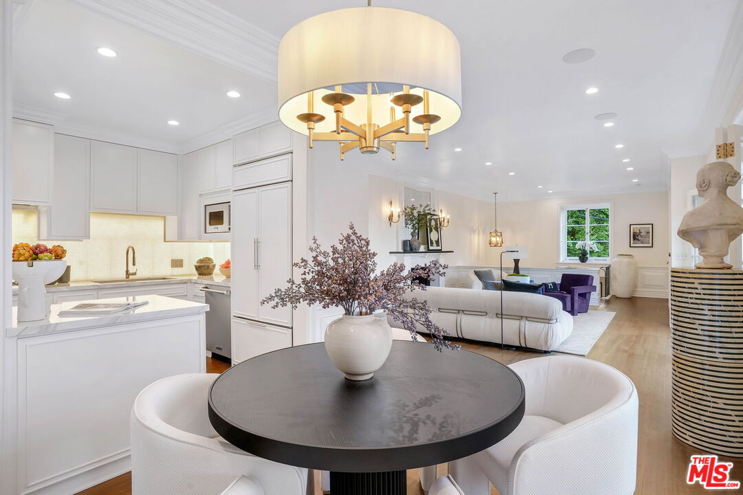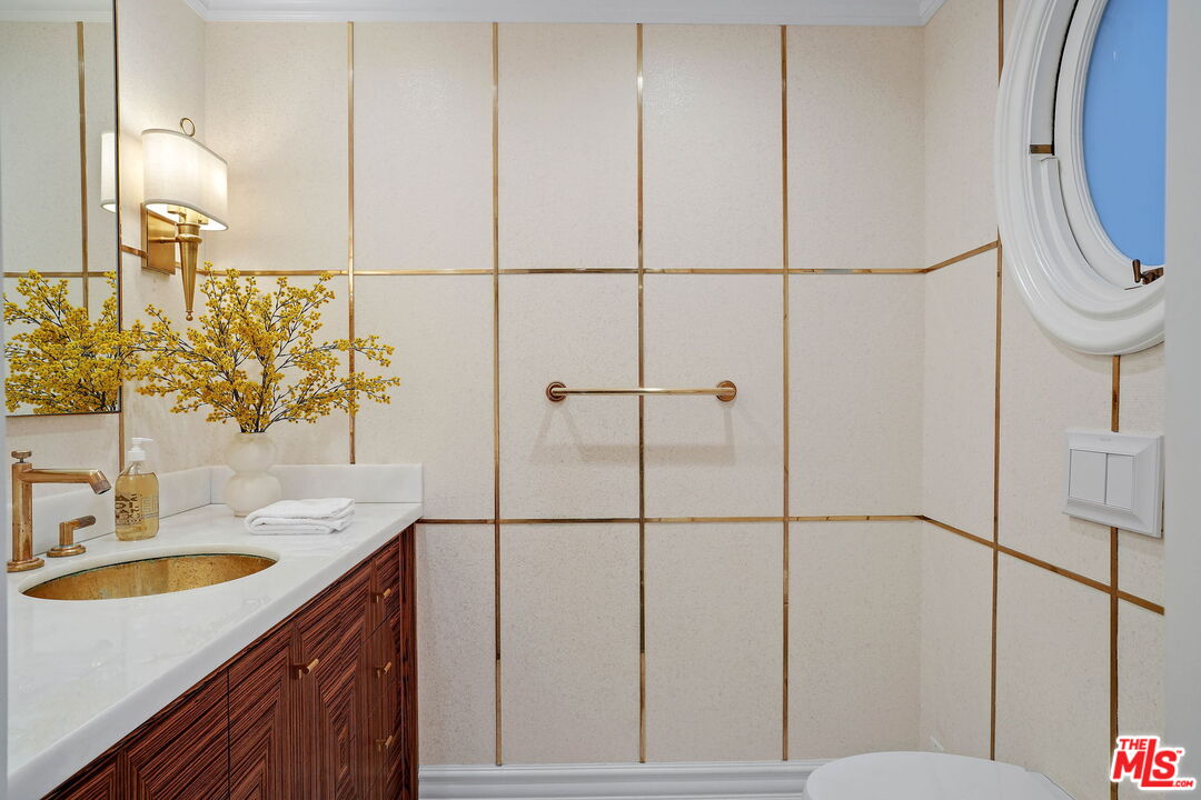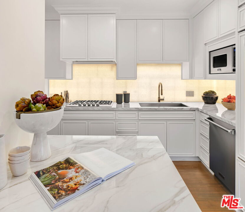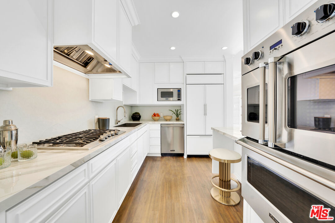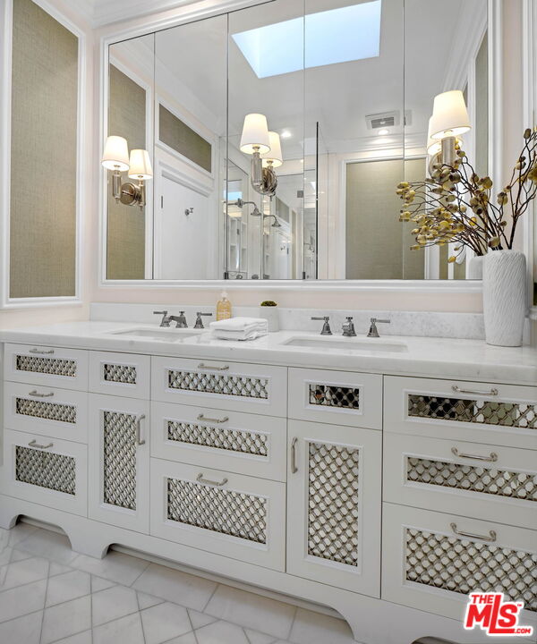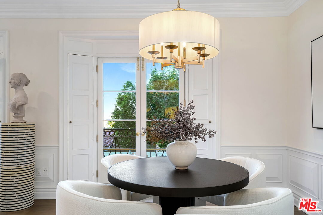 Experience the epitome of glamour and sophistication with this stunningly restored Hollywood Regency replete with city views. Originally built by Robert Woolf alongside his partner, the legendary architect John Woolf, for their own personal residence, this property has recently undergone an artful restoration by renowned AD100 designer Tim Corrigan. Every detail has been meticulously considered to create an ultra-luxurious, alluring, and simply timeless atmosphere. Enter past the gated brick courtyard with fountain into the quintessential foyer featuring gorgeous black-and-white checkered marble floors. The main floor boasts a sitting room with beautiful crown molding and fireplace, along with an exquisite powder room with inlaid brass walls and an intricate one-of-a-kind medallion marble floor. The home has dual master suites (one on each floor) each equipped with their own ensuite baths that are strikingly finished with his-and-her sinks, built-in brass/silver fixtures, huge slabs of stone, and a plethora of closet space. Ascend the original brass railing staircase to the salon room, which features a second fireplace, French doors, and breathtaking city views. The large dining area and European kitchen with top-of-the-line appliances and backlit stone backsplash are perfect for entertaining. Outside, the private yard features a large pool, built-in BBQ, and mature hedging. A finished basement, along with a finished 2-car garage with French doors that lead to the yard, complete this remarkable property. Don't miss this rare opportunity to own one of the most elegant and historic homes in Los Angeles.