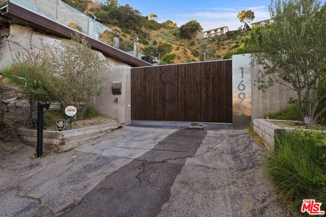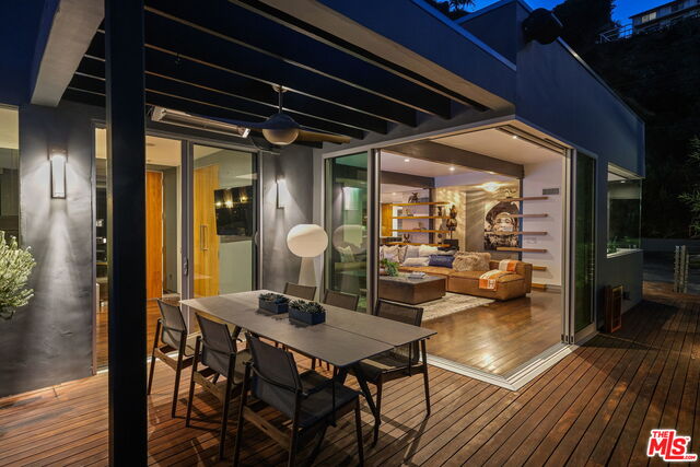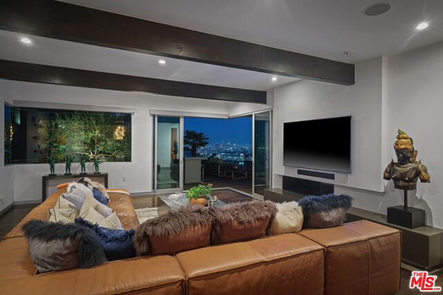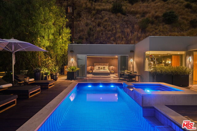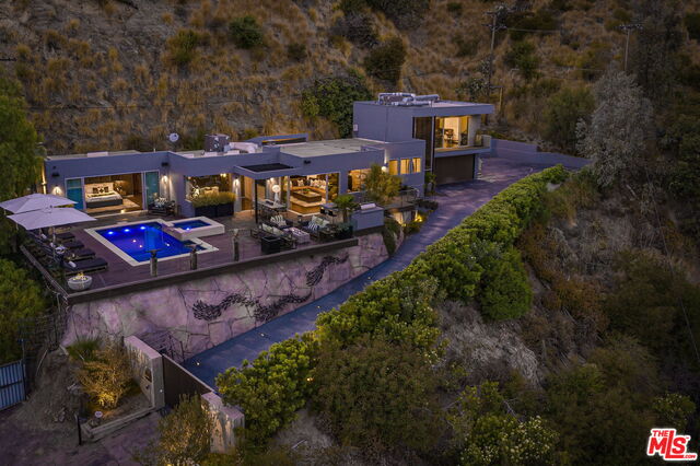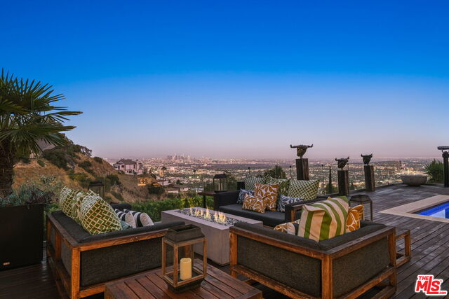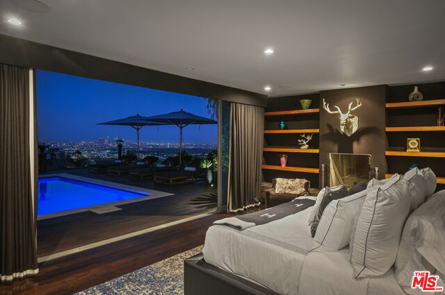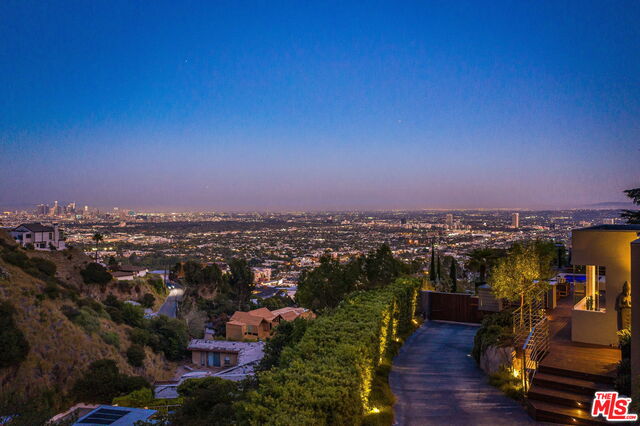 Set behind a long privately gated driveway above the Sunset Strip, this contemporary jewel box features jetliner views of the entire city. On almost one acre of land, this four-bedroom, four-bathroom estate creates the perfect indoor/outdoor lifestyle with seamless access to the gorgeous pool, spa, and massive entertainment deck replete with outdoor BBQ, multiple gas fireplaces, and shaded patio. The interior boasts an open floor plan with sliding Fleetwood doors and dramatic views, dining area, plus a chef's kitchen with beautiful wooden cabinetry, Miele/Wolf appliances, and large wine cooler. The luxurious owner's suite opens to the pool/spa and has its own fireplace with built-in library shelving, oversized drop-down theater projection screen, and a resort-like bathroom with separate steam shower and walk-in closet. Two additional bedrooms and one attached en-suite guest unit with separate entrance. 2-car garage with motorcourt/sportcourt offering additional parking up to 6 cars.