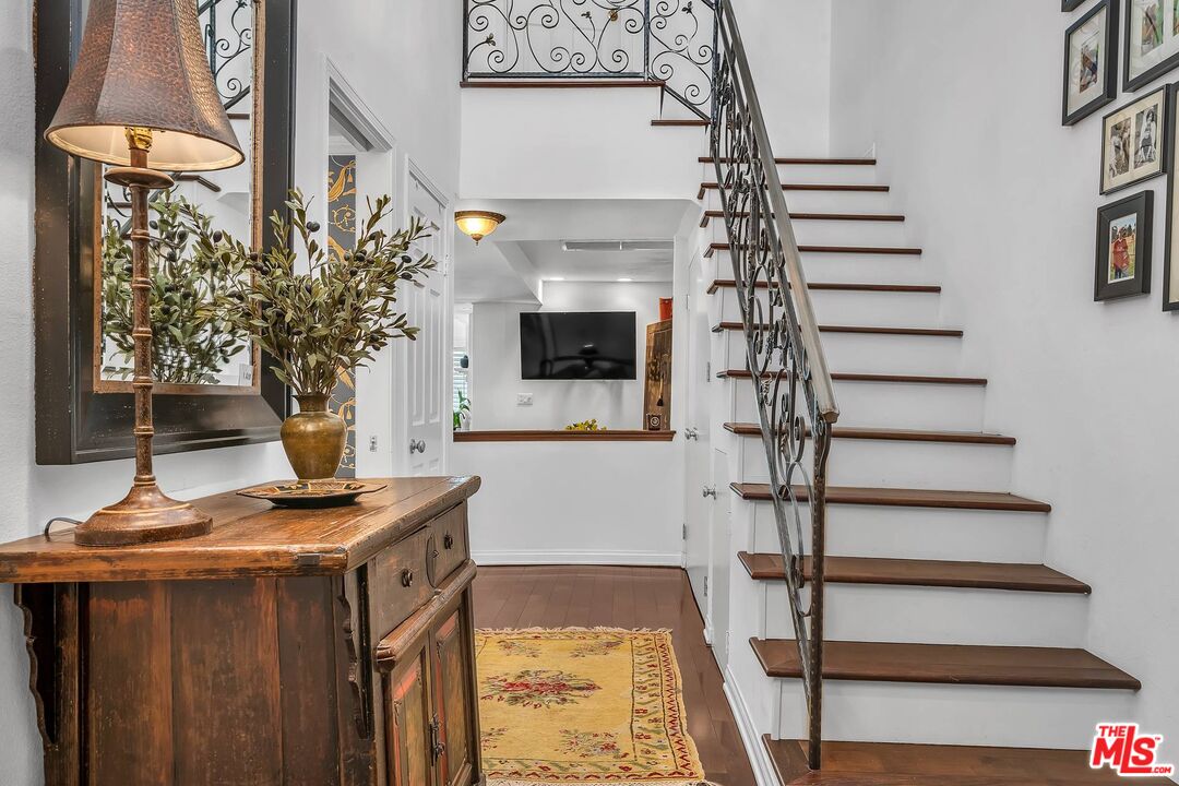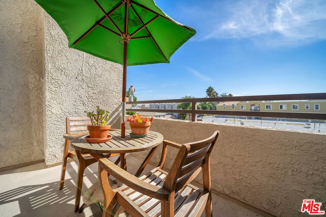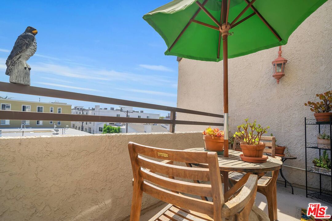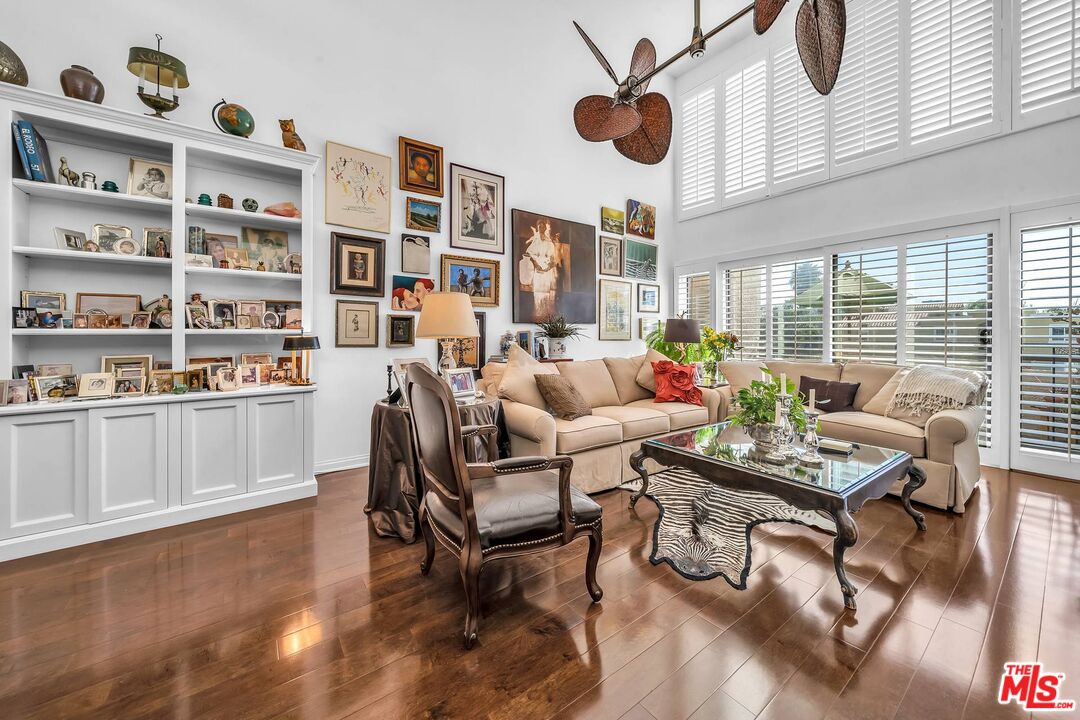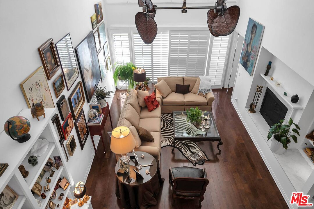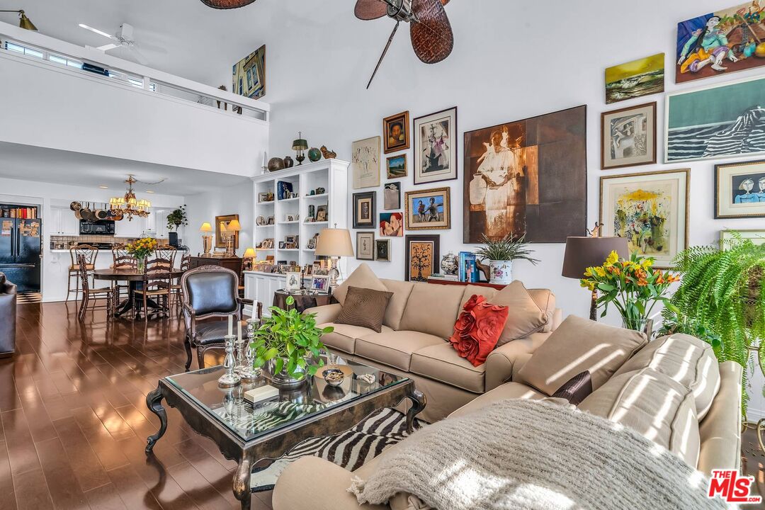 This stylish Manhattan penthouse is in a very desirable part of Los Angeles, located near a an upcoming multi-use shopping center. Upon entering this two story foyer unit with high ceilings, one feels as he/she has walked into an illustrious New York City art gallery. The main floor boasts an inviting cozy den with beautiful, large planked hardwood floors, Floor to ceiling windows and plantation shutters. Enjoy the oversized living room with fireplace and dining area with handcrafted, custom built bookshelves made to perfection. The living room is well ventilated with Tommy Bahama style, massive, ceiling fans. Charming patio also connected to the living room. The primary bedroom with high ceilings is on the main floor and features welcoming sunlight throughout as well as the lovely dressing area. This unit has generous closet space, a beautiful spa-like master bath with an oversized shower that is tastefully upgraded, a kitchen that is a chef's dream with an enormous walk-in pantry, chic, classic style black and white checkered flooring. The kitchen has raised ceiling to accommodate a large pot rack, giving ideal workspace for the true gourmet. An stylish 3/4 bath is also on this main floor. The elegant, custom black wrought iron staircase leads you to an inviting loft with a roof deck in complete privacy accompanied with a 1/2 Bath, an added bonus space, a walk-in storage area and an immense closet. The laundry closet is located strategically under the staircase for the ultimate space saving concept. This is elegance at it's BEST !