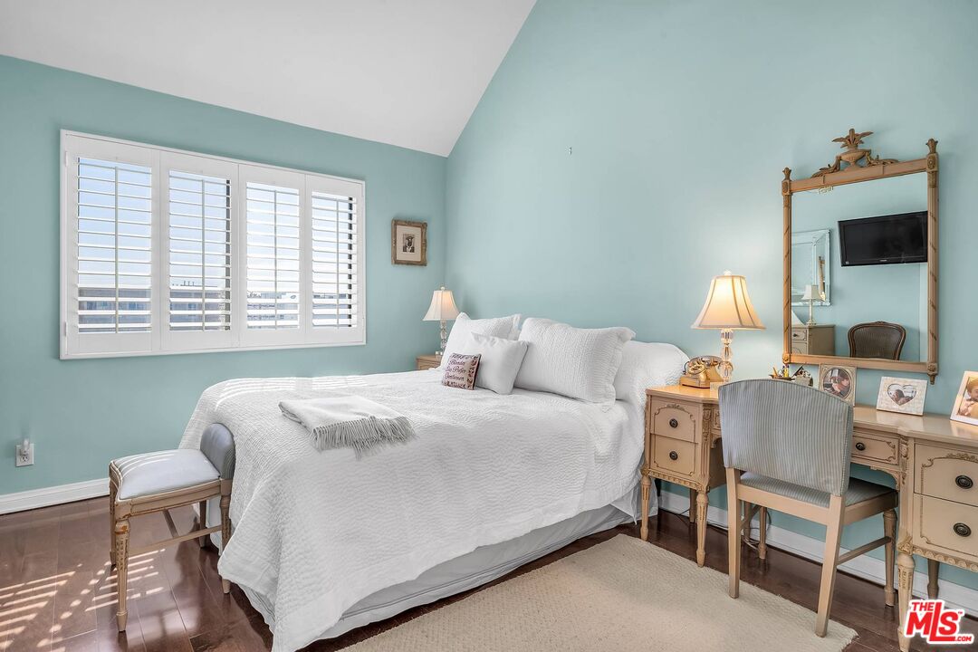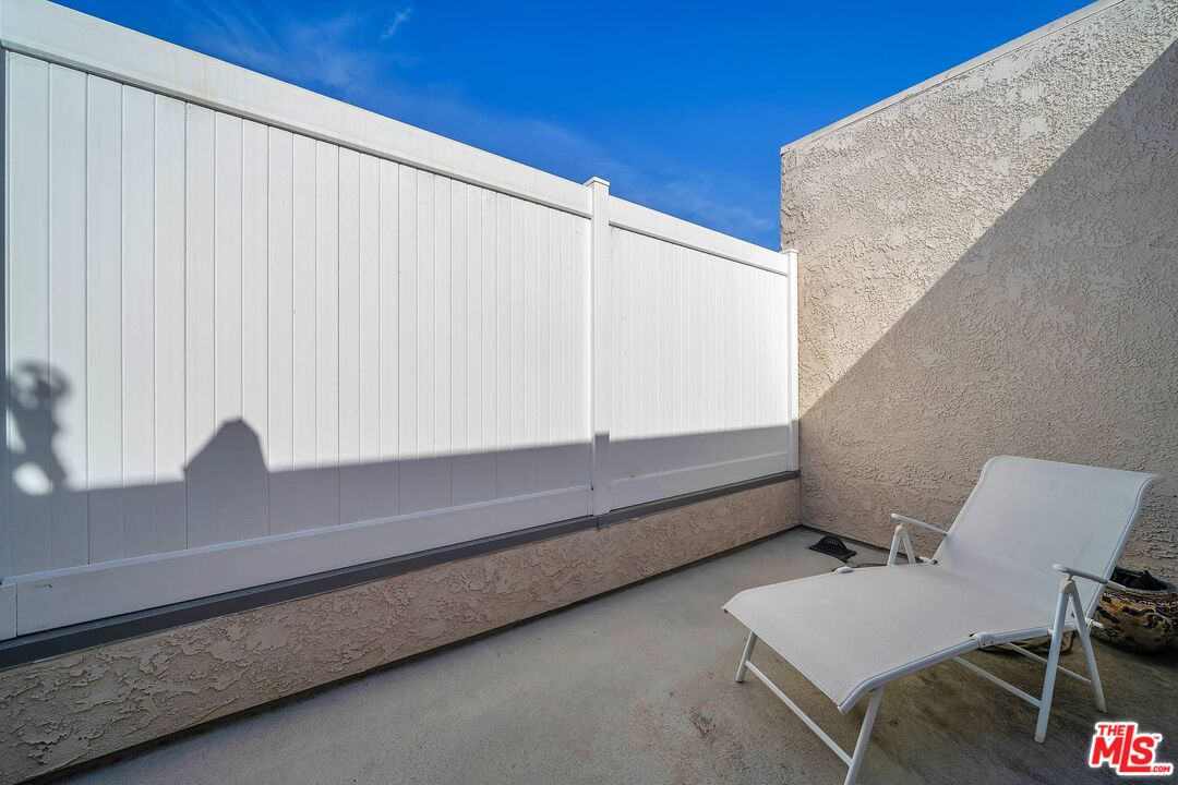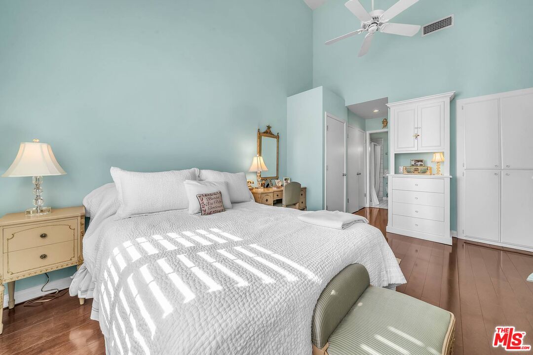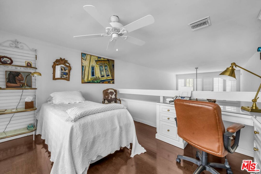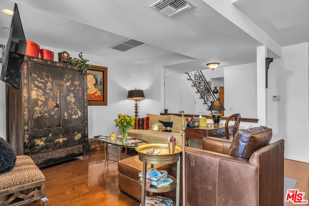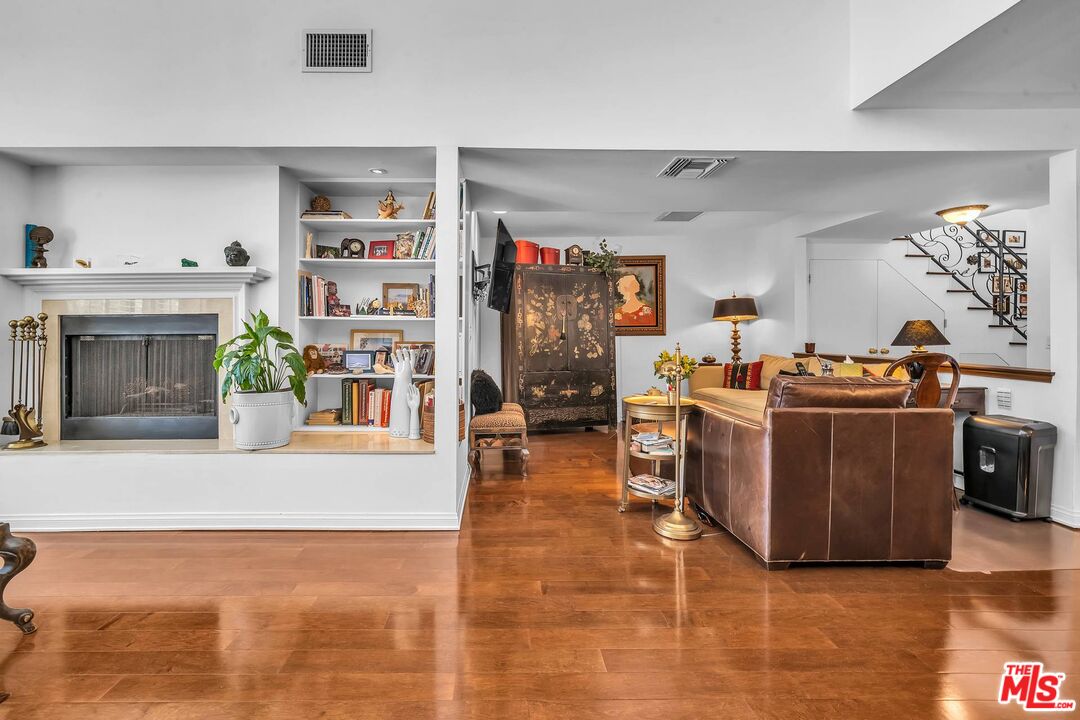 This stylish Manhattan penthouse is in a very desirable part of Los Angeles, located near a an upcoming multi-use shopping center. Upon entering this two story foyer unit with high ceilings, one feels as he/she has walked into an illustrious New York City art gallery. The main floor boasts an inviting cozy den with beautiful, large planked hardwood floors, Floor to ceiling windows and plantation shutters. Enjoy the oversized living room with fireplace and dining area with handcrafted, custom built bookshelves made to perfection. The living room is well ventilated with Tommy Bahama style, massive, ceiling fans. Charming patio also connected to the living room. The primary bedroom with high ceilings is on the main floor and features welcoming sunlight throughout as well as the lovely dressing area. This unit has generous closet space, a beautiful spa-like master bath with an oversized shower that is tastefully upgraded, a kitchen that is a chef's dream with an enormous walk-in pantry, chic, classic style black and white checkered flooring. The kitchen has raised ceiling to accommodate a large pot rack, giving ideal workspace for the true gourmet. An stylish 3/4 bath is also on this main floor. The elegant, custom black wrought iron staircase leads you to an inviting loft with a roof deck in complete privacy accompanied with a 1/2 Bath, an added bonus space, a walk-in storage area and an immense closet. The laundry closet is located strategically under the staircase for the ultimate space saving concept. This is elegance at it's BEST !
