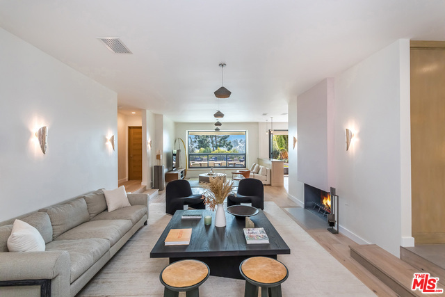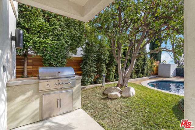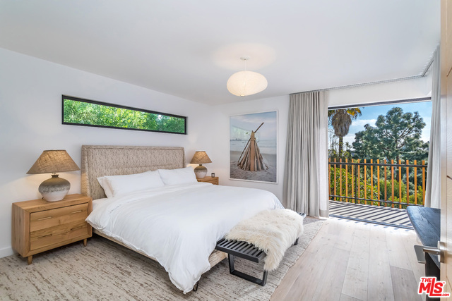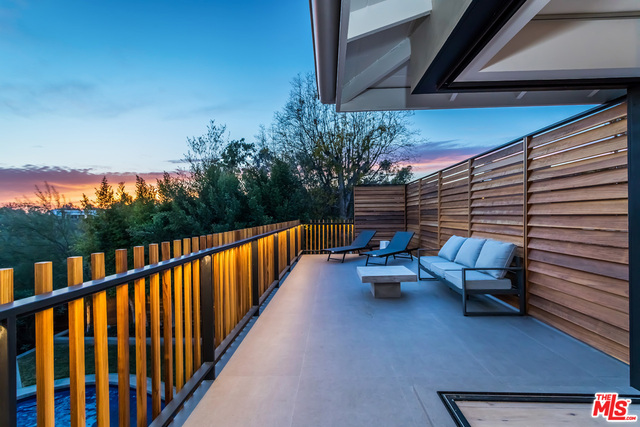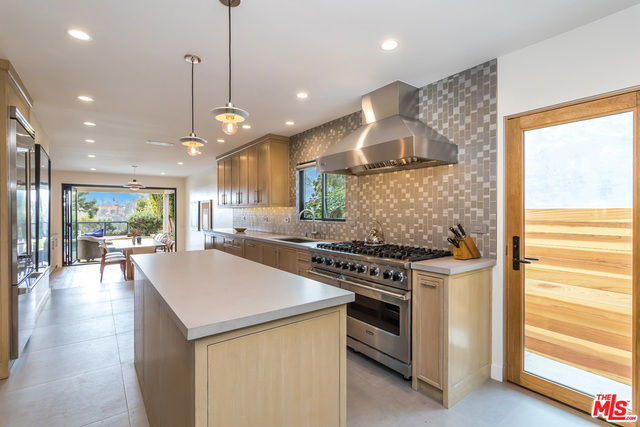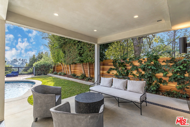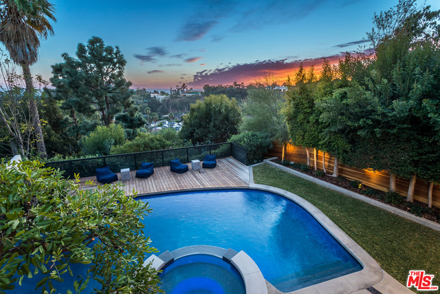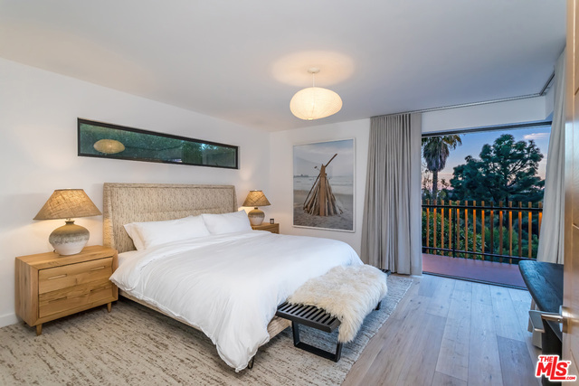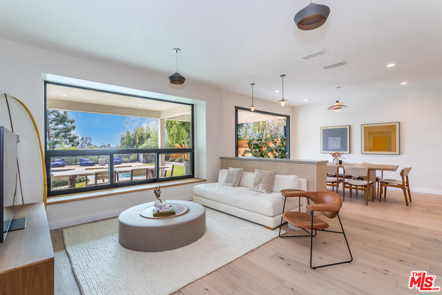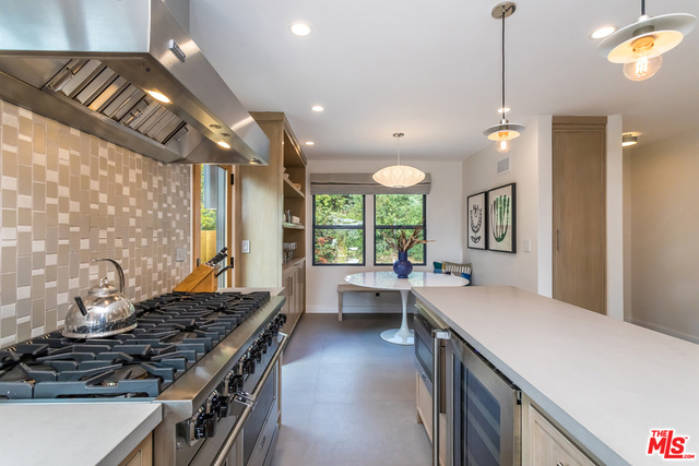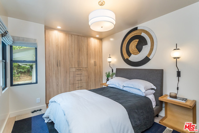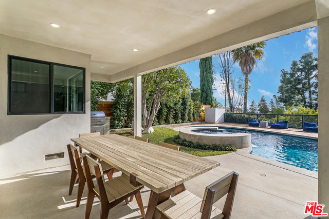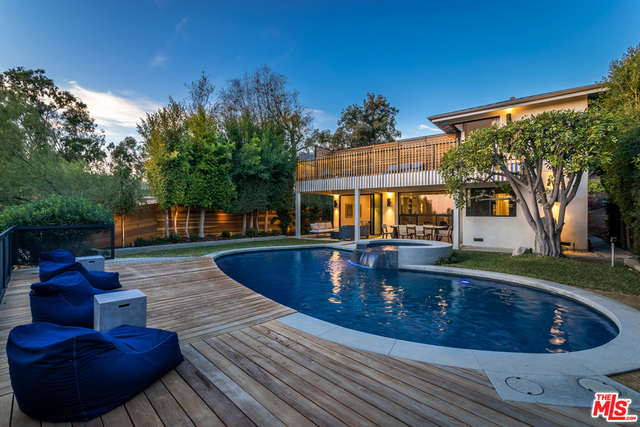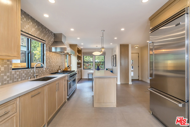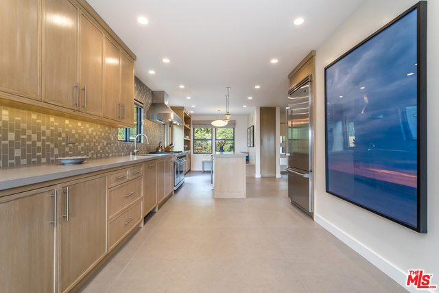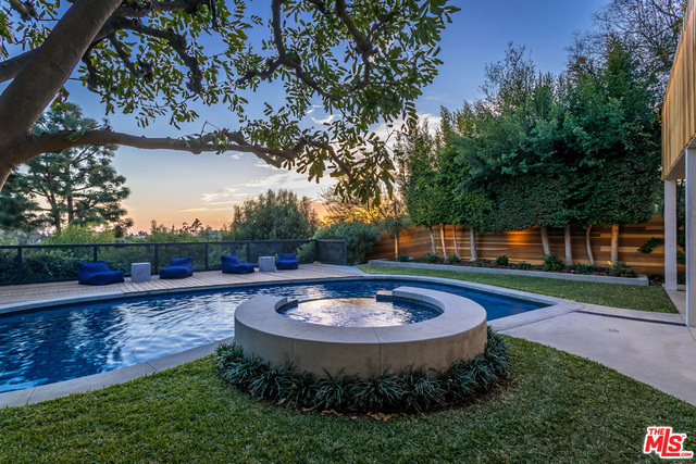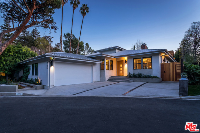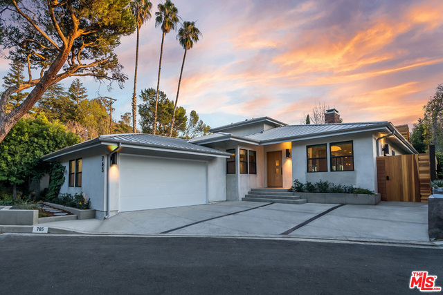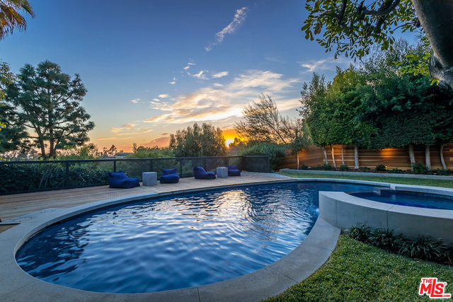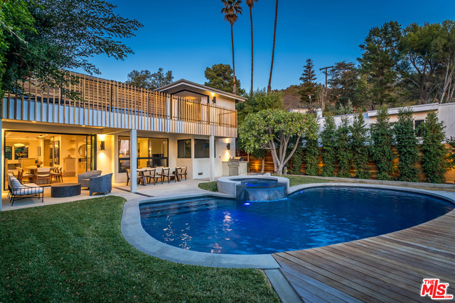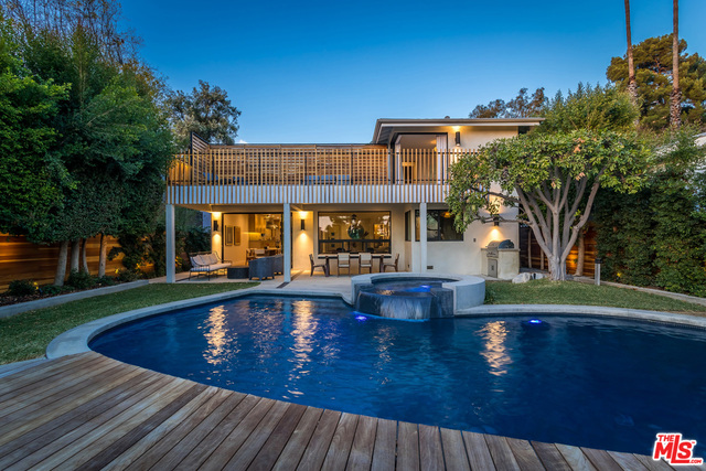 This stunning mid-century modern home on a quiet cul-de-sac just above the heart of Brentwood has been completely upgraded throughout with meticulous attention to design and detail, with every finish and texture selected for high-end form and function. Featuring four bedrooms and three baths, the open floor plan incorporates living and dining spaces with a chef's kitchen with custom backsplash tilework, Caesarstone Concrete Quartz countertops, and top-of-the-line Viking and Miele appliances, all adjacent to a sleek family room overlooking the pool and spa. The luxurious owner's suite occupies the entire second level, boasting jet-liner views, a well-appointed walk-in closet, and a spa-like bathroom with an over-sized shower, two shower heads, a bench, and a custom wrought-iron door. The seamless indoor-outdoor flow creates inviting spaces for entertaining, while expansive windows maximize sweeping City and Ocean views as well as lush, serene canyon vistas.