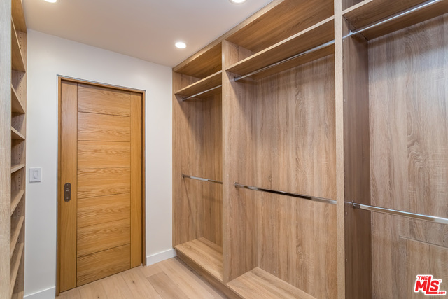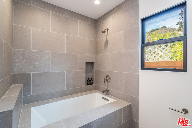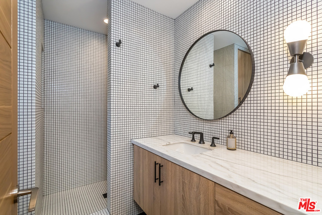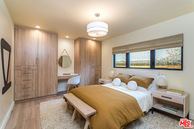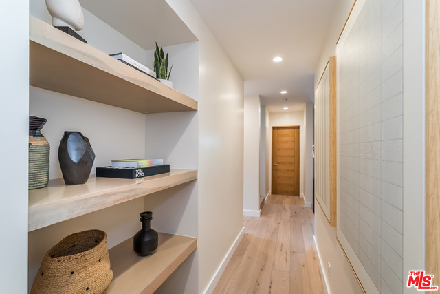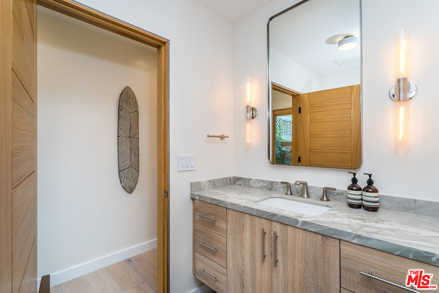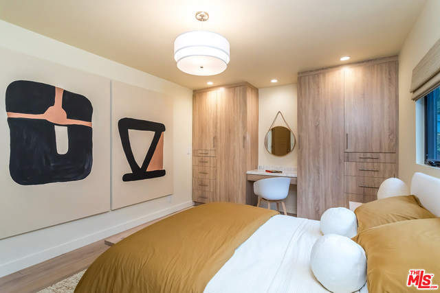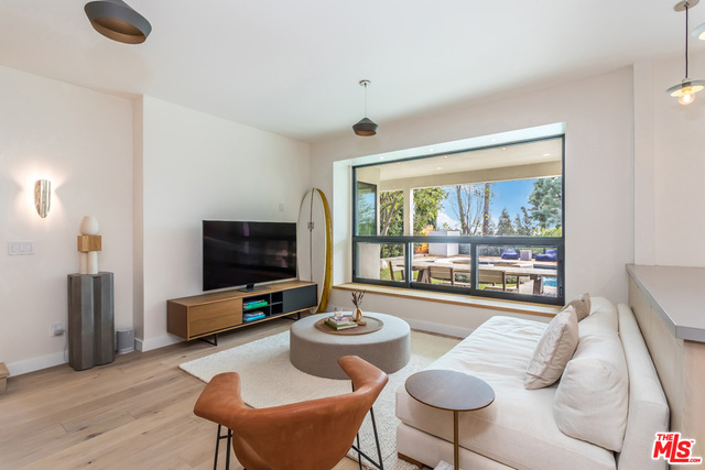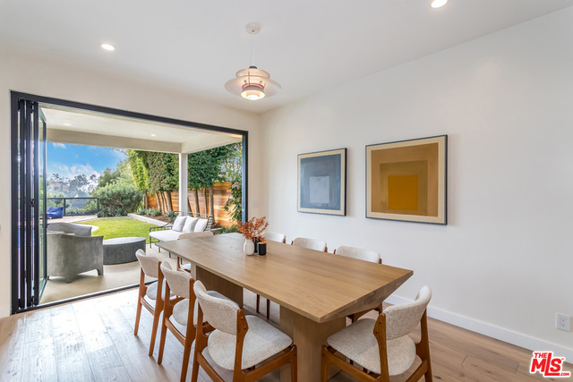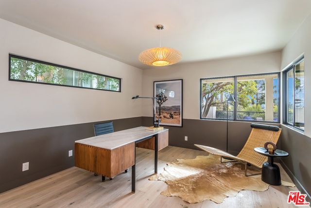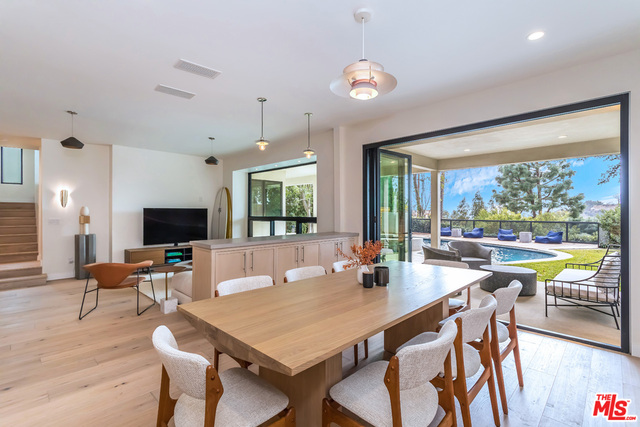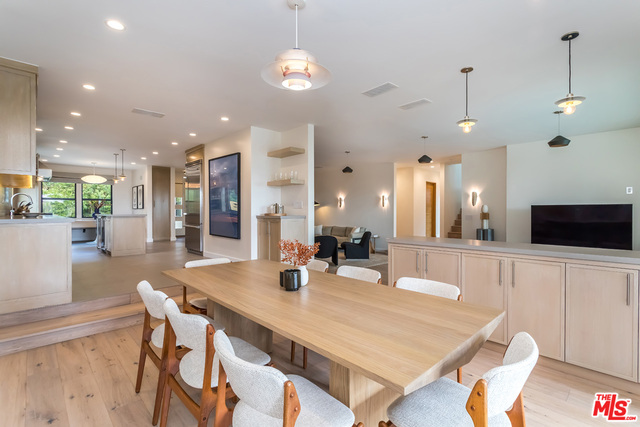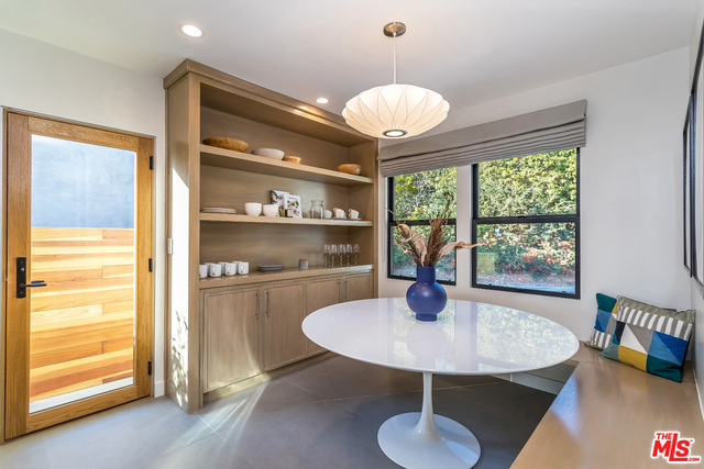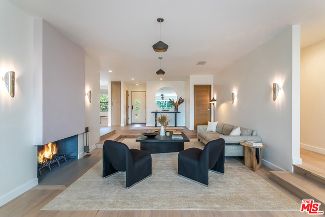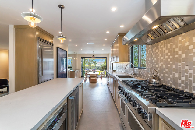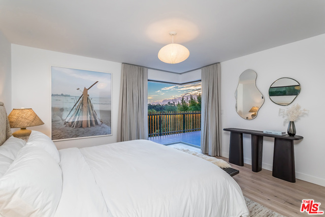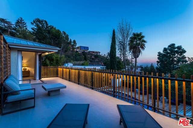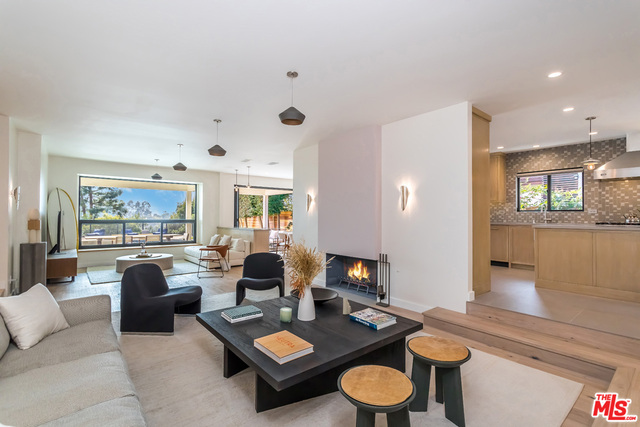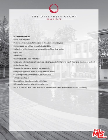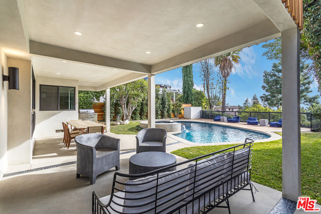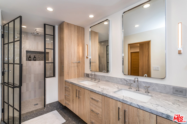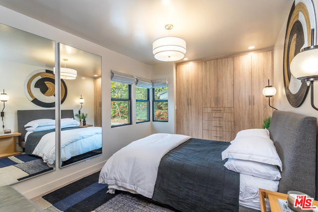 This stunning mid-century modern home on a quiet cul-de-sac just above the heart of Brentwood has been completely upgraded throughout with meticulous attention to design and detail, with every finish and texture selected for high-end form and function. Featuring four bedrooms and three baths, the open floor plan incorporates living and dining spaces with a chef's kitchen with custom backsplash tilework, Caesarstone Concrete Quartz countertops, and top-of-the-line Viking and Miele appliances, all adjacent to a sleek family room overlooking the pool and spa. The luxurious owner's suite occupies the entire second level, boasting jet-liner views, a well-appointed walk-in closet, and a spa-like bathroom with an over-sized shower, two shower heads, a bench, and a custom wrought-iron door. The seamless indoor-outdoor flow creates inviting spaces for entertaining, while expansive windows maximize sweeping City and Ocean views as well as lush, serene canyon vistas.