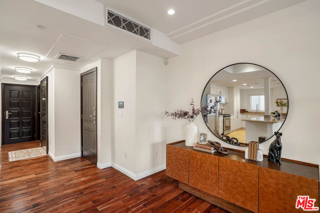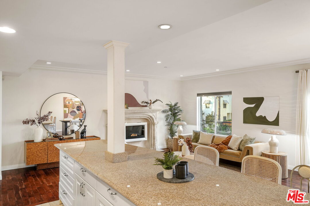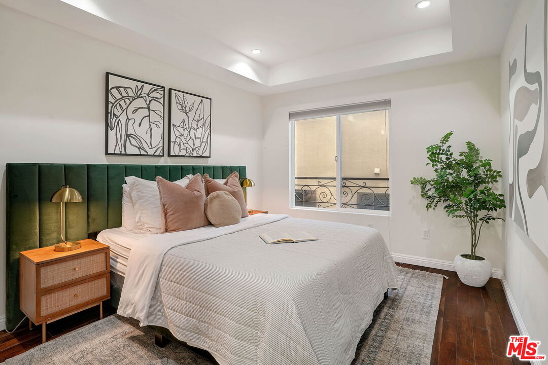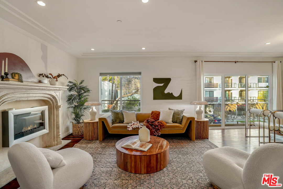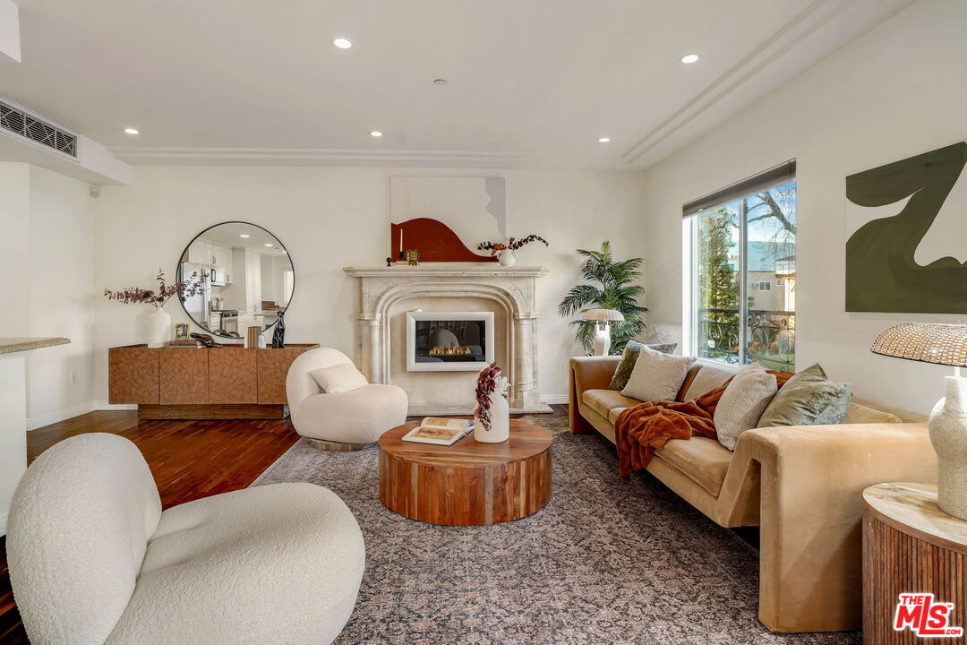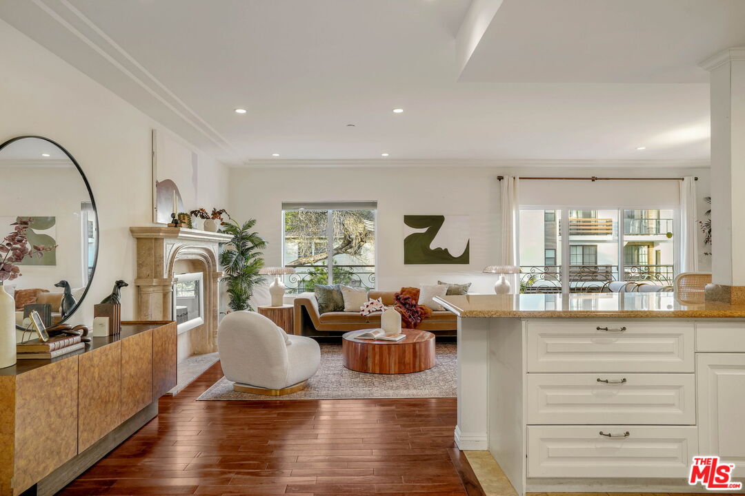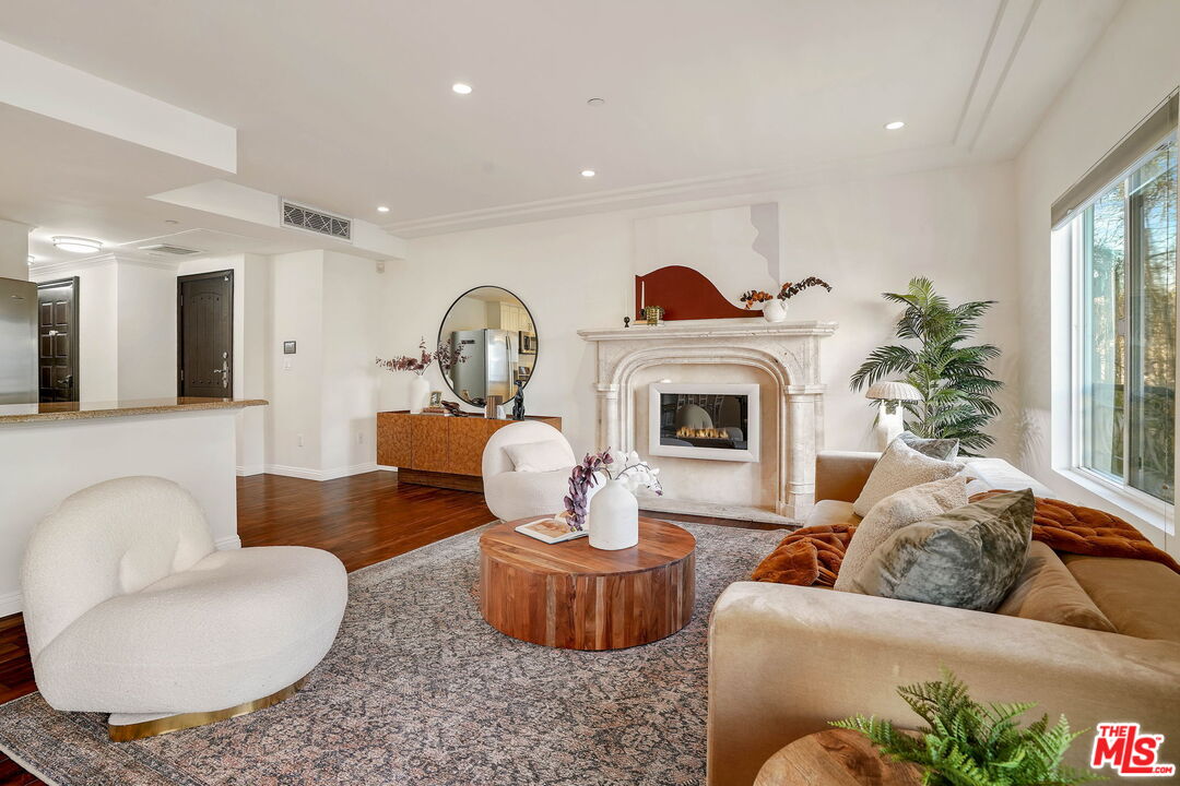 Located in a secured controlled-access building near LA's trendiest shopping centers, Cedar Sinai Hospital, and highly rated school district. An elevator leads you right to the doorstep of this sophisticated 2 bed/2 bath condo that offers incredible natural light throughout, with an open concept living, dining, and kitchen area. The spacious floor plan includes a stylish fireplace, a convenient barstool countertop for extra dining, and elegant hardwood flooring throughout the living, dining, hallway, and bedrooms. The primary bedroom features a luxurious ensuite master bath with a beautifully tiled shower, separate jetted tub, with a sink and makeup vanity combo. Not to mention the walk-in closet with plentiful storage space. The guest bathroom also features beautiful touches and features a jetted tub as well. In the hallway you will find the washer and dryer units convenient for your laundry needs. The controlled-access parking garage includes two parking spots for this unit.This one-of-a-kind unit is a must-see!