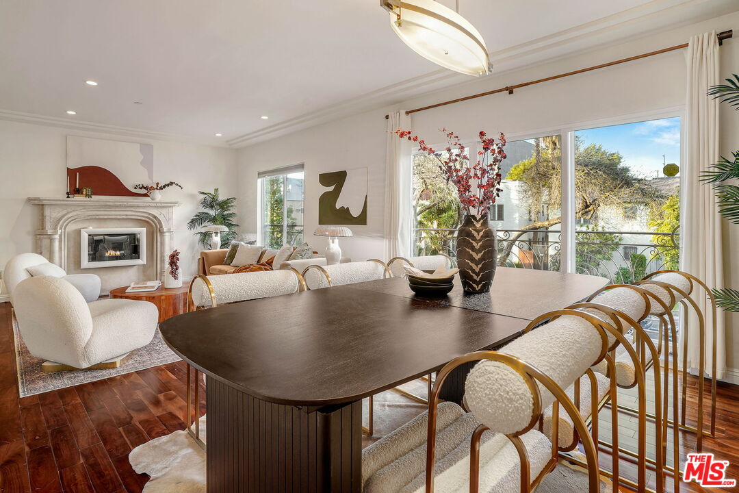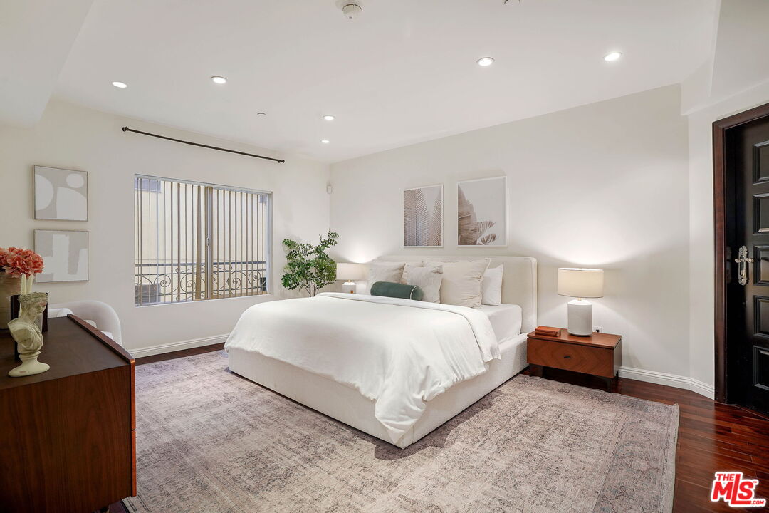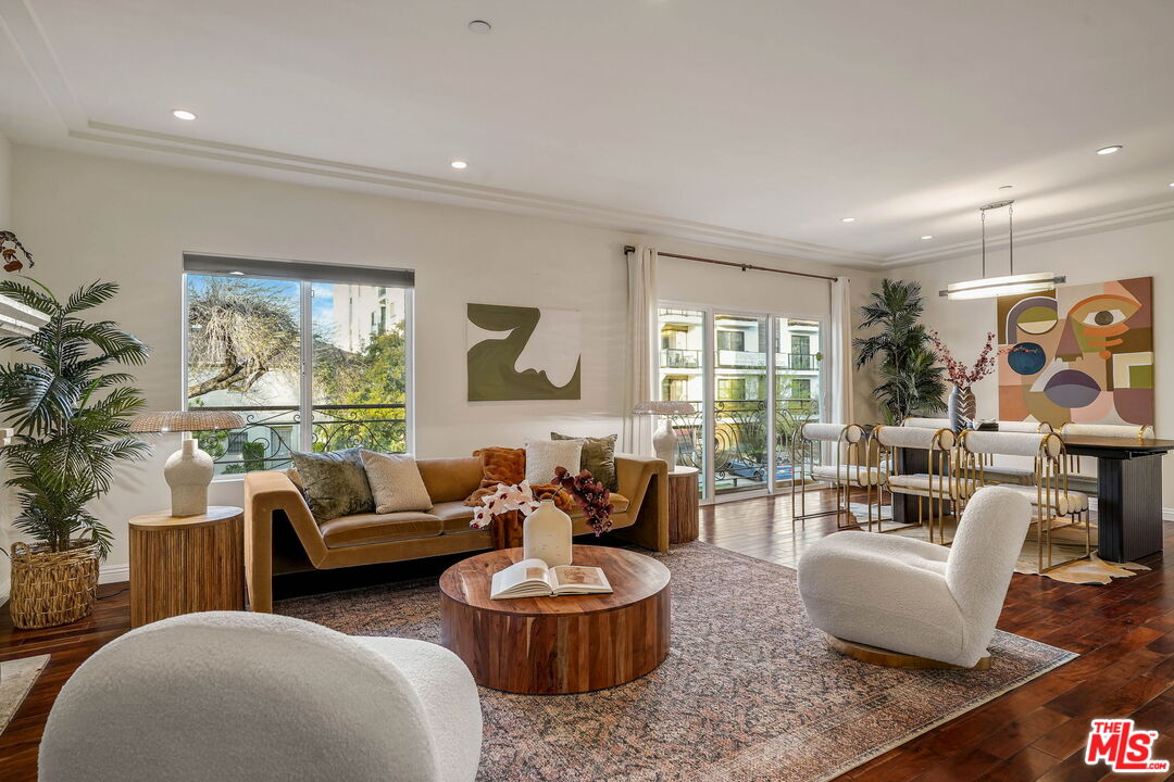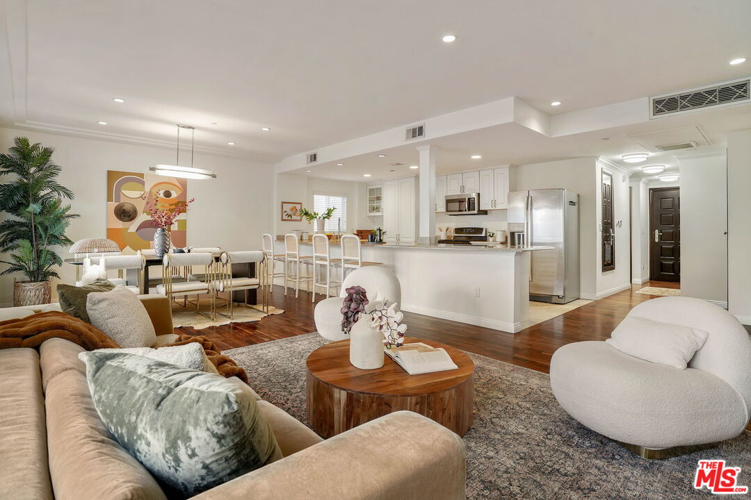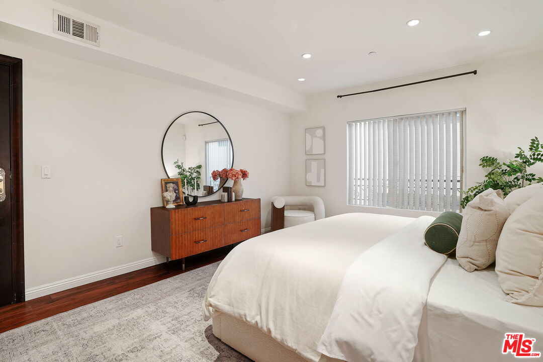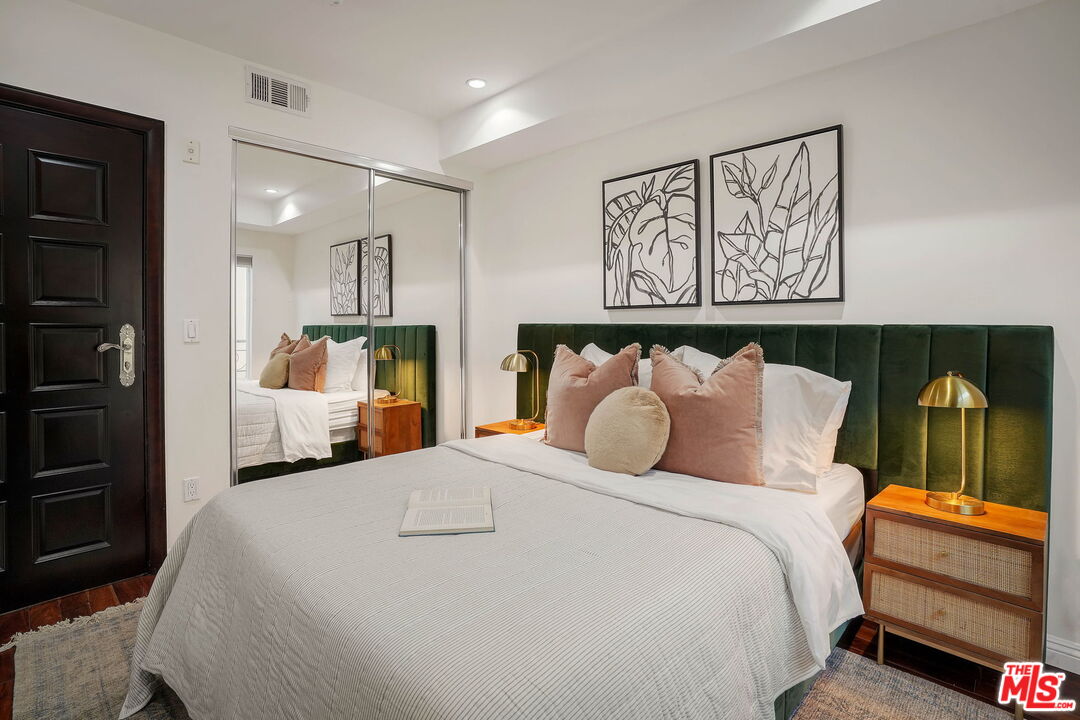 Located in a secured controlled-access building near LA's trendiest shopping centers, Cedar Sinai Hospital, and highly rated school district. An elevator leads you right to the doorstep of this sophisticated 2 bed/2 bath condo that offers incredible natural light throughout, with an open concept living, dining, and kitchen area. The spacious floor plan includes a stylish fireplace, a convenient barstool countertop for extra dining, and elegant hardwood flooring throughout the living, dining, hallway, and bedrooms. The primary bedroom features a luxurious ensuite master bath with a beautifully tiled shower, separate jetted tub, with a sink and makeup vanity combo. Not to mention the walk-in closet with plentiful storage space. The guest bathroom also features beautiful touches and features a jetted tub as well. In the hallway you will find the washer and dryer units convenient for your laundry needs. The controlled-access parking garage includes two parking spots for this unit.This one-of-a-kind unit is a must-see!