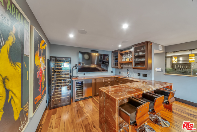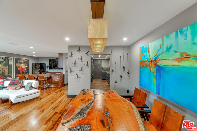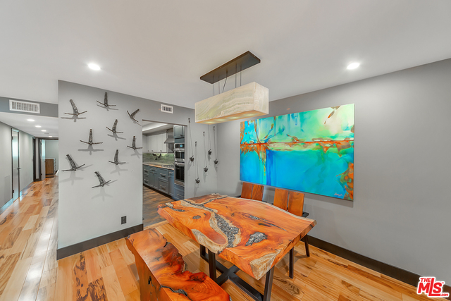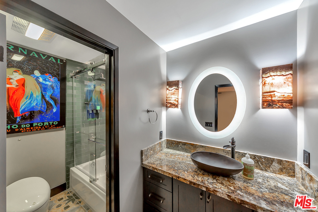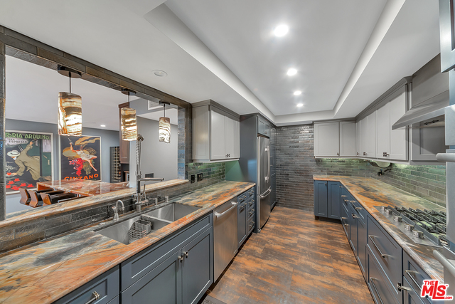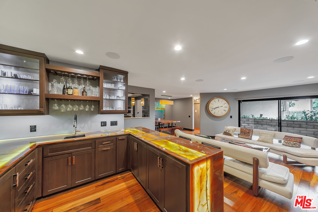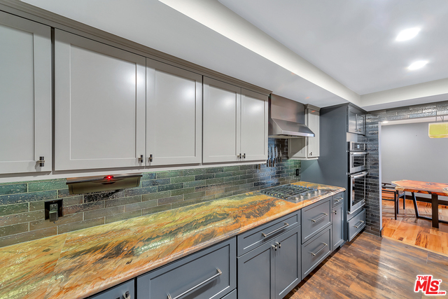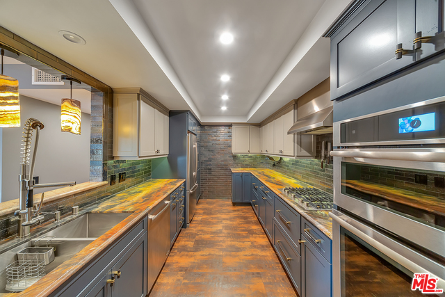 $250,000 remodeled one of a kind condo, 1 block off Ventura Blvd within walking distance to shops, restaurants, gyms, and entertainment. Kitchen includes handmade imported Italian tile, new top-of-the-line appliances, custom wood cabinetry, one-of-a-kind onyx light fixtures, and under the cabinet kitchen lighting. Master Bathroom has granite vessel sink and LED lit faucets. Both bathrooms include smart toilets, handmade Italian tile, and lighted mirrors. Master Bedroom includes grand built out walk in closet with dual wall safes. Unit also boasts a $40,000 custom built onyx back lit Wet Bar with LED lit faucet. Other features include REAL Tigerwood flooring throughout, brand new heating & AC system, $4,000 custom surround sound system in the bar and living room, new washer & dryer, custom hand built cabinets with unique custom built door pulls imported from Europe, Hardwired ADT security system, and one-of-a-kind onyx dining room chandelier. No other condo unit in the valley compares!