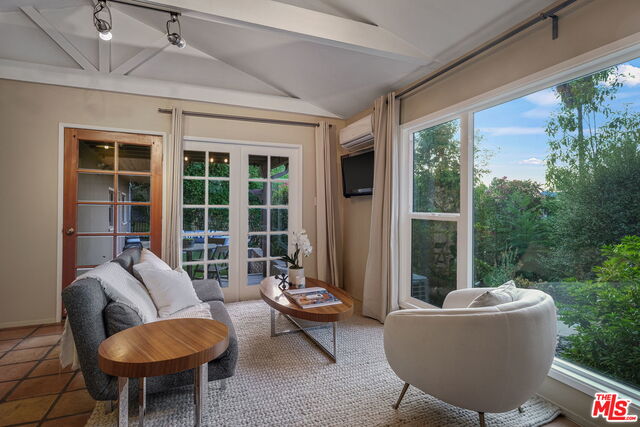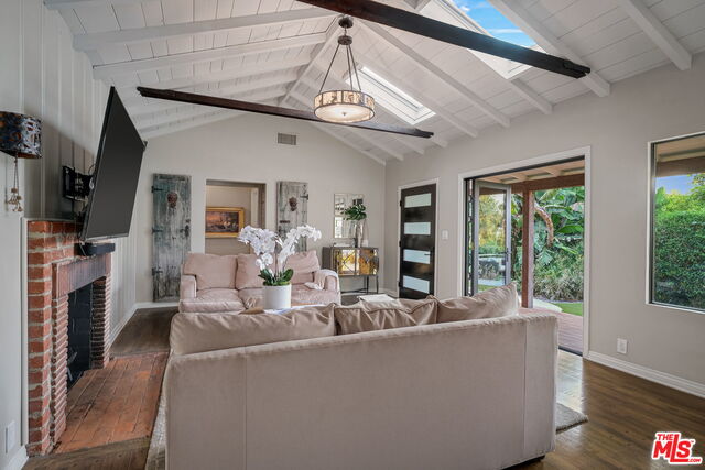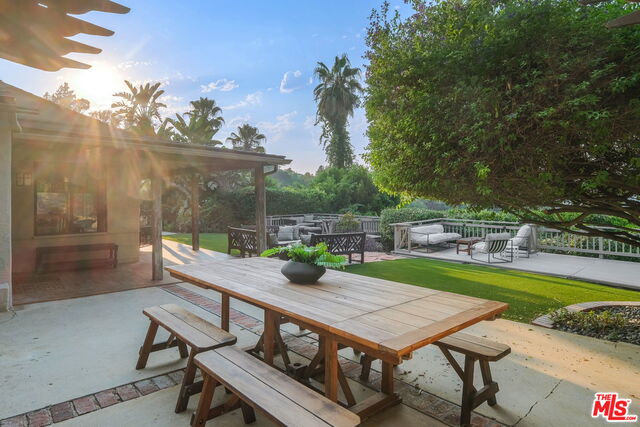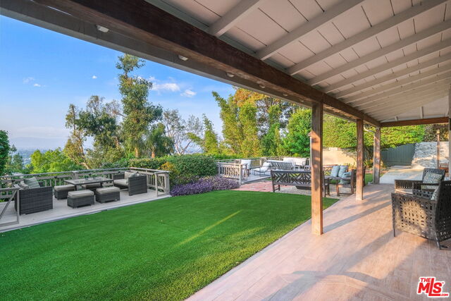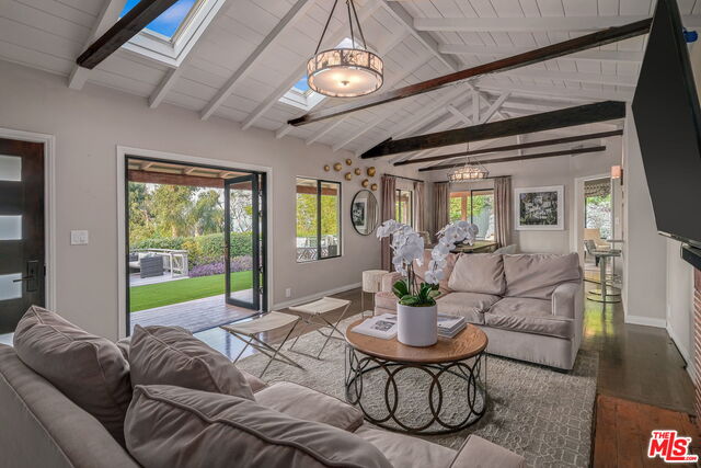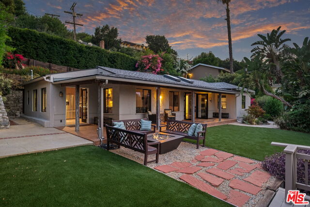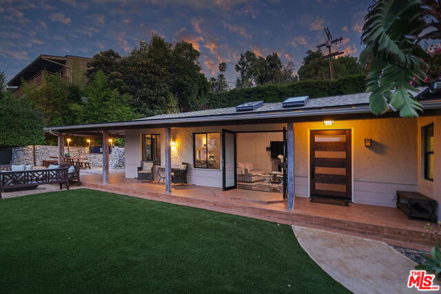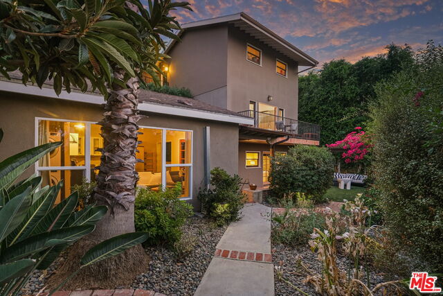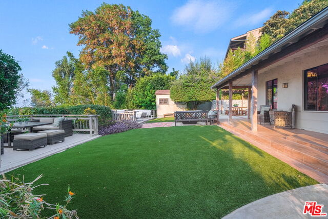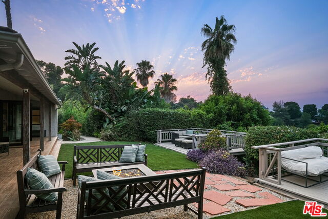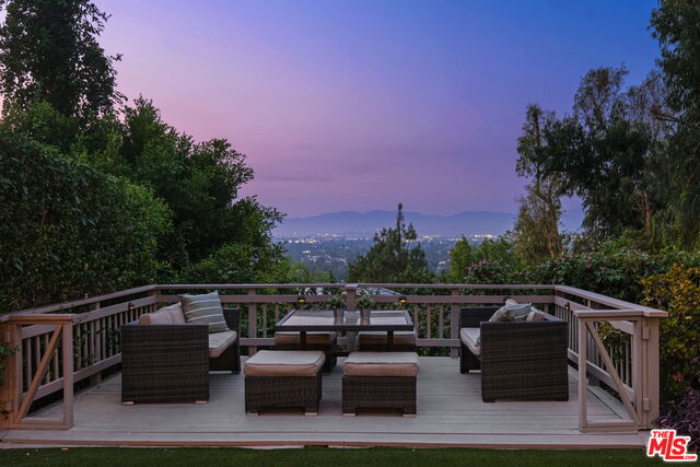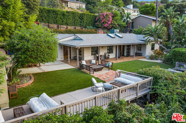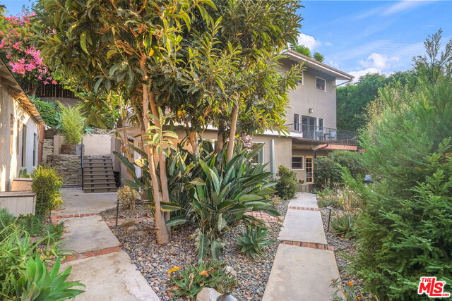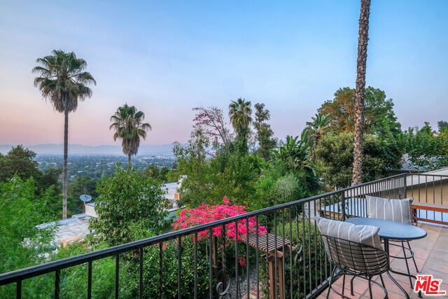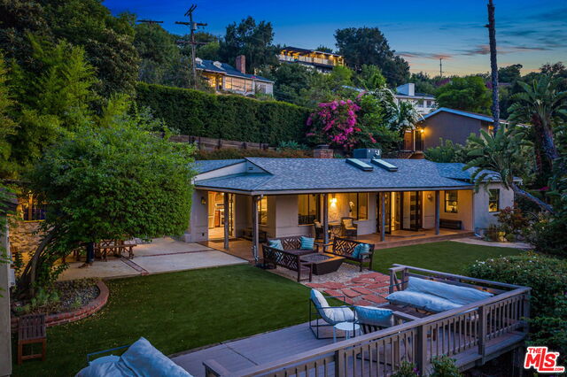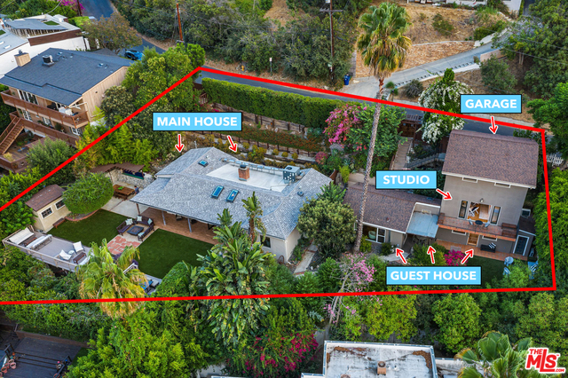 Set privately in the hills of Studio City, this unique and charming estate boasts panoramic city and canyon views and three separate residences. The three-bedroom main house offers a single level open floor plan with vaulted wood-beamed ceilings, chef's kitchen with breakfast nook, and pantry. The living and dining areas open to a massive yard overlooking the city, with plentiful entertaining space, multiple decks for outdoor dining, a fire-pit, and a separate structure for an office/gym. The one-bedroom guest apartment boasts its own private grass yard with pergola and draping bougainvillea. A smaller guest studio has a charming balcony overlooking the city lights. This resort-style estate, with its lush landscaping, multiple flat yards and stunning views, provides a tranquil and unique setting for the most discerning buyer. Three separate residences provide significant rental potential.