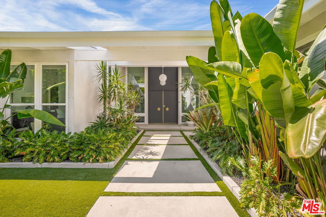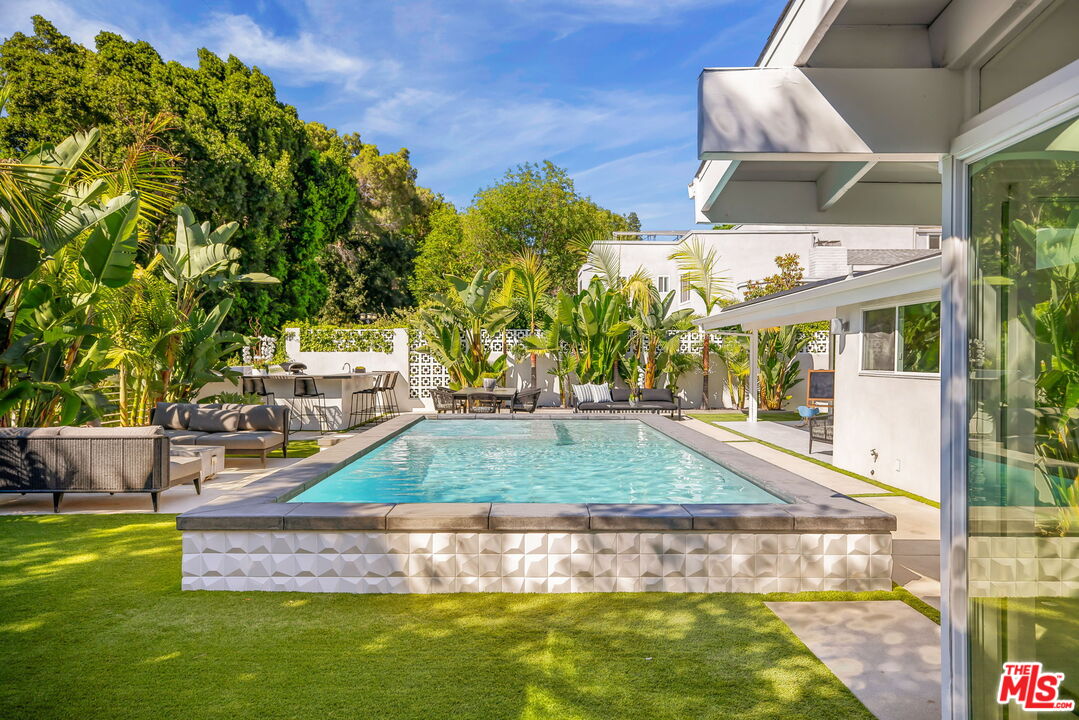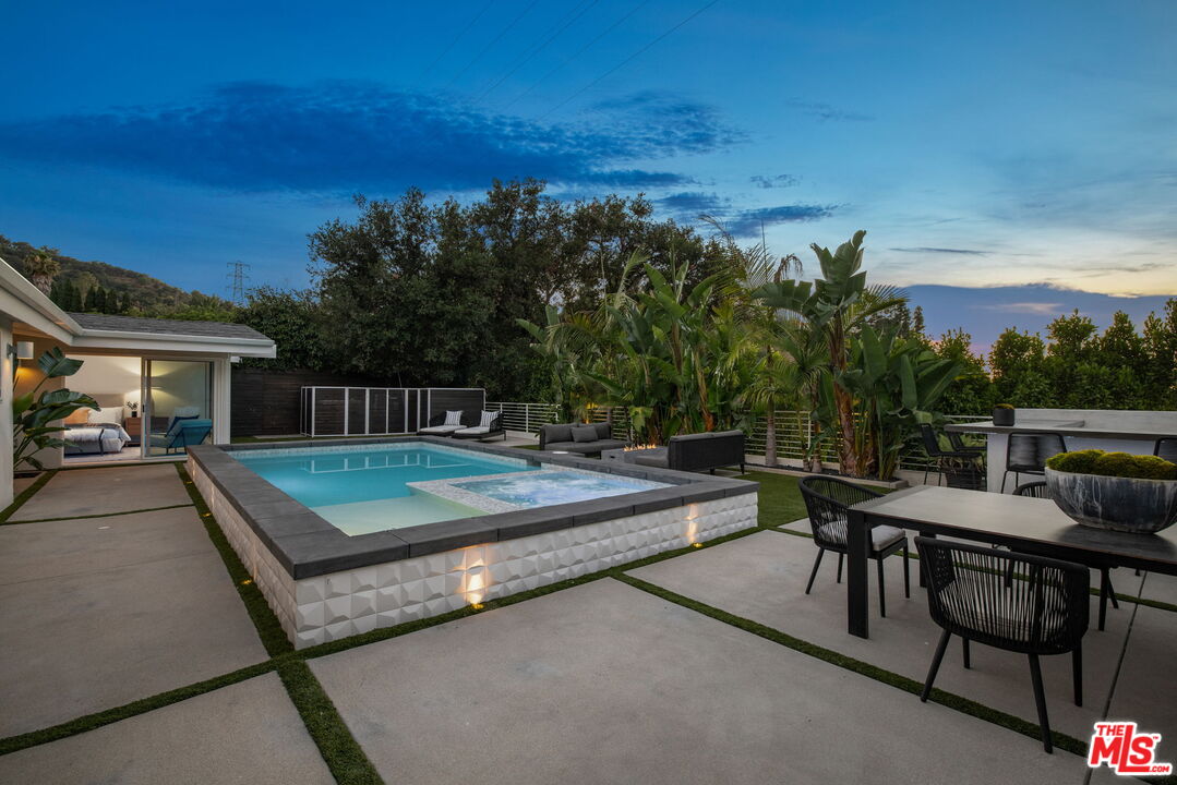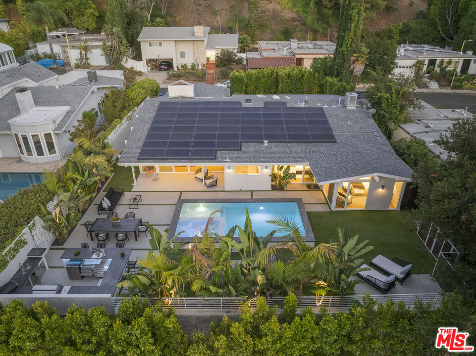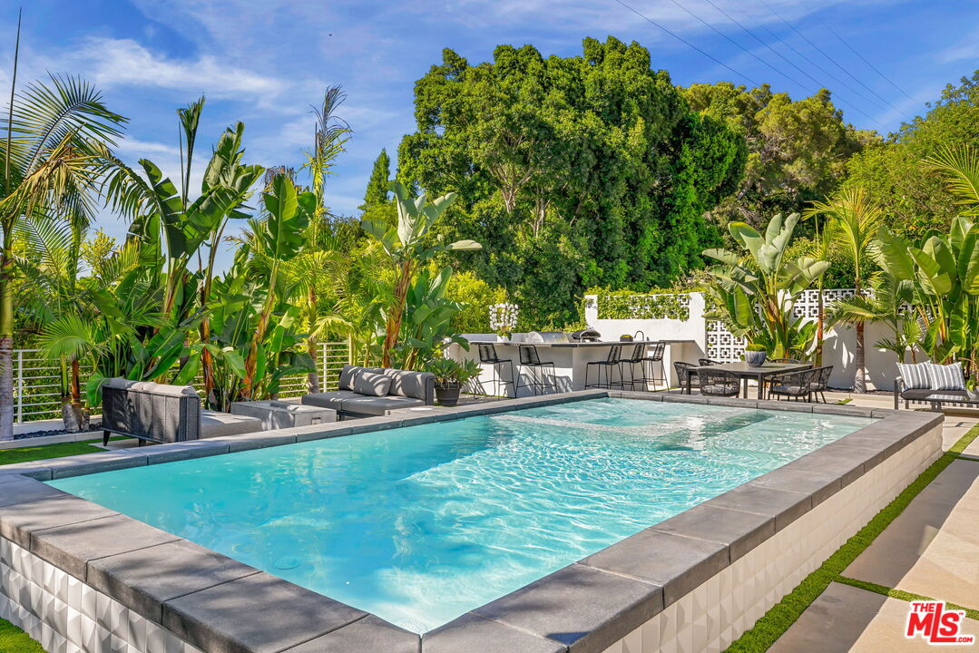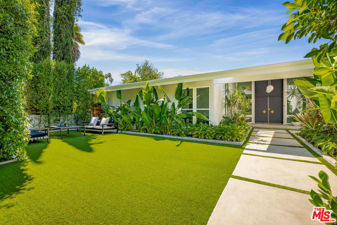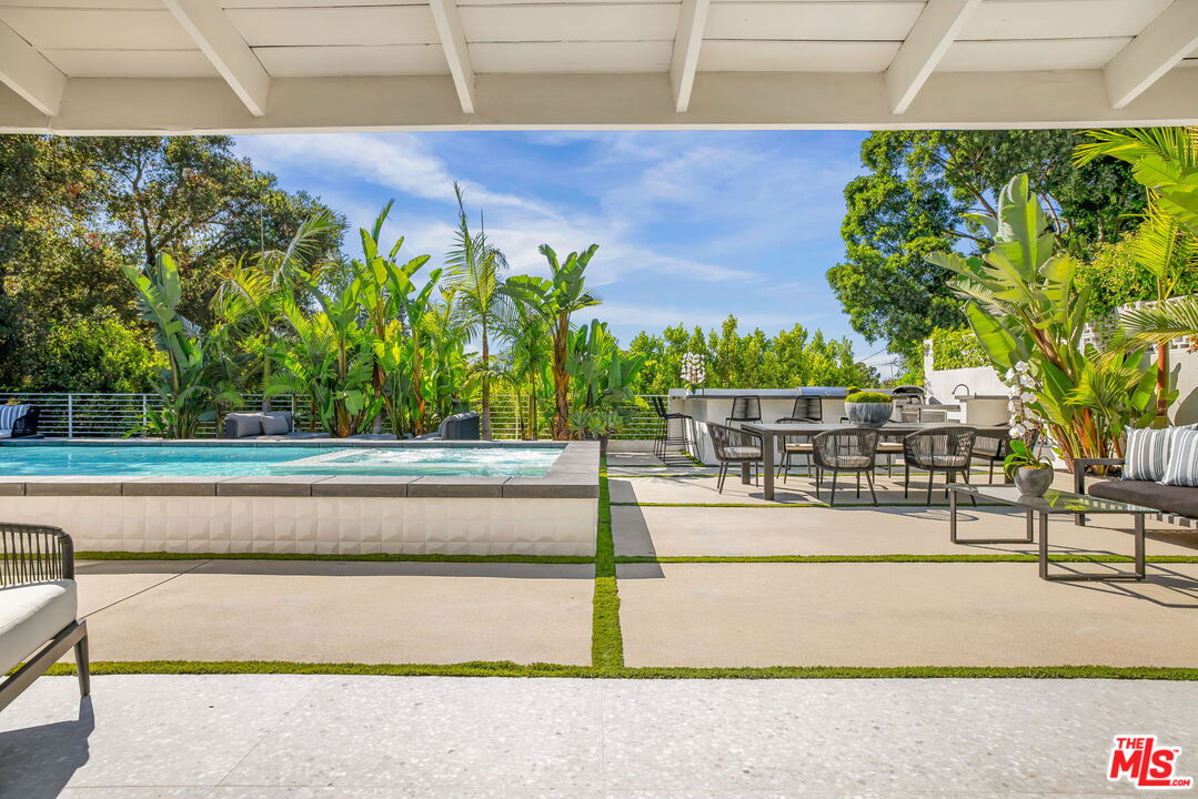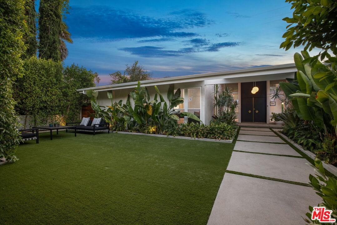 Renovated 1960s single-story Midcentury is epitome of southern California chic. Living room offers exposed beams & is anchored by stone fireplace & floor to ceiling windows. Kitchen counter tops & island w/ bar seating utilize Taj Mahal stone w/ waterfall edge & integrated sink. European white oak floors run throughout. But the real star is the saltwater pool, spa & Baja bench. Hybrid pool filtration & heater ensures you enjoy pool in no time & maintain perfect comfort. If outdoor cooking is your passion, kitchen offers bar seating for at least 8, BBQ, 2 refrigerators, pizza oven, gas burners & sink. And the front yard? Owner transformed it into a turf field, perfect for kids outdoor activities. Need more space? Detached garage is primed for ADU conversion. Compound is gated & hedged ensuring privacy. What's more, home is a Tesla lover's dream w/ 4 power walls & solar. Only minutes from premiere schools like Harvard Westlake, Campbell Hall, Carpenter Elementary plus upscale amenities like Equinox, Erewhon & Sushi Row.
