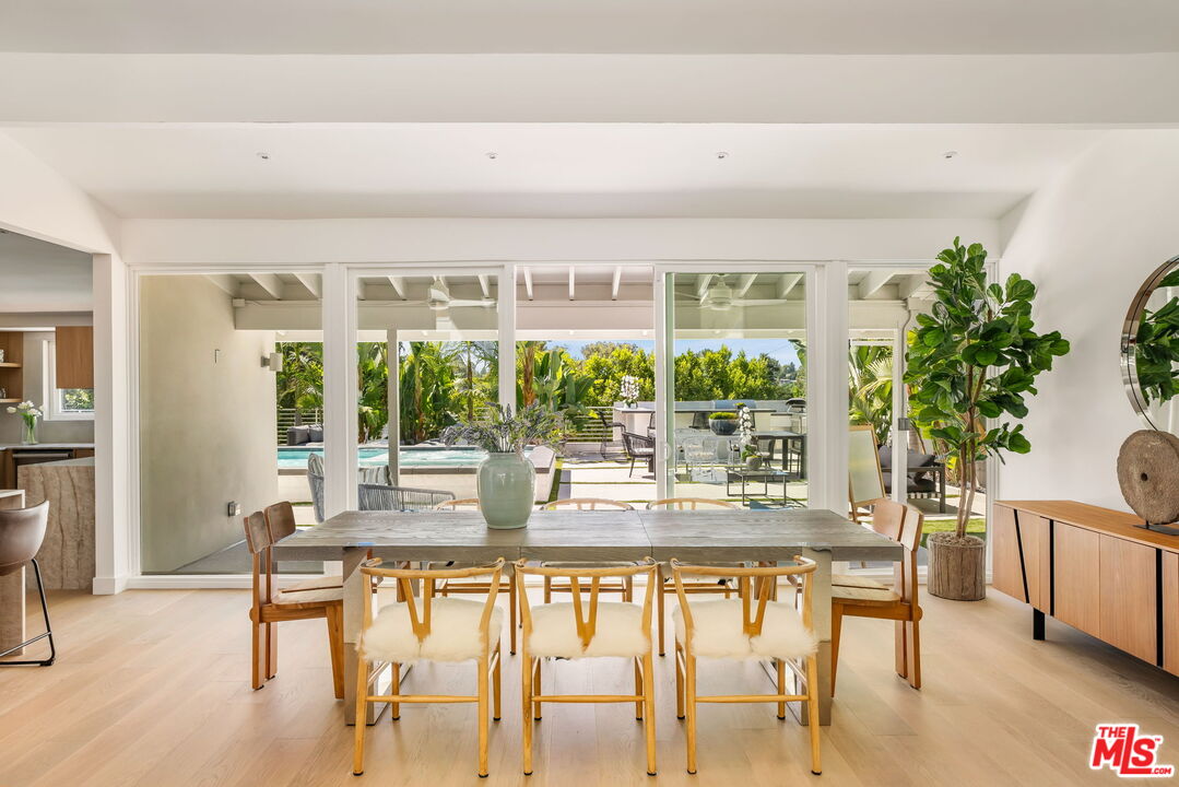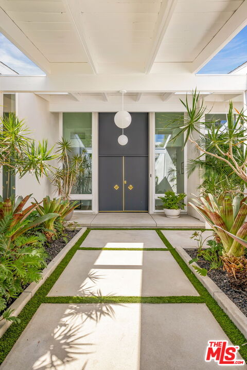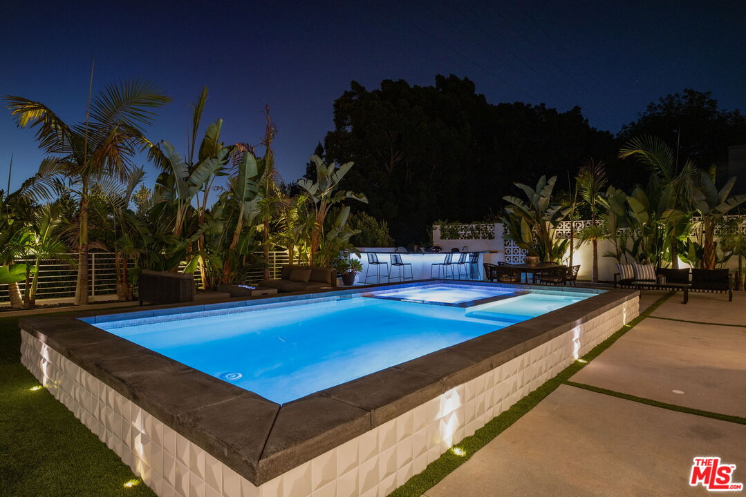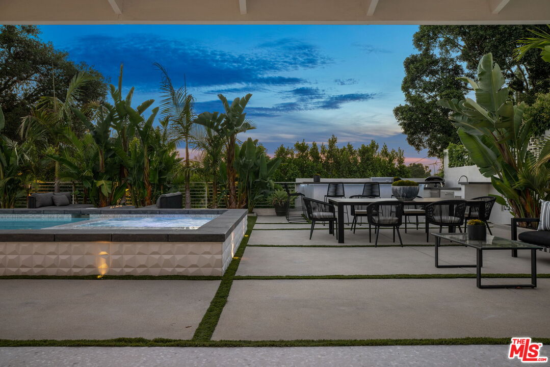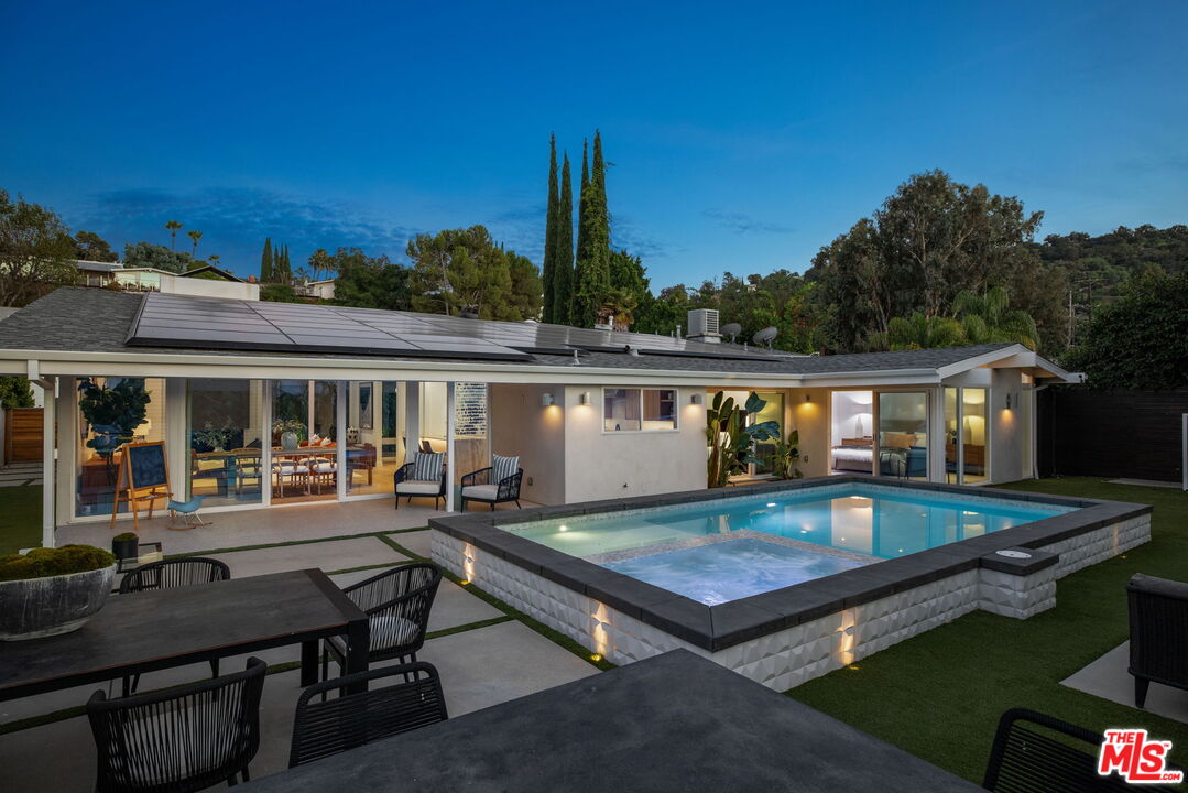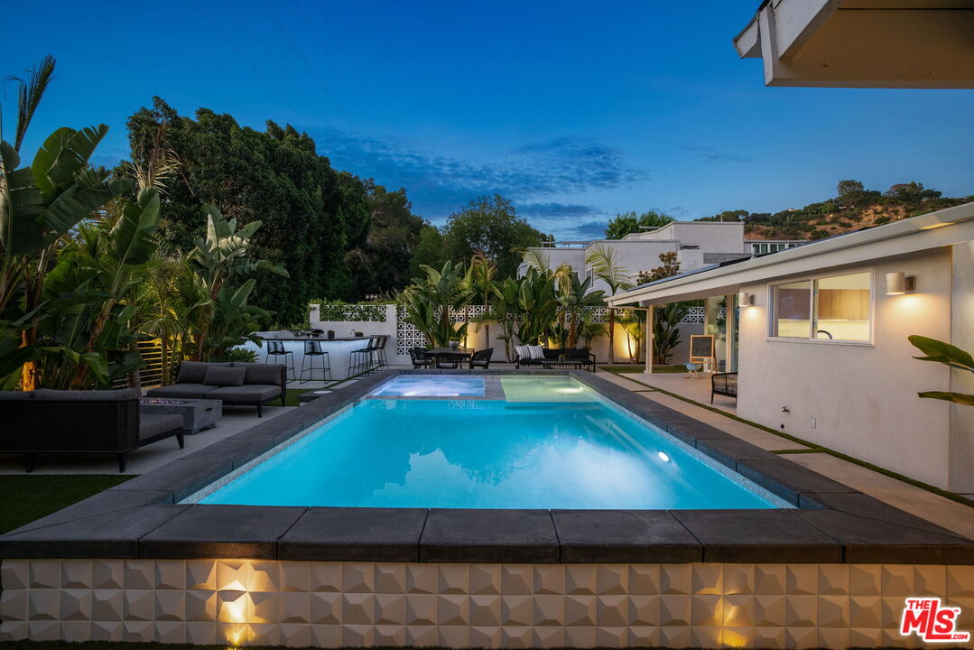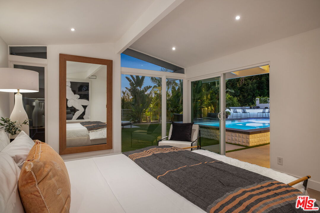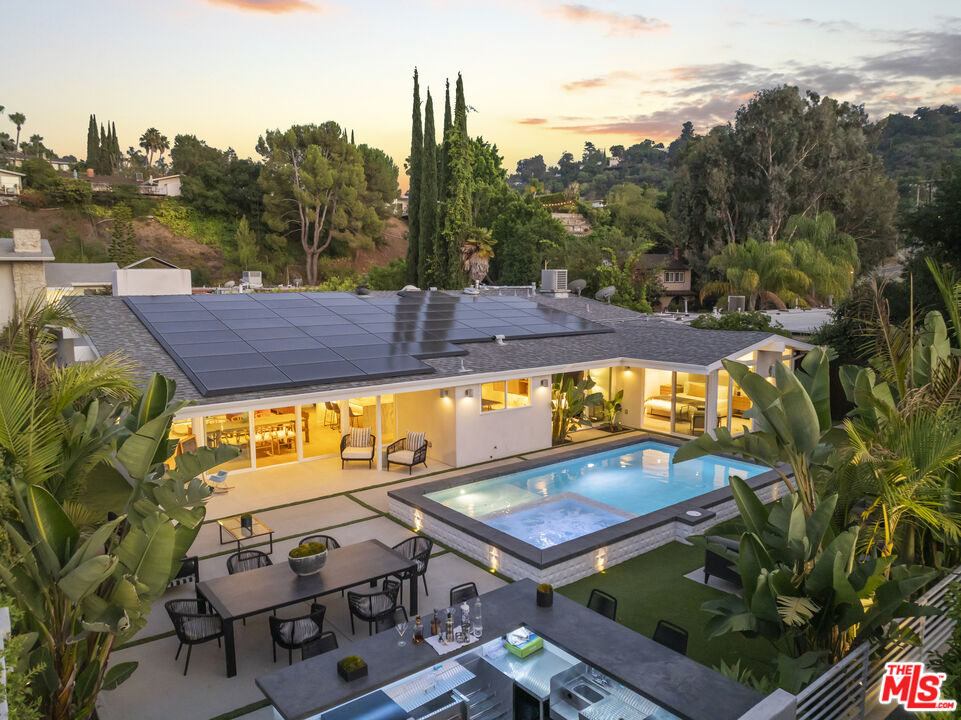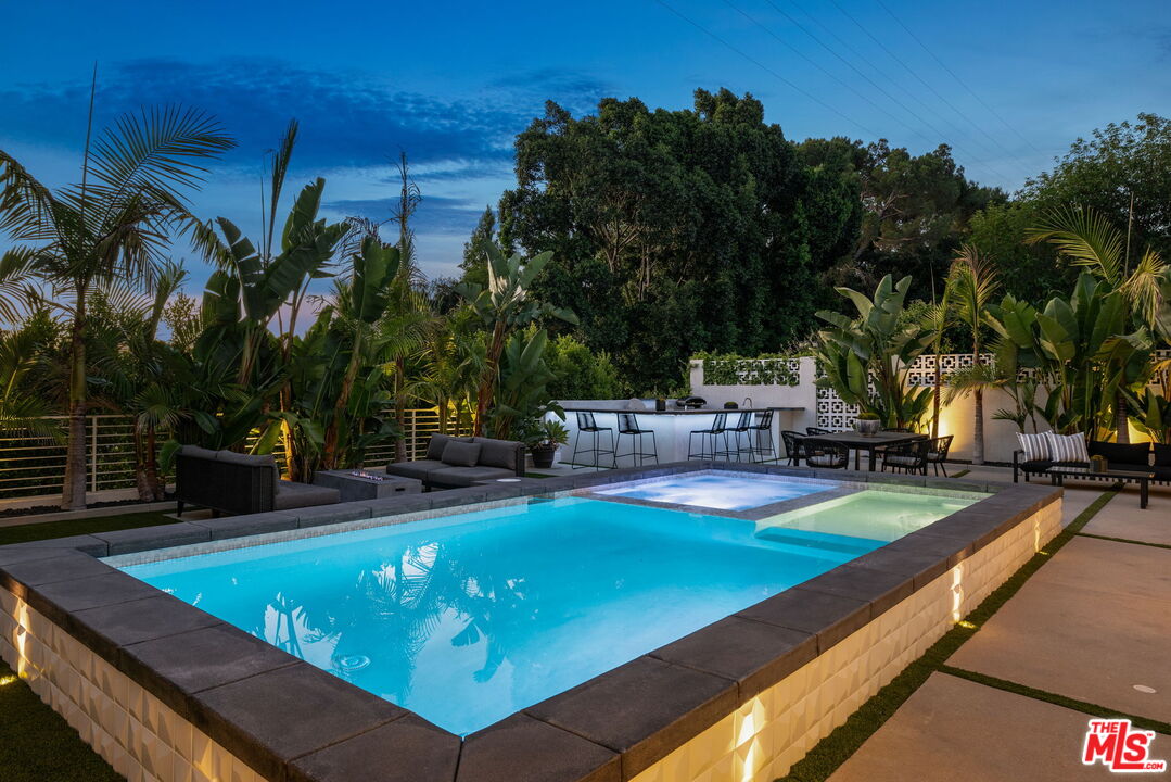 Renovated 1960s single-story Midcentury is epitome of southern California chic. Living room offers exposed beams & is anchored by stone fireplace & floor to ceiling windows. Kitchen counter tops & island w/ bar seating utilize Taj Mahal stone w/ waterfall edge & integrated sink. European white oak floors run throughout. But the real star is the saltwater pool, spa & Baja bench. Hybrid pool filtration & heater ensures you enjoy pool in no time & maintain perfect comfort. If outdoor cooking is your passion, kitchen offers bar seating for at least 8, BBQ, 2 refrigerators, pizza oven, gas burners & sink. And the front yard? Owner transformed it into a turf field, perfect for kids outdoor activities. Need more space? Detached garage is primed for ADU conversion. Compound is gated & hedged ensuring privacy. What's more, home is a Tesla lover's dream w/ 4 power walls & solar. Only minutes from premiere schools like Harvard Westlake, Campbell Hall, Carpenter Elementary plus upscale amenities like Equinox, Erewhon & Sushi Row.