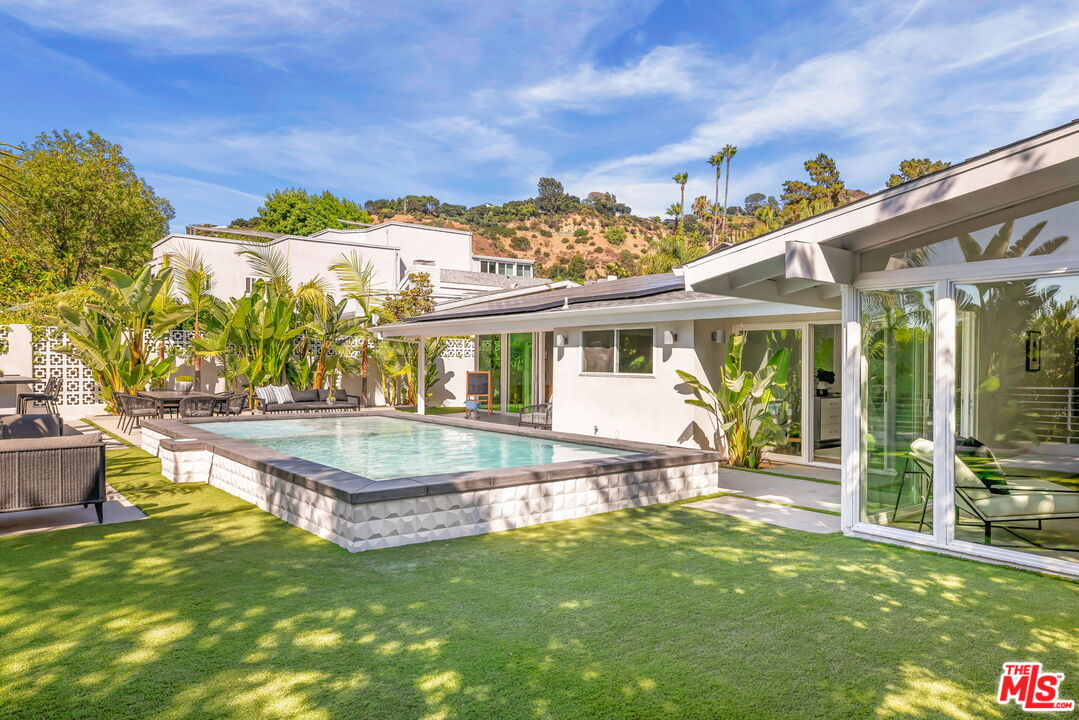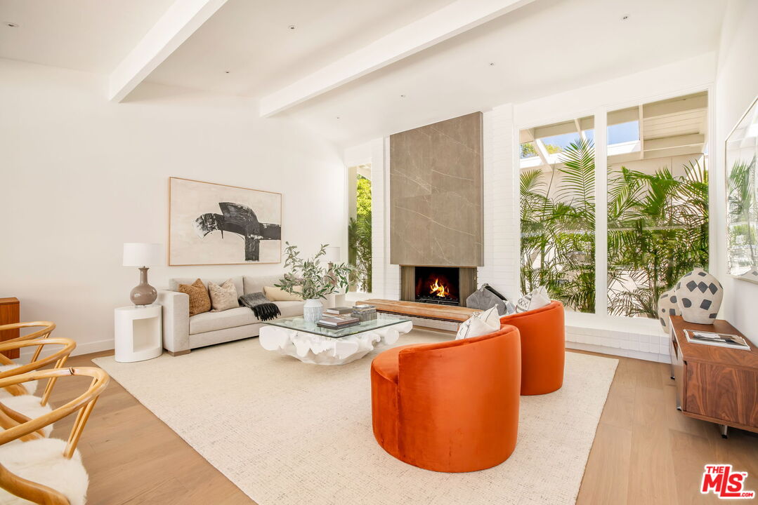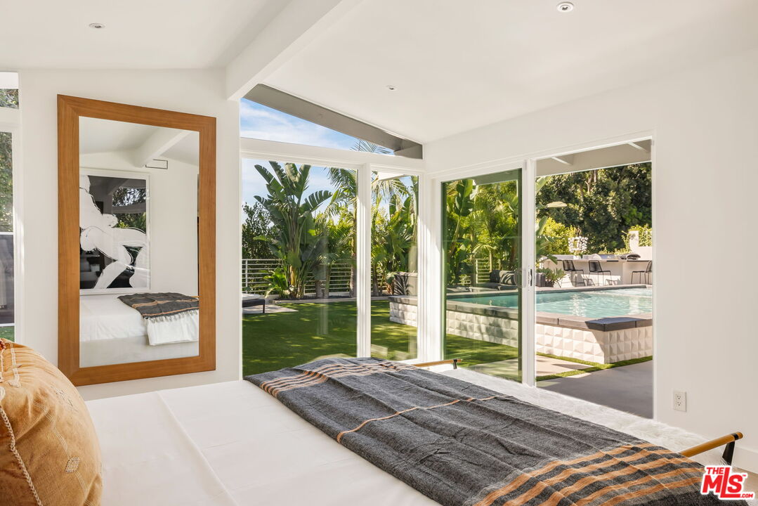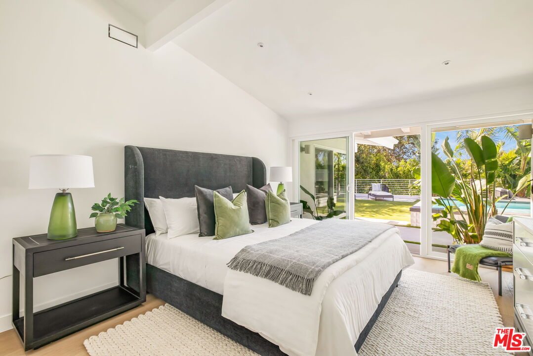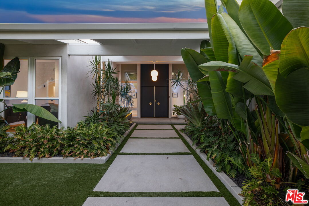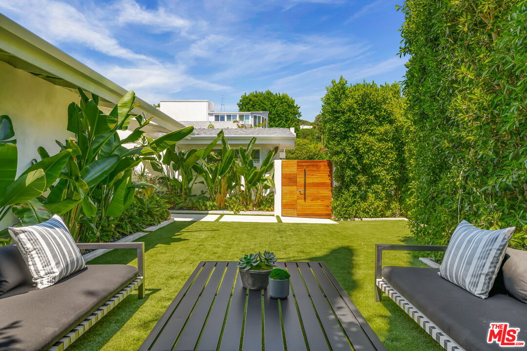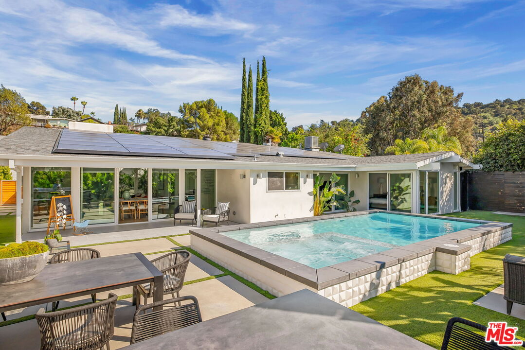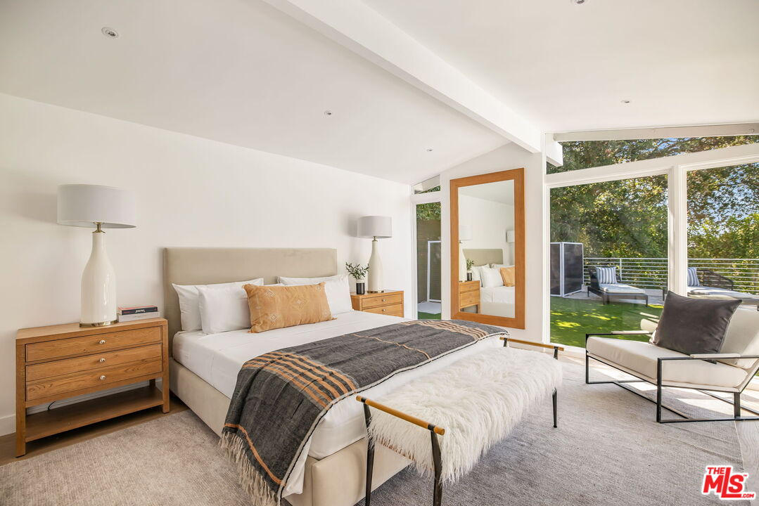 Renovated 1960s single-story Midcentury is epitome of southern California chic. Living room offers exposed beams & is anchored by stone fireplace & floor to ceiling windows. Kitchen counter tops & island w/ bar seating utilize Taj Mahal stone w/ waterfall edge & integrated sink. European white oak floors run throughout. But the real star is the saltwater pool, spa & Baja bench. Hybrid pool filtration & heater ensures you enjoy pool in no time & maintain perfect comfort. If outdoor cooking is your passion, kitchen offers bar seating for at least 8, BBQ, 2 refrigerators, pizza oven, gas burners & sink. And the front yard? Owner transformed it into a turf field, perfect for kids outdoor activities. Need more space? Detached garage is primed for ADU conversion. Compound is gated & hedged ensuring privacy. What's more, home is a Tesla lover's dream w/ 4 power walls & solar. Only minutes from premiere schools like Harvard Westlake, Campbell Hall, Carpenter Elementary plus upscale amenities like Equinox, Erewhon & Sushi Row.