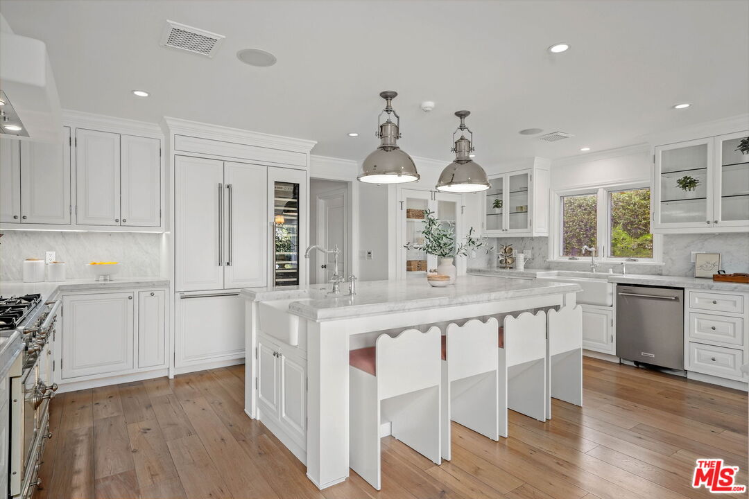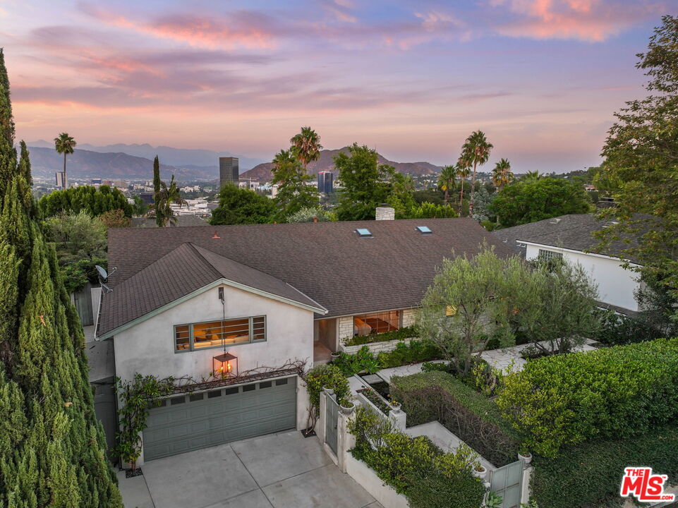 Nestled on a tranquil cul-de-sac in the scenic hills of Studio City, this exceptional trophy property offers unrivaled privacy and breathtaking vistas of the city and mountains. This exquisite single-story residence boasts four bedrooms and four bathrooms, gracefully set on an expansive 15,000+ sq. ft. flat lot adorned with rolling grassy lawns and meticulously manicured grounds. The interior is strikingly sophisticated, featuring a dramatic open floor plan enhanced by elegant white oak floors and expansive walls of glass that create a seamless connection between indoor and outdoor spaces. The entertainer's yard is a true oasis, complete with a sparkling pool, a barbecue area, built-in outdoor seating, a fire pit, and herb, citrus, and rose gardens. The gourmet kitchen is a culinary masterpiece, showcasing luxurious marble countertops, custom-milled cabinetry, a farmhouse sink, and top-of-the-line appliances, including a breathtaking La Cornue range. The bright primary suite opens to a private patio and is accompanied by a spa-like ensuite bathroom clad in marble, featuring a dual vanity, a steam shower, and a spacious walk-in closet. Surrounded by exquisitely landscaped grounds, including a gated front yard with a tranquil fountain and stately olive trees, this property is impeccably designed for even the most discerning occupant. Additional amenities include a two-car garage with ample driveway parking.