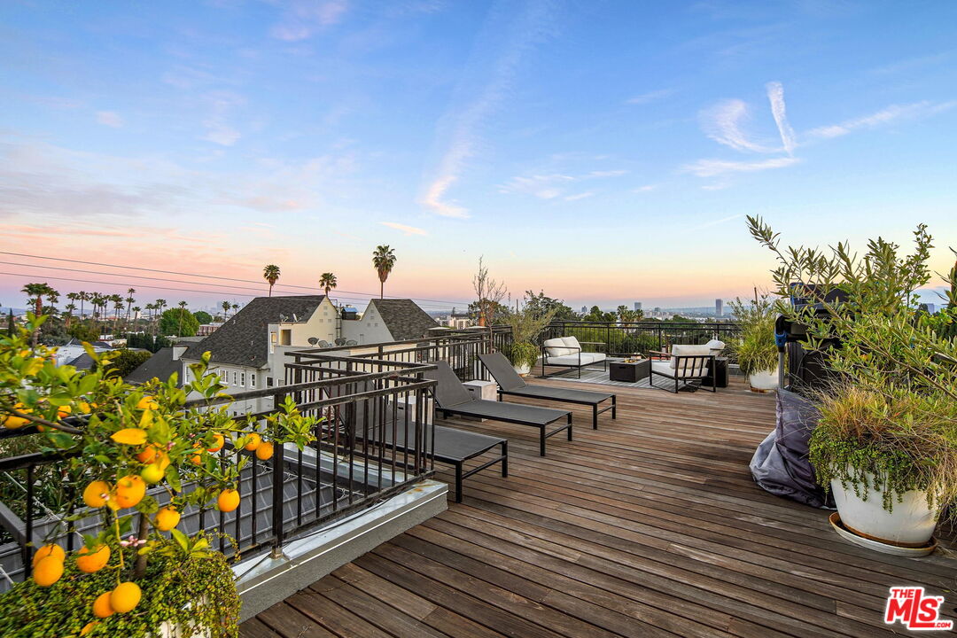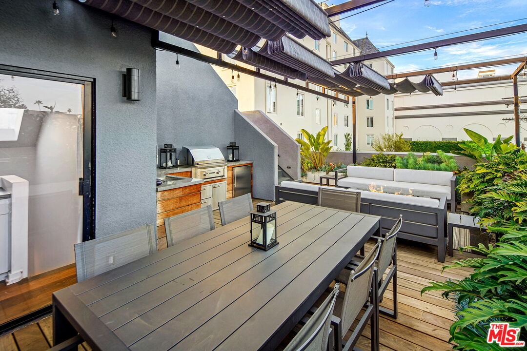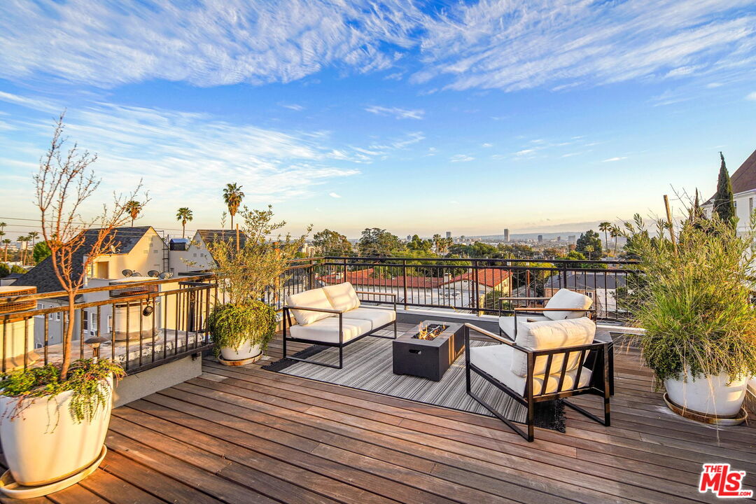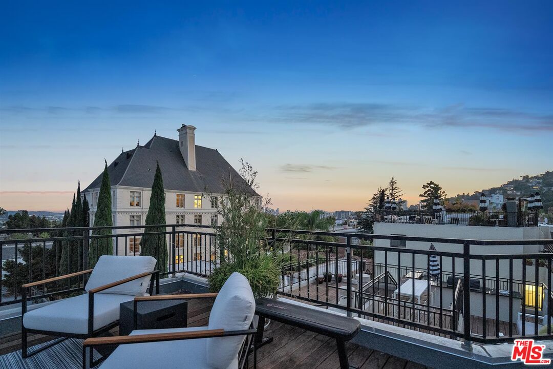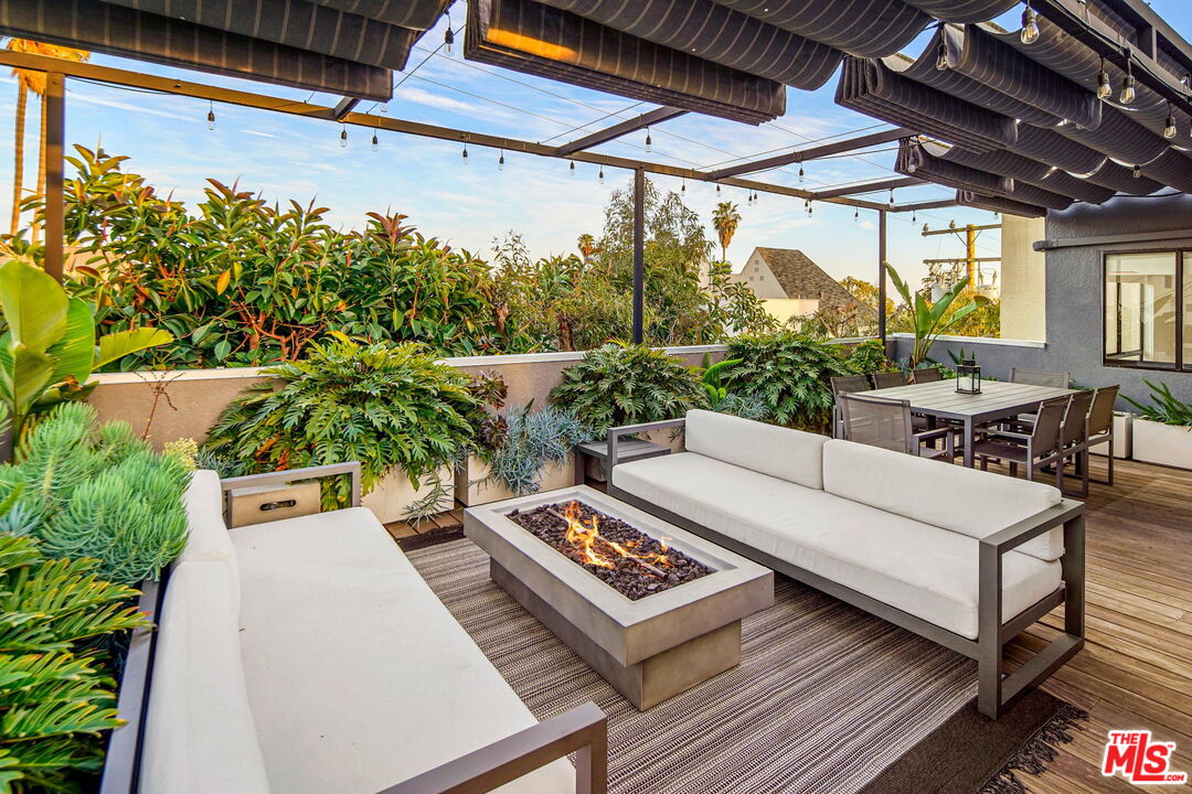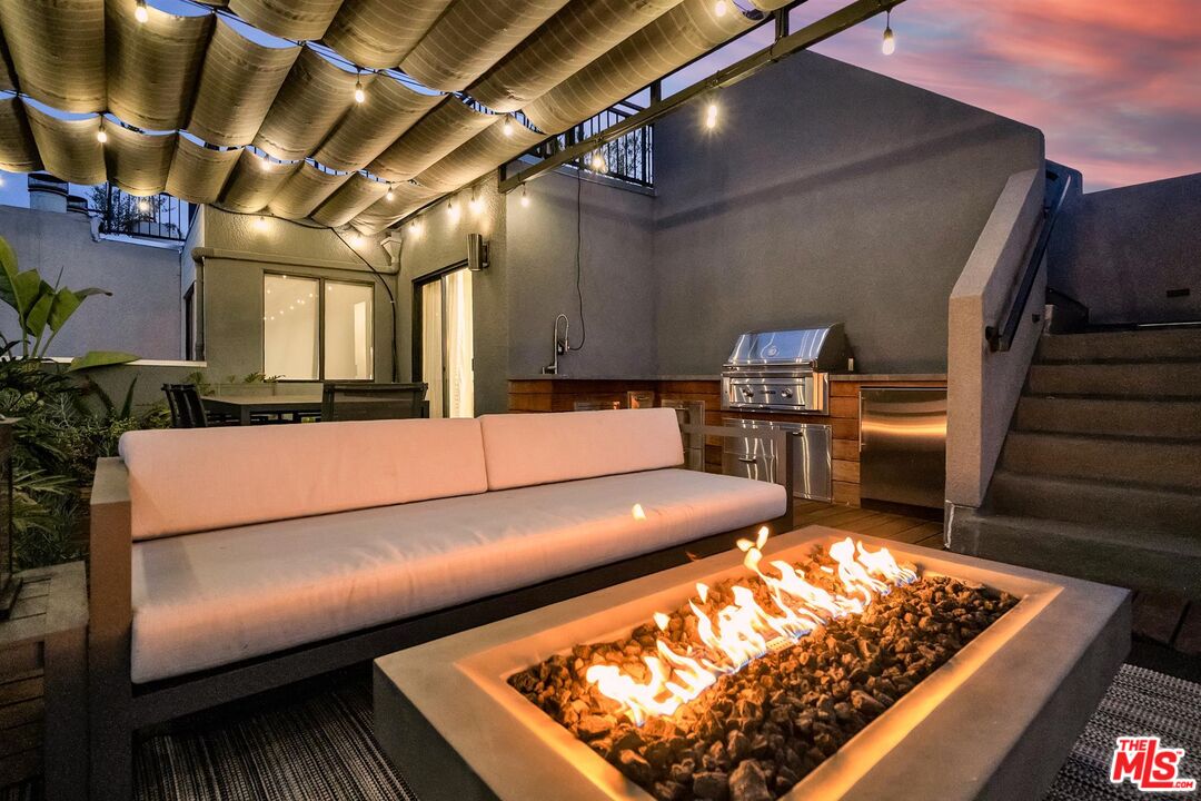 Tenant in place, no showings before September 24th. Recently featured in Architectural Digest, this stunning contemporary Penthouse is located in the heart of West Hollywood and is replete with breathtaking panoramic views sweeping from DTLA to the Hollywood Hills and the Pacific Ocean. Entertain or relax outdoors year-round with two spacious levels of private rooftop decks that feature Brazilian Ipe hardwood, two large fire pits, retractable awning, custom railings, and a fully-serviced outdoor kitchen with weather-treated quartz. This designer 3 bed and 3 bath home boasts unrivaled finishes such as hand-scraped plaster walls, wainscoting, crown molding with matching baseboards, electric roller shades, high ceilings that allow for an abundance of natural light, and a fireplace in the great room. The primary suite has a large and luxurious butterfly marble dual head shower and his and hers walk-in closets. Balcony with a second built-in barbecue area off the dining area. The upstairs third bedroom also features a walk-in closet and ensuite bathroom. Two side-by-side underground parking spots are included. Separate laundry closet.
